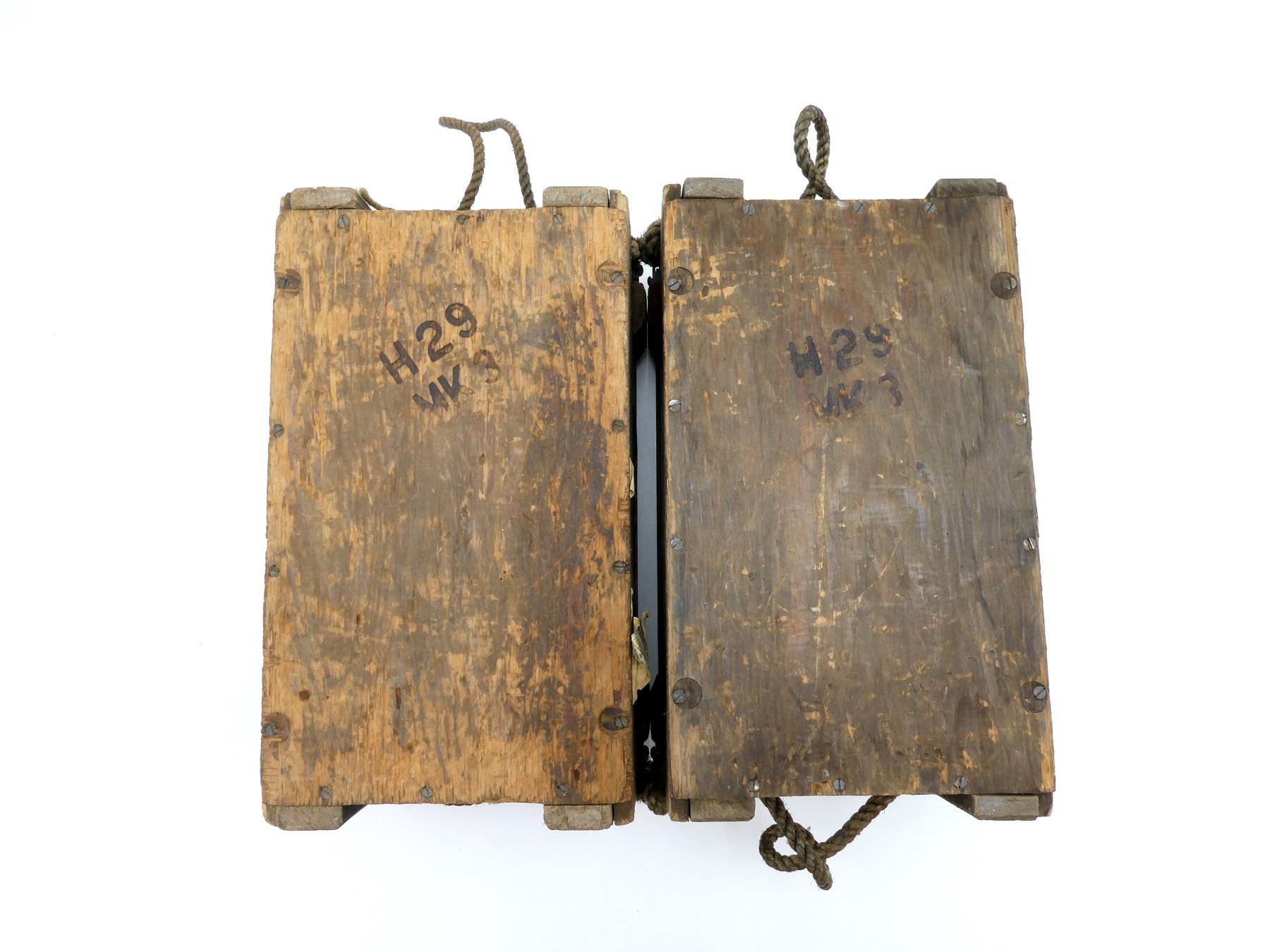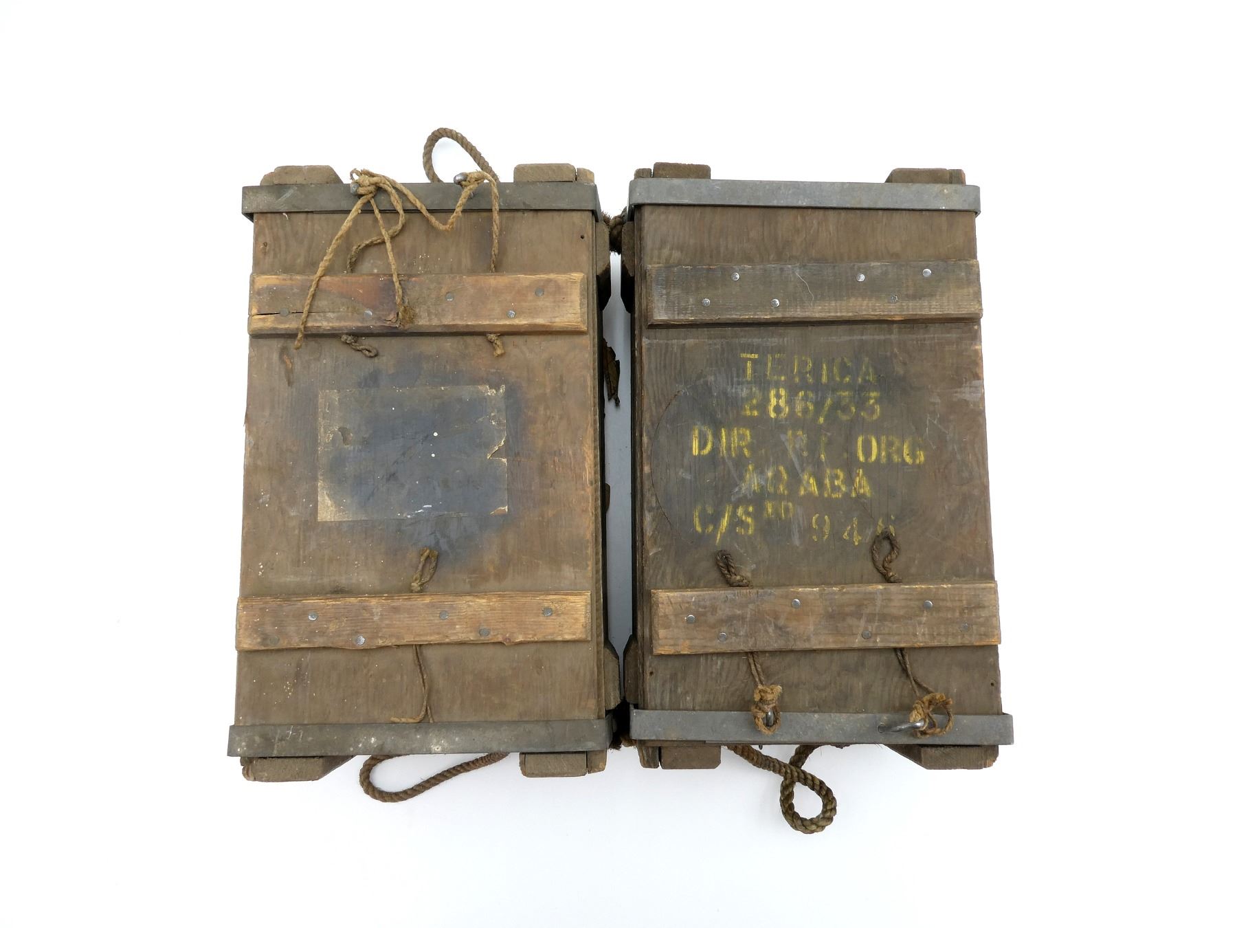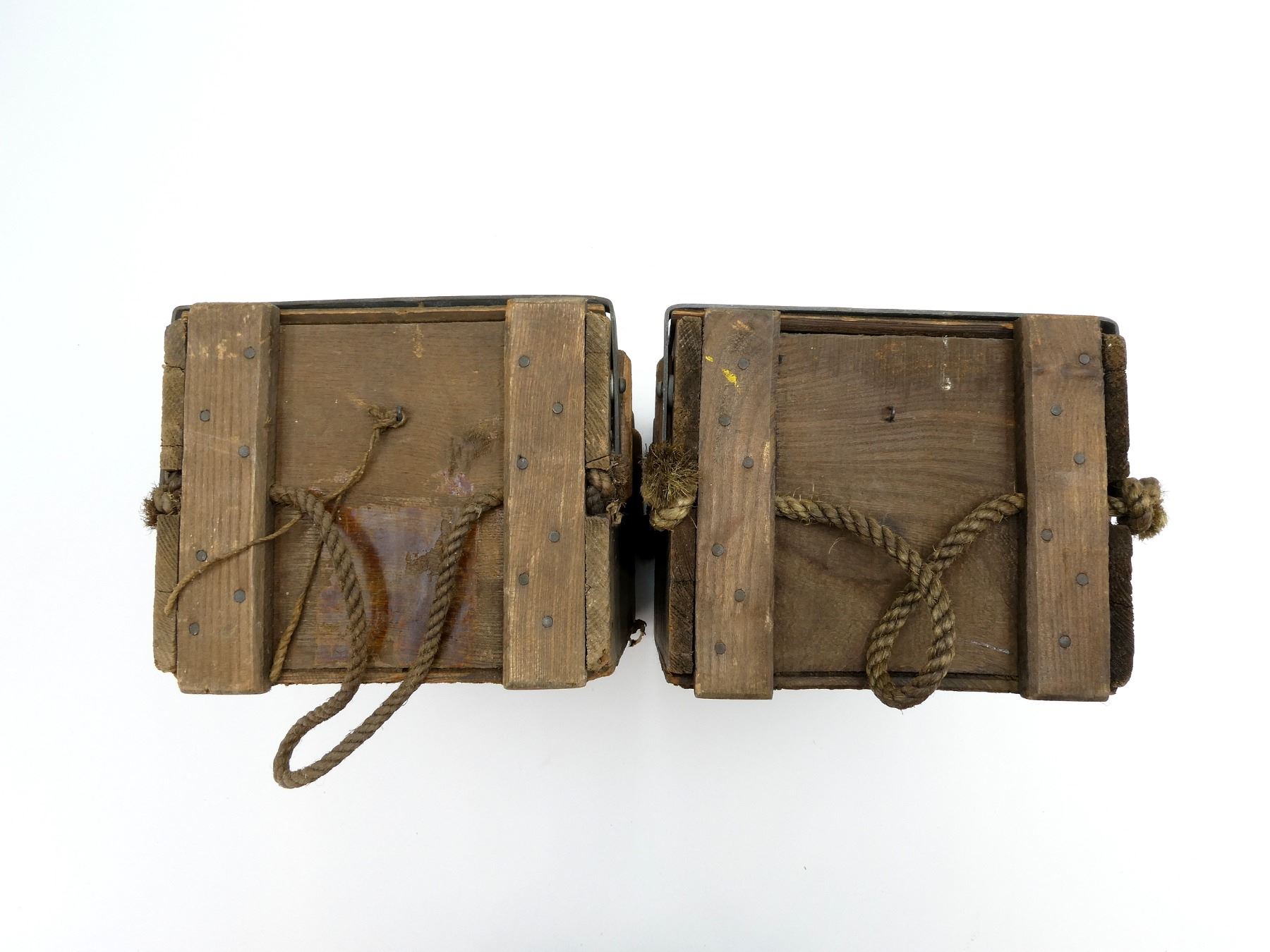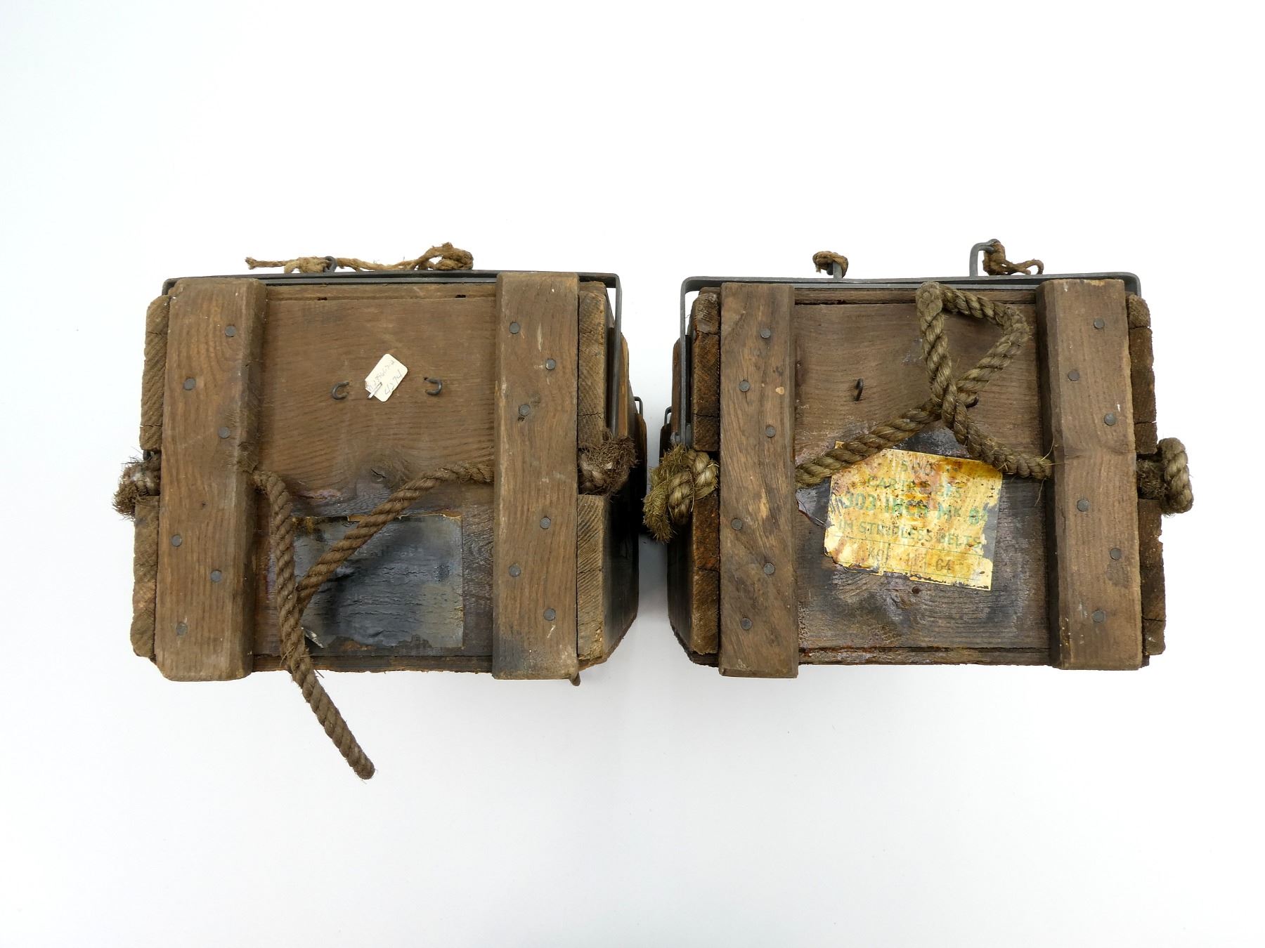 LOT INCLUDES: (2) BROWN PAINTED WOODEN AMMO CRATES WITH LIDS, MARKED: "500 303 MK8Z IN STRIPLESSBELTS", VARIOUS FAINT / UN-CLEAR MARKINGS / STICKERS, METAL HINGES / LATCHES, ROPE CARRY HANDLES, APPROX. 17" X 9.5" X 8.25". SEE PHOTOS.