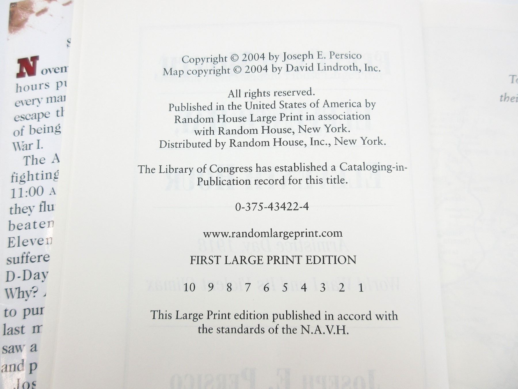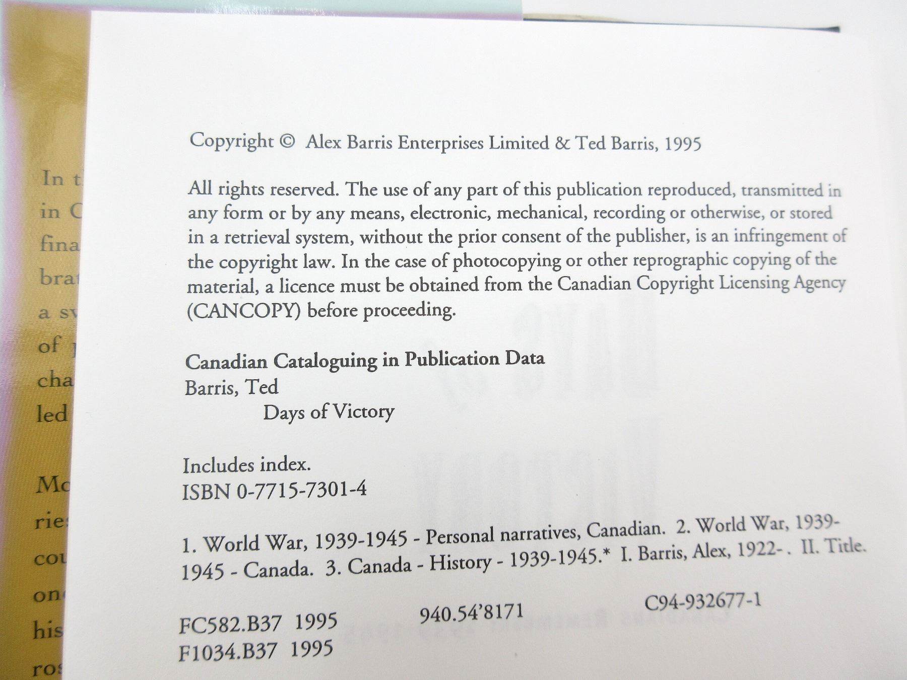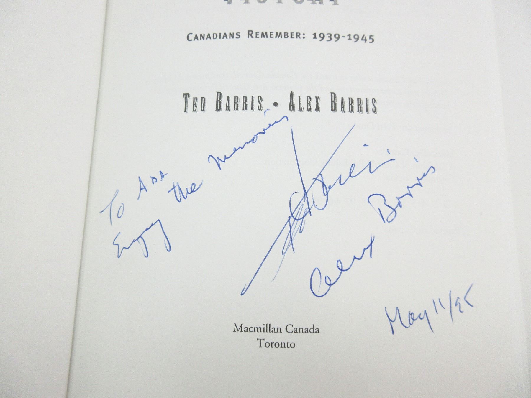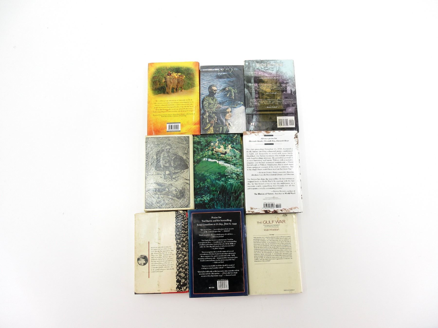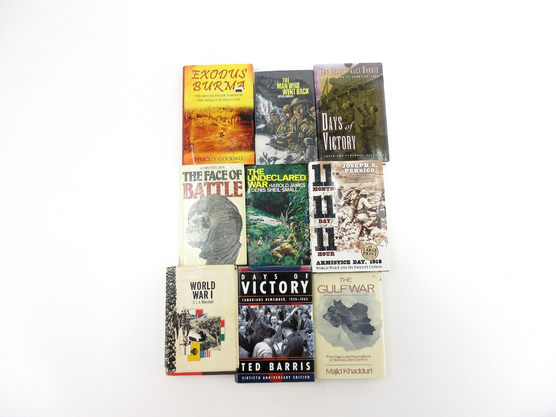 LOT INCLUDES; (1) "ELEVENTH MONTH ELEVENTH DAY ELEVENTH HOUR" BOOK BY JOSEPH E. PERSICO, HARD COVER WITH DUST COVER, ISBN: 0-375-43422-4, (1) "DAYS OF VICTORY CANADIANS REMEMBER: 1939-1945" BOOK BY TED BARRIS, 60TH ANNIVERSARY EDITION, INSCRIBED & SIGNED BY AUTHOR, HARD COVER WITH DUST COVER, ISBN: 0-88762-175-9, (1) "THE FACE OF BATTLE" BOOK BY JOHN KEEGAN, HARD COVER WITH DUST COVER, ISBN: 0-224-01232-0, (1) "WORLD WAR I" BOOK BY S.L.A. MARSHALL, HARD COVER WITH DUST COVER, COPYRIGHT 1964, (1) "EXODUS BURMA" BOOK BY FELICITY GOODALL, SIGNED BY AUTHOR, HARD COVER WITH DUST COVER, ISBN: 978-0-7524-6092-5, (1) "DAYS OF VICTORY CANADIANS REMEMBER: 1939-1945" BOOK BY TED BARRIS & ALEX BARRIS, INSCRIBED & SIGNED BY AUTHORS, HARD COVER WITH DUST COVER, ISBN: 0-7715-7301-4, (1) "THE MAN WHO WENT BACK" BOOK BY LUCIEN DUMAIS, HARD COVER WITH DUST COVER, ISBN: 085052-169-6, (1) "THE UNDECLARED WAR" BOOK BY HAROLD JAMES & DENIS SHEIL-SMALL, HARD COVER WITH DUST COVER, ISBN: 0-85052-080-0 & (1) "THE GULF WAR" BOOK BY MAJID KHADDURI, HARD COVER WITH DUST COVER, COPYRIGHT 1988. SEE PHOTOS.