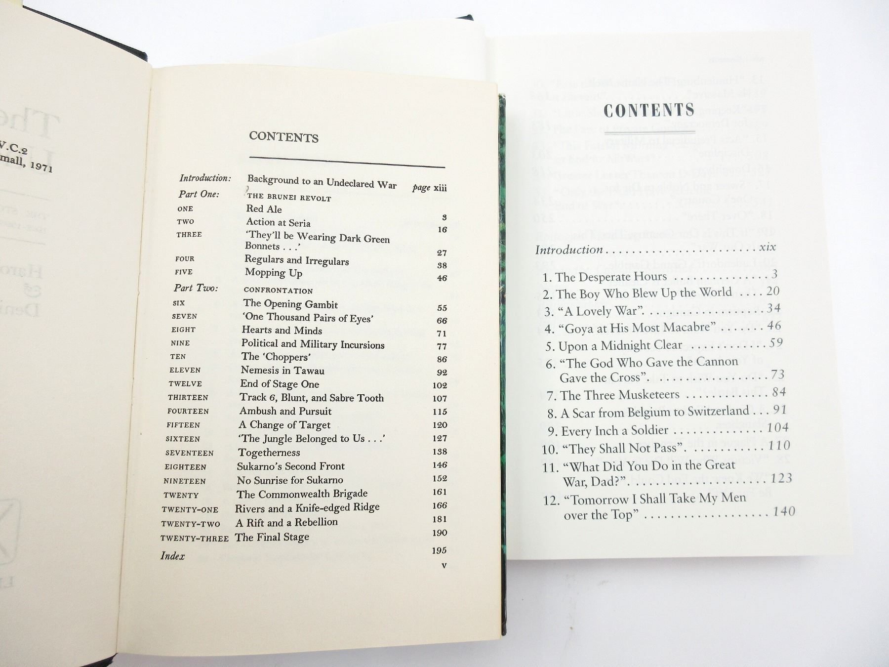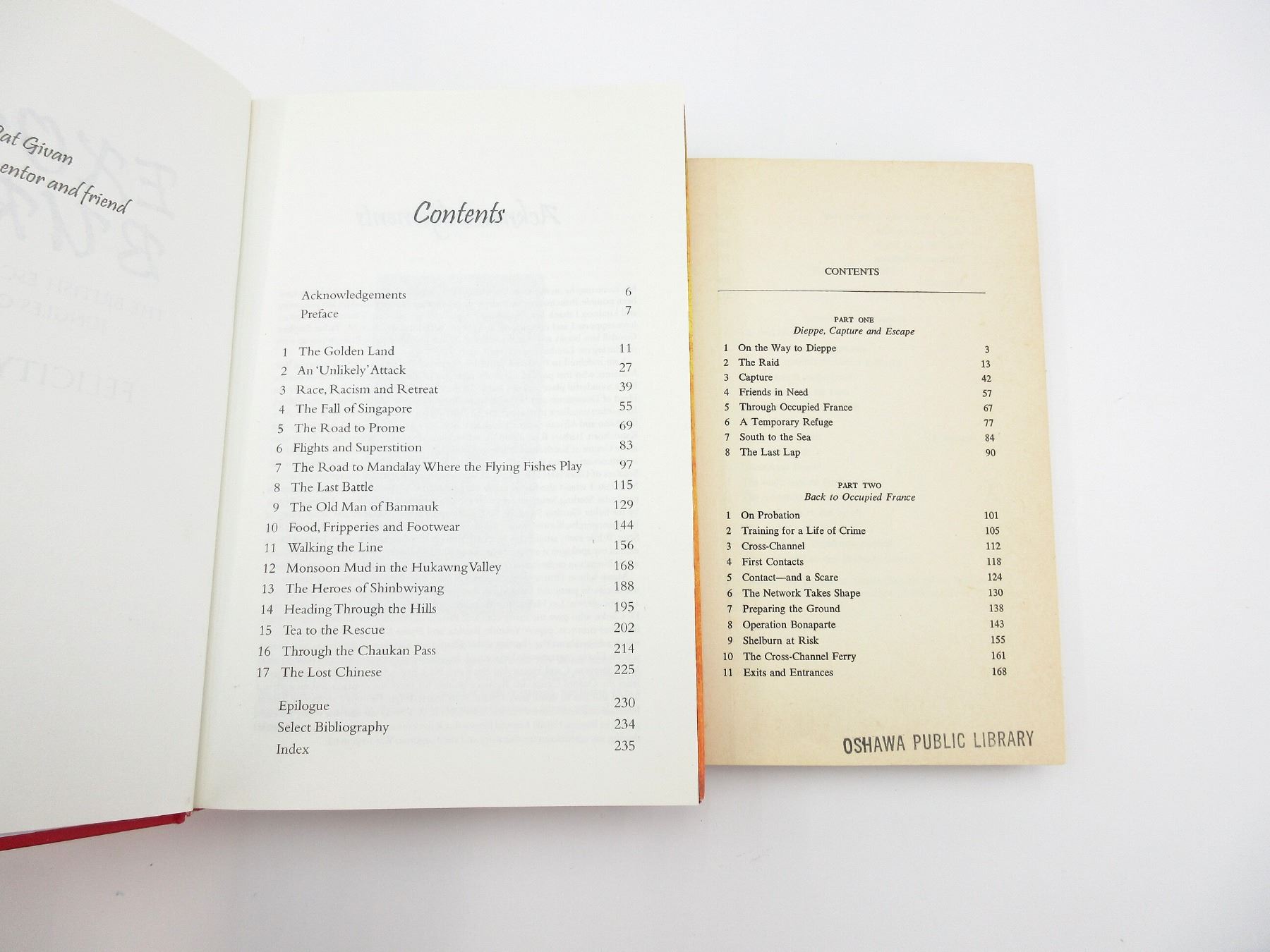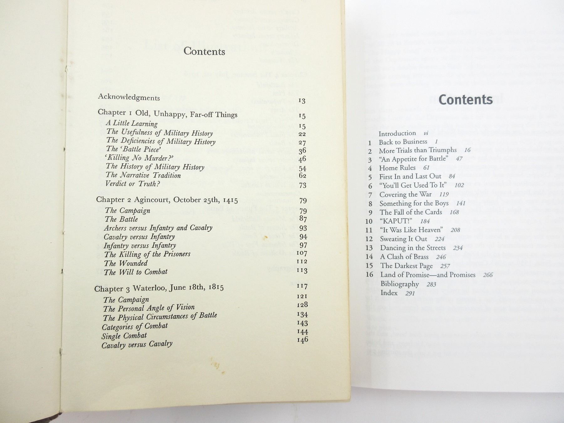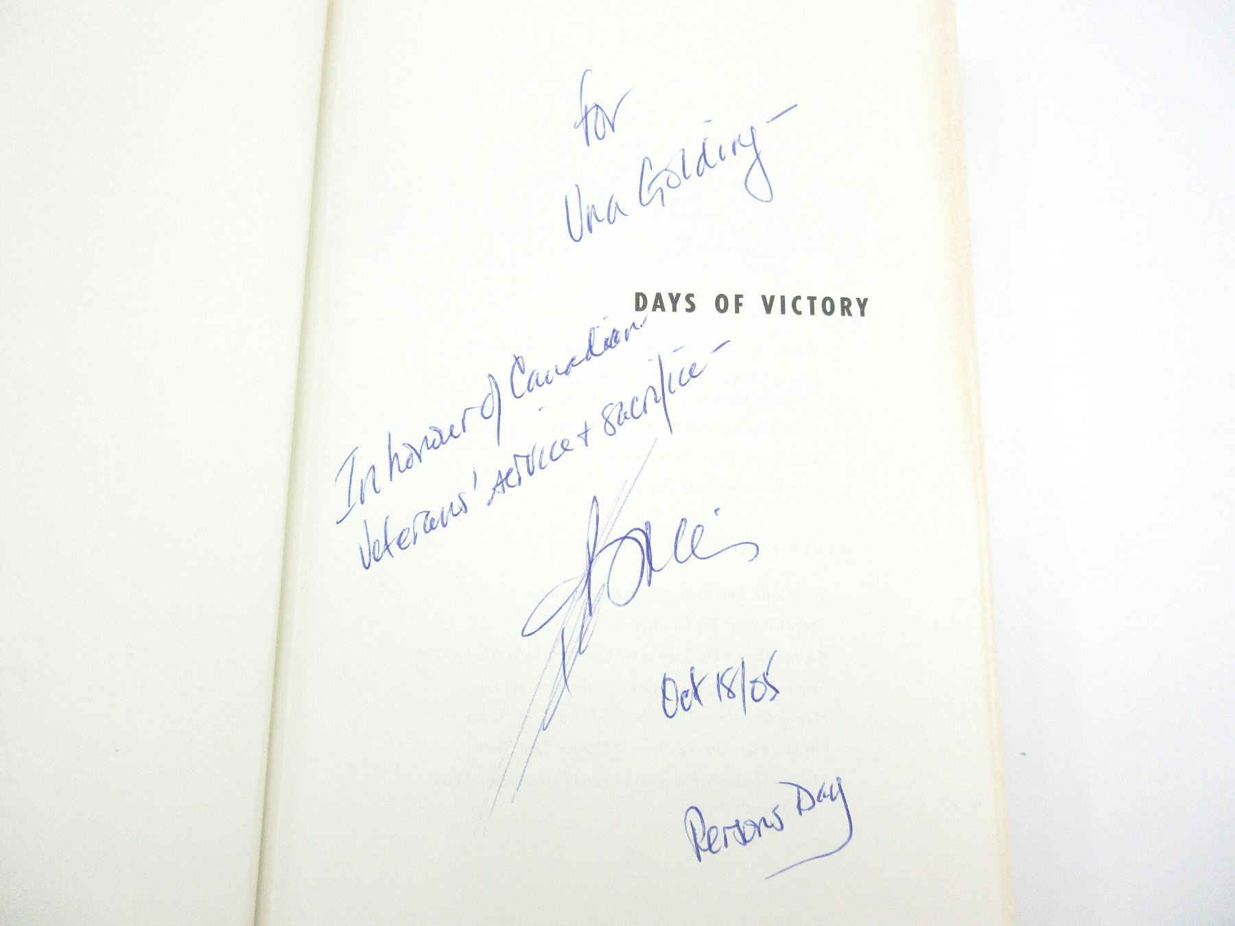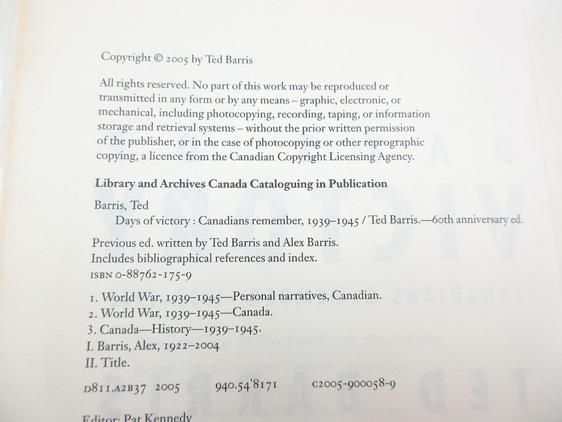 LOT INCLUDES; (1) "ELEVENTH MONTH ELEVENTH DAY ELEVENTH HOUR" BOOK BY JOSEPH E. PERSICO, HARD COVER WITH DUST COVER, ISBN: 0-375-43422-4, (1) "DAYS OF VICTORY CANADIANS REMEMBER: 1939-1945" BOOK BY TED BARRIS, 60TH ANNIVERSARY EDITION, INSCRIBED & SIGNED BY AUTHOR, HARD COVER WITH DUST COVER, ISBN: 0-88762-175-9, (1) "THE FACE OF BATTLE" BOOK BY JOHN KEEGAN, HARD COVER WITH DUST COVER, ISBN: 0-224-01232-0, (1) "WORLD WAR I" BOOK BY S.L.A. MARSHALL, HARD COVER WITH DUST COVER, COPYRIGHT 1964, (1) "EXODUS BURMA" BOOK BY FELICITY GOODALL, SIGNED BY AUTHOR, HARD COVER WITH DUST COVER, ISBN: 978-0-7524-6092-5, (1) "DAYS OF VICTORY CANADIANS REMEMBER: 1939-1945" BOOK BY TED BARRIS & ALEX BARRIS, INSCRIBED & SIGNED BY AUTHORS, HARD COVER WITH DUST COVER, ISBN: 0-7715-7301-4, (1) "THE MAN WHO WENT BACK" BOOK BY LUCIEN DUMAIS, HARD COVER WITH DUST COVER, ISBN: 085052-169-6, (1) "THE UNDECLARED WAR" BOOK BY HAROLD JAMES & DENIS SHEIL-SMALL, HARD COVER WITH DUST COVER, ISBN: 0-85052-080-0 & (1) "THE GULF WAR" BOOK BY MAJID KHADDURI, HARD COVER WITH DUST COVER, COPYRIGHT 1988. SEE PHOTOS.