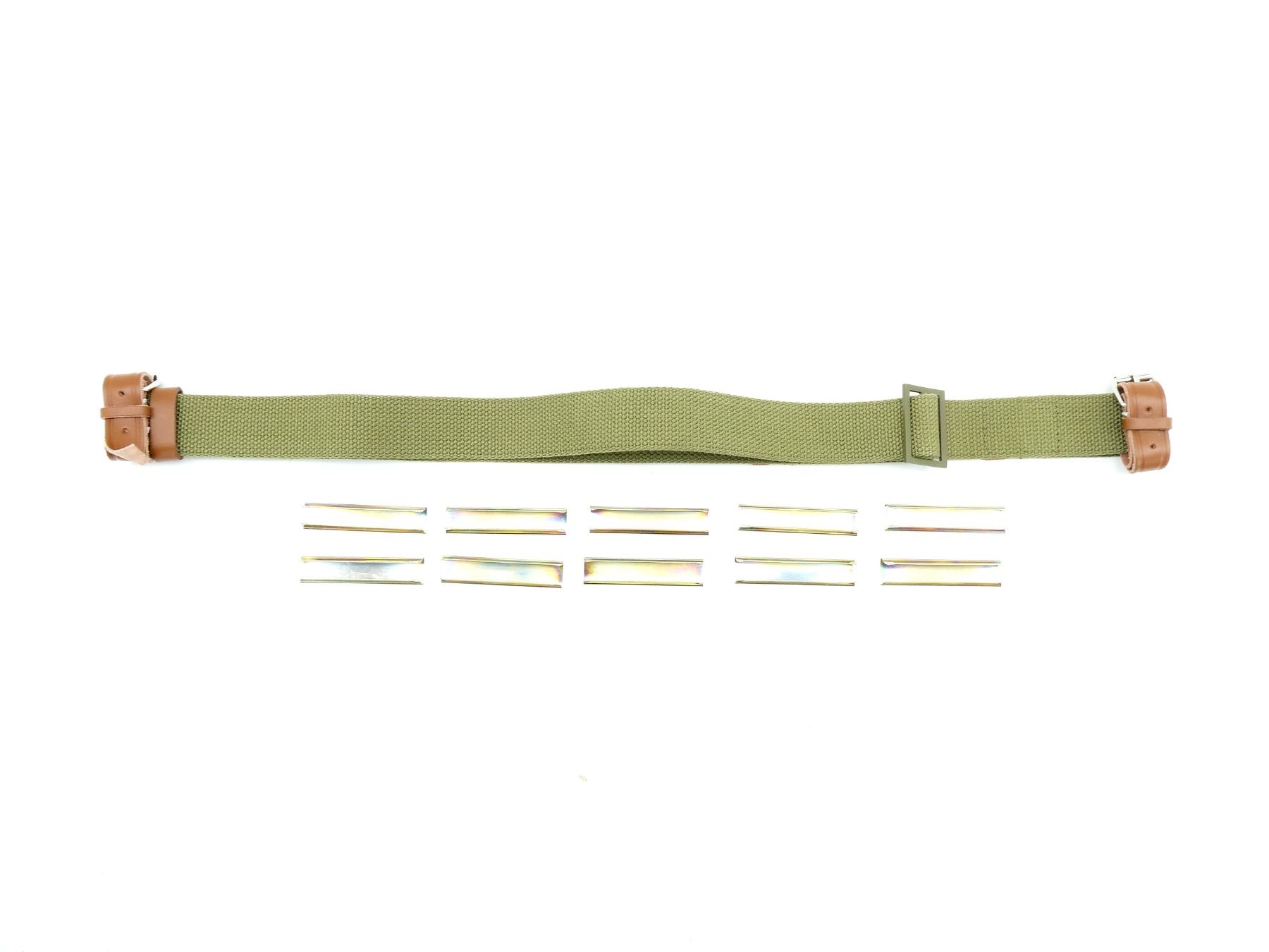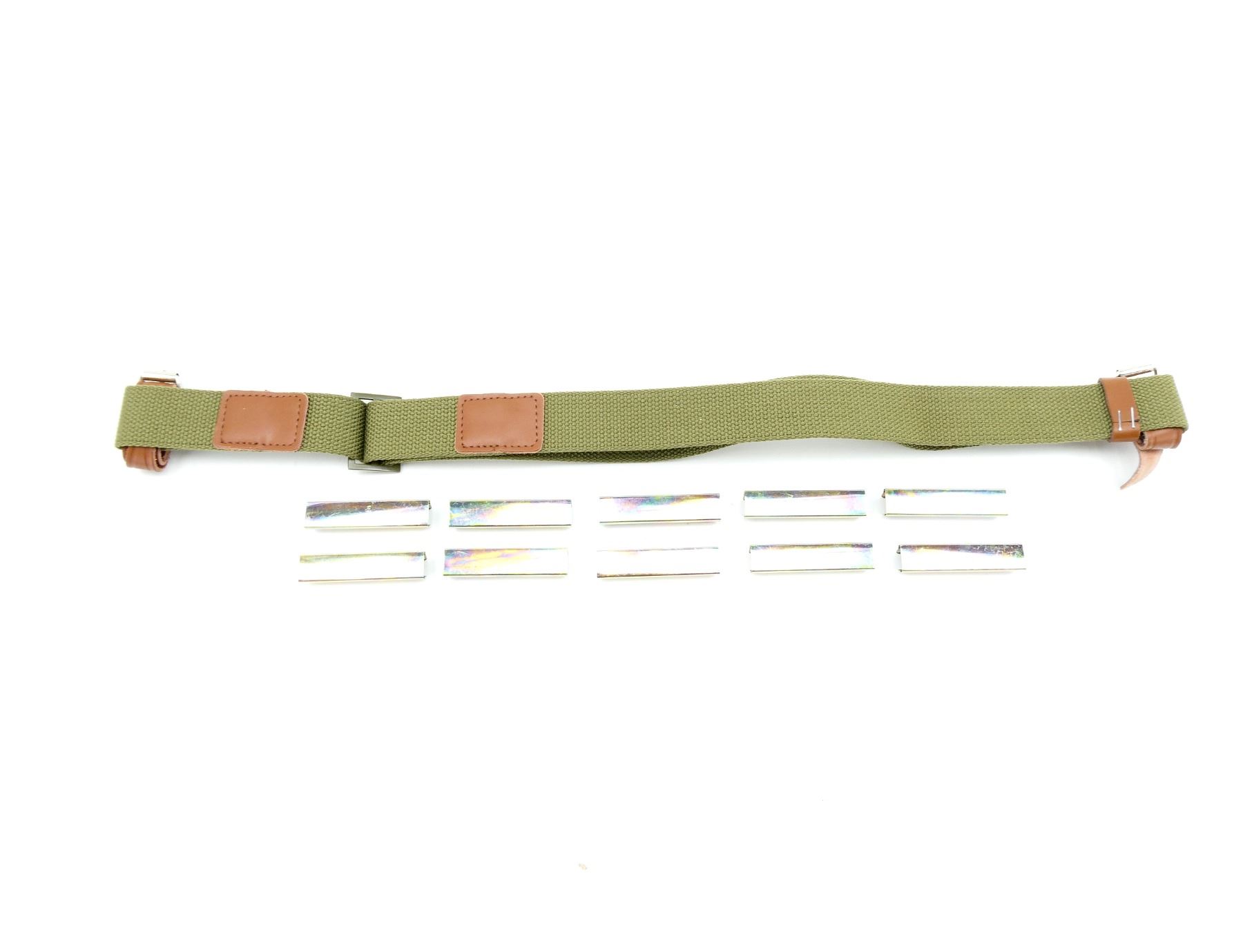 LOT INCLUDES; (1) NEW MANUFACTURE MOSIN NAGANT SLING, NO VISIBLE MARKINGS, OAL APPROX. 42", ADJUSTABLE & (10) REPRODUCTION MOSIN NAGANT STRIPPER CLIPS, FITS M38, M44 & M91/30 RIFLES, 7.62X54R 5-RND, NO VISIBLE MARKINGS. SEE PHOTOS.