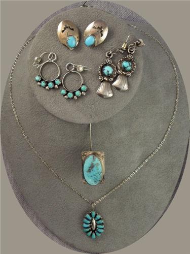 GROUP OF STERLING SILVER NATIVE AMERICAN JEWELRY INCLUDING SIGNED TURQUOISE PENDANT, SIGNED TURQUOISE STICK PIN, AND THREE (3) ASSORTED PAIRS OF TURQUOISE EARRINGS. 29.7 GRAMS.