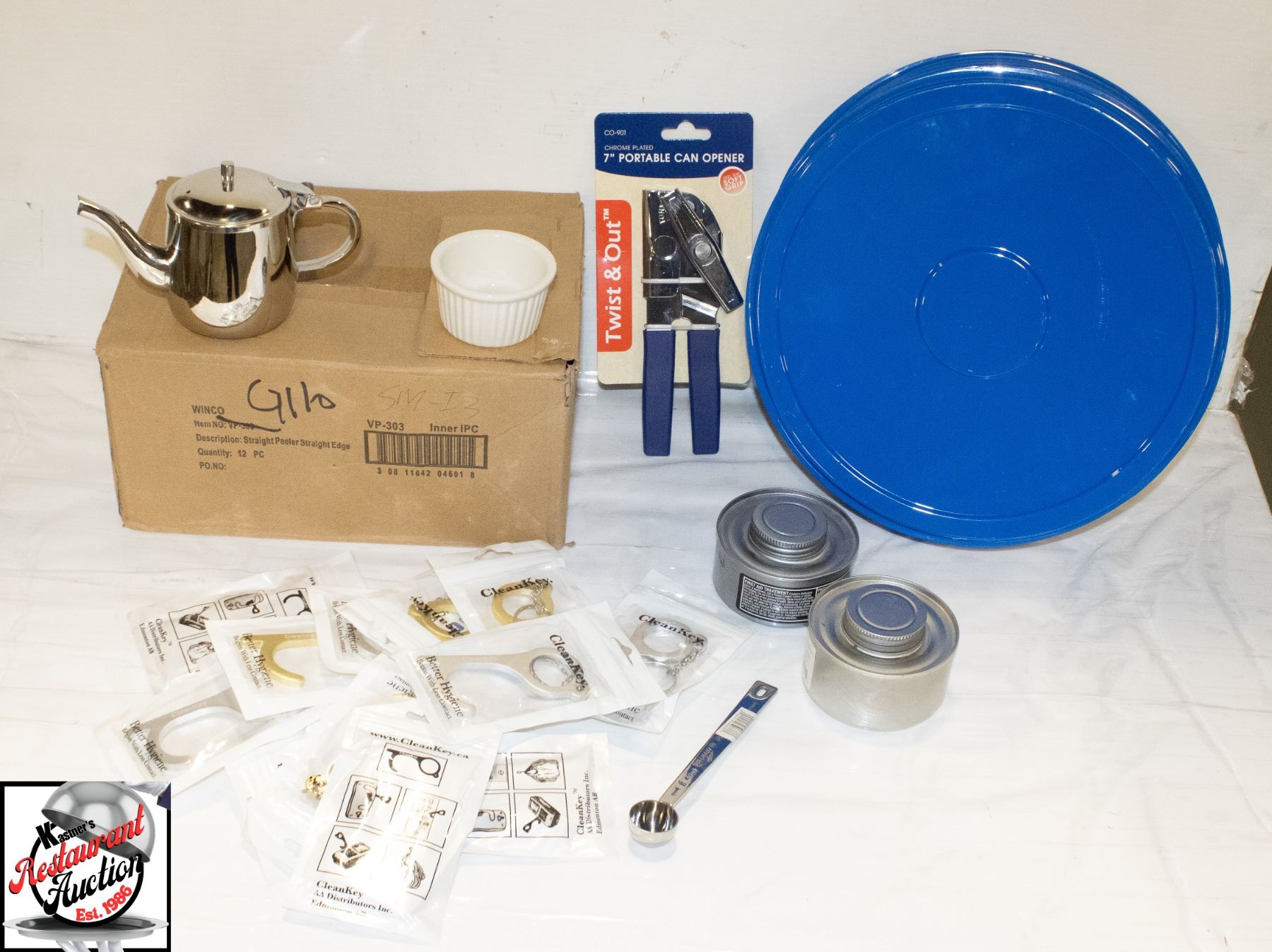 CLEAN KEYS, CHAFER FUEL, RAMEKINS, S/S TEA POTS, PAIL LIDS, CAN OPENER, ** SHIPPING IS NOT AVAILABLE ON THIS LOT **