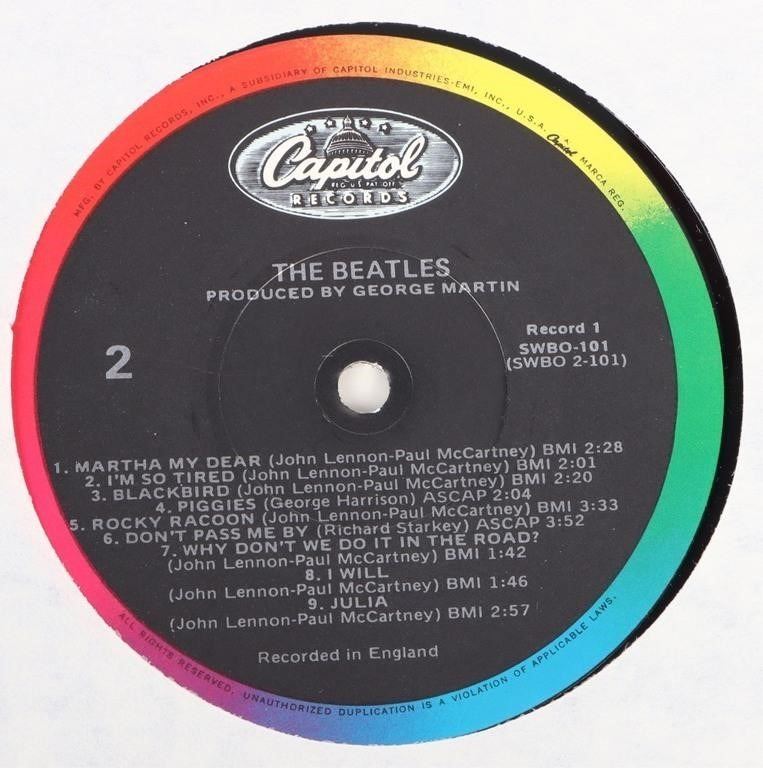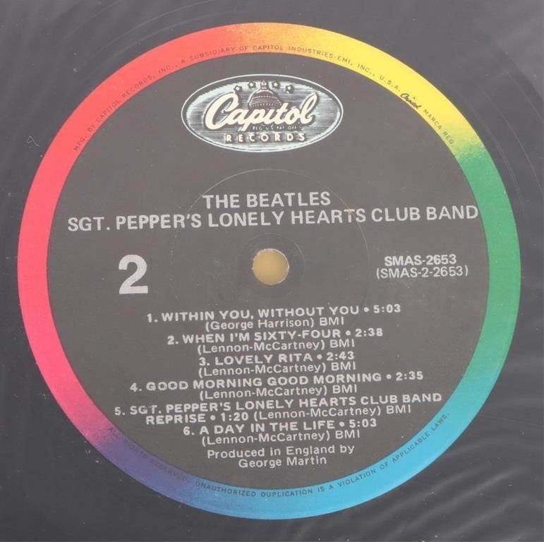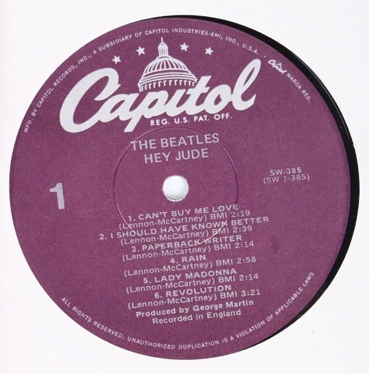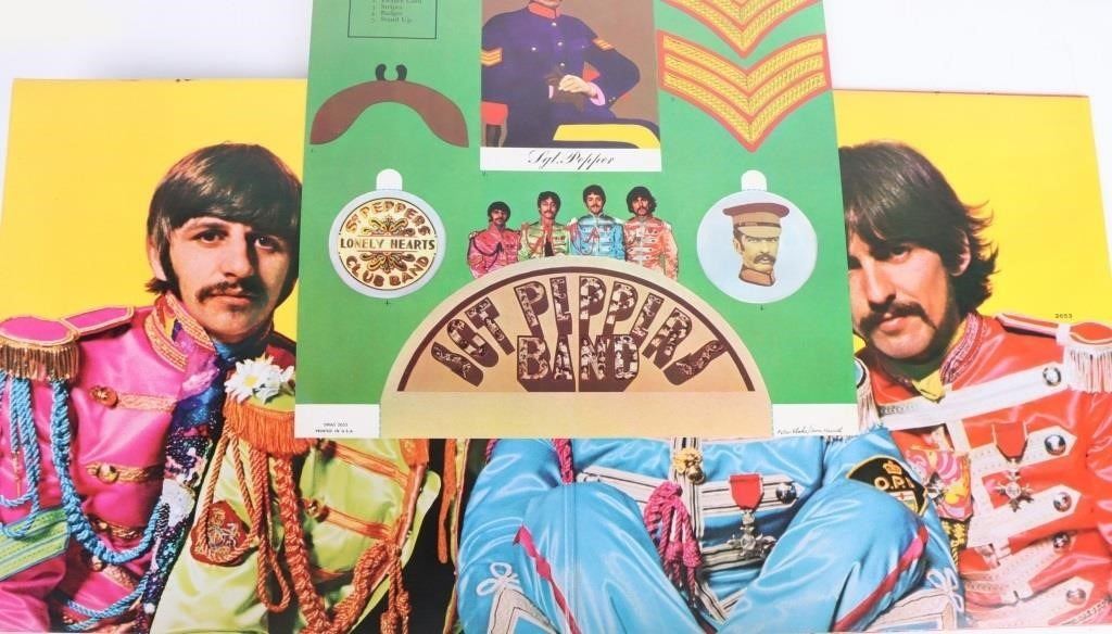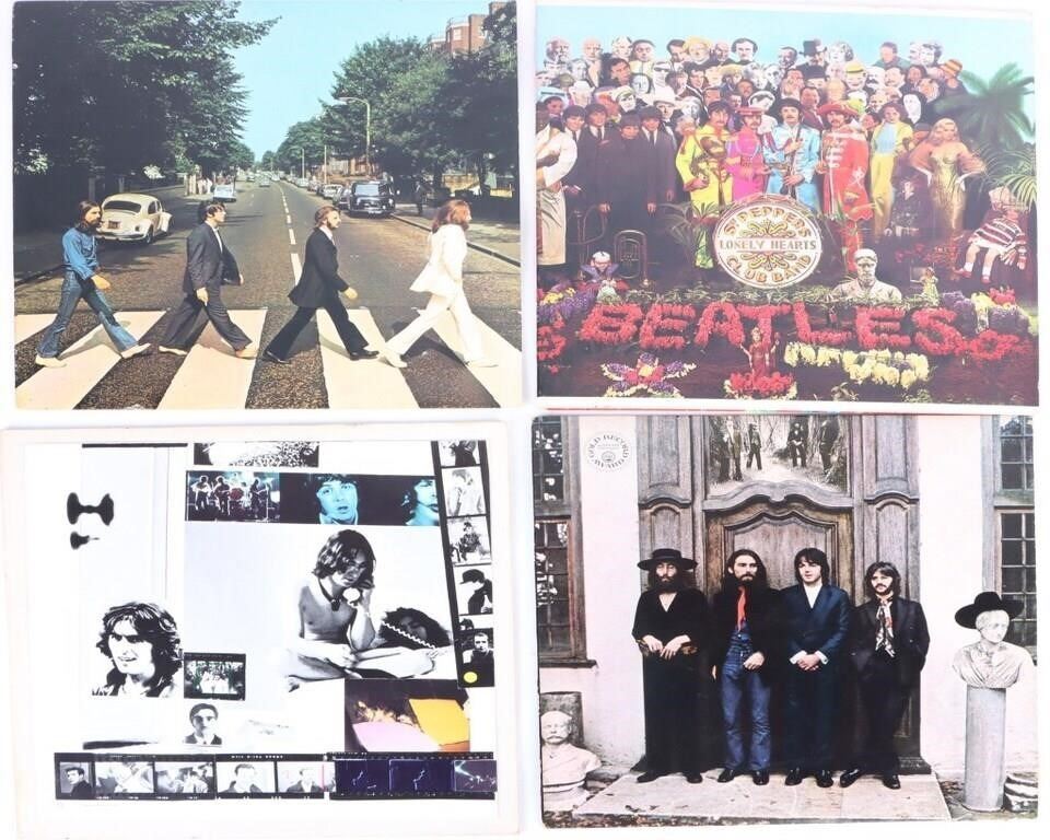 Assorted original Beatles Record Vinyl Albums to include: one SW-385 Beatles Hey Jude Vinyl Record Album, one SMAS 2653 Sgt. Pepper's Lonely Hearts Beatles vinyl record album, one SO-383 Abbey Road Beatles vinyl record albumn, and one SWBO-101 Beatles White vinyl 2 record album.
