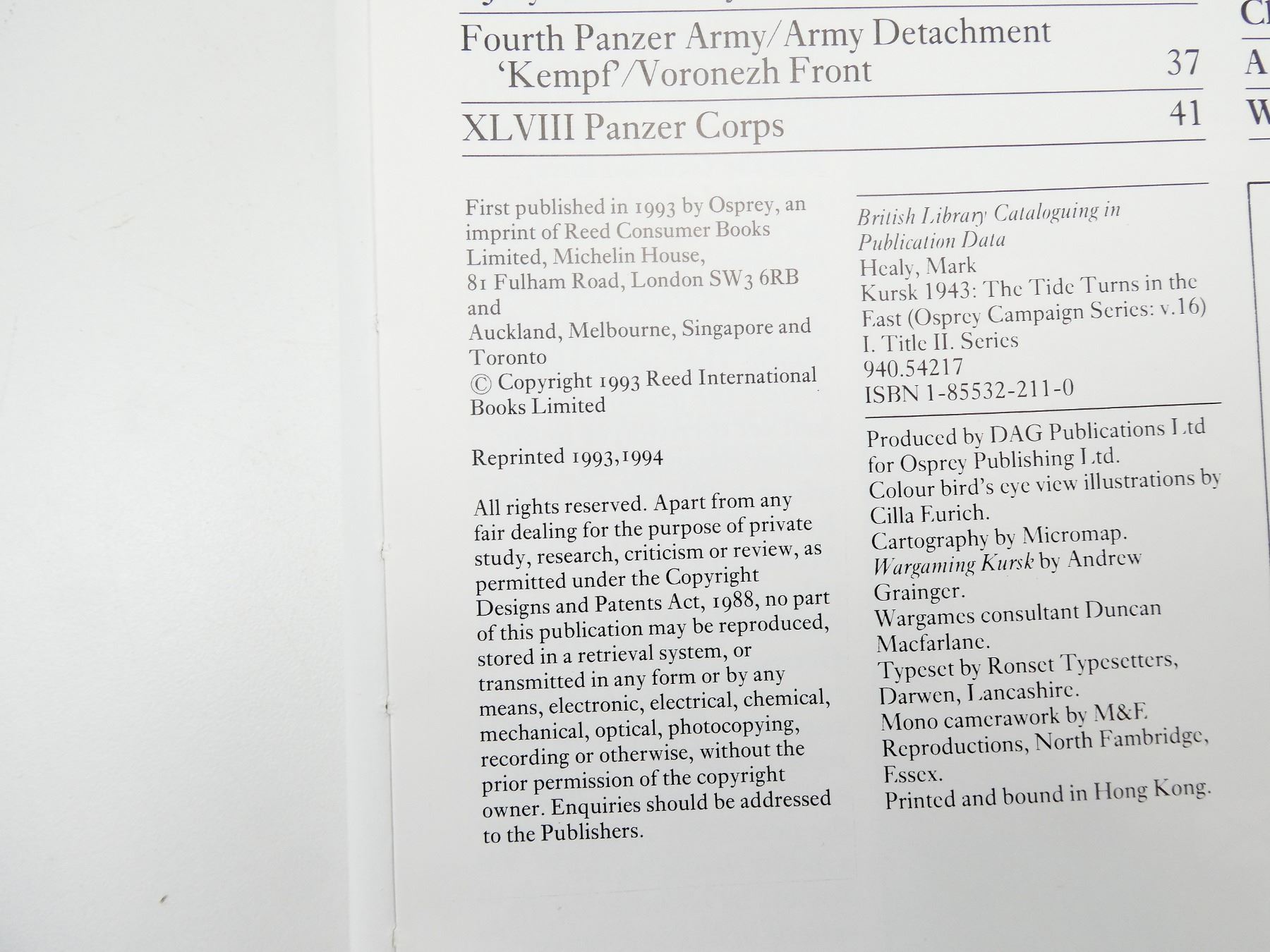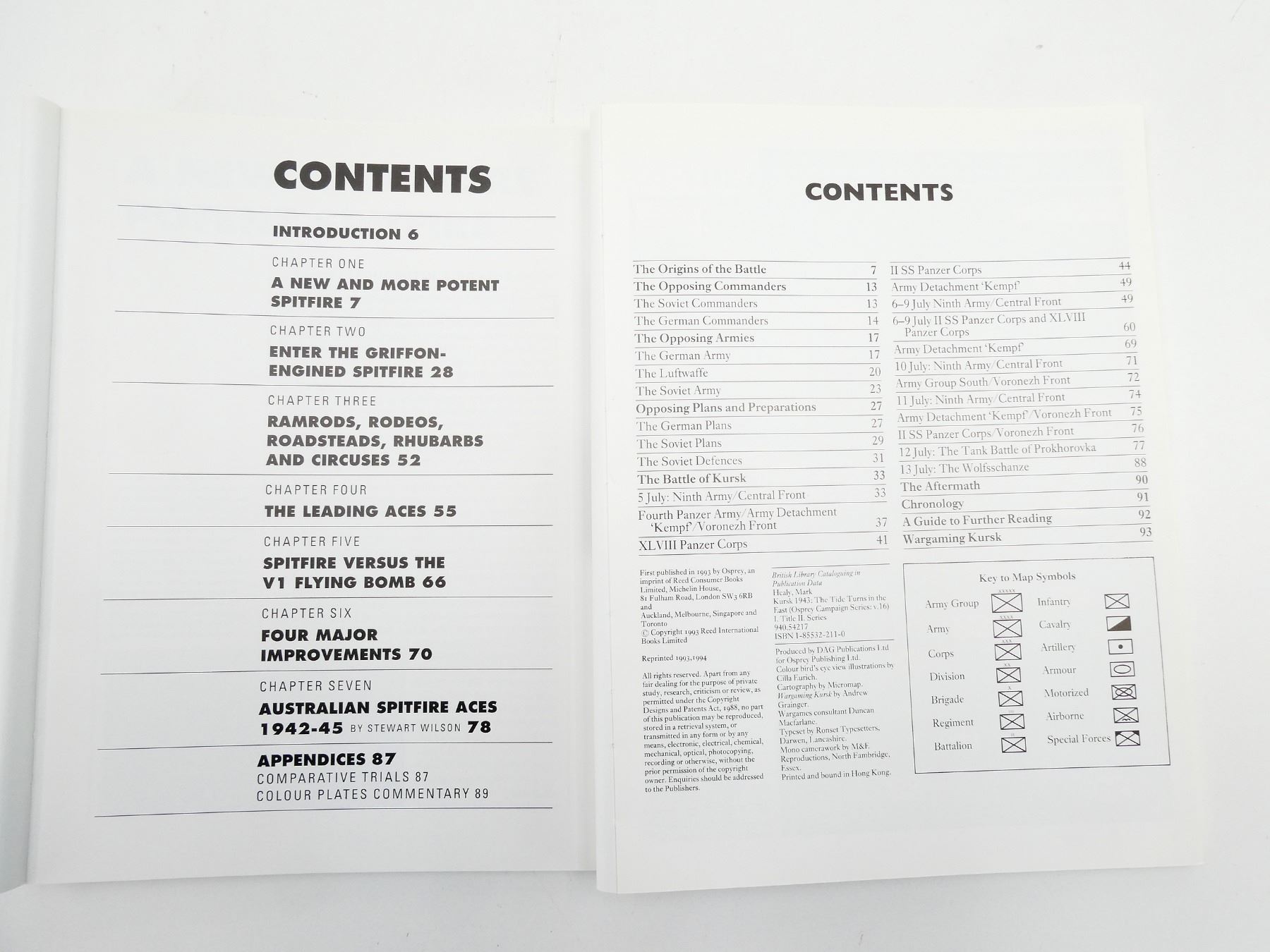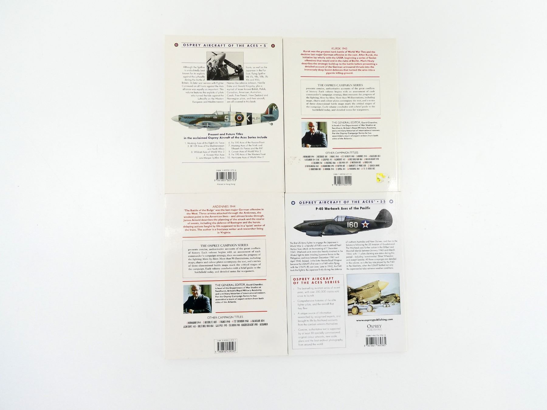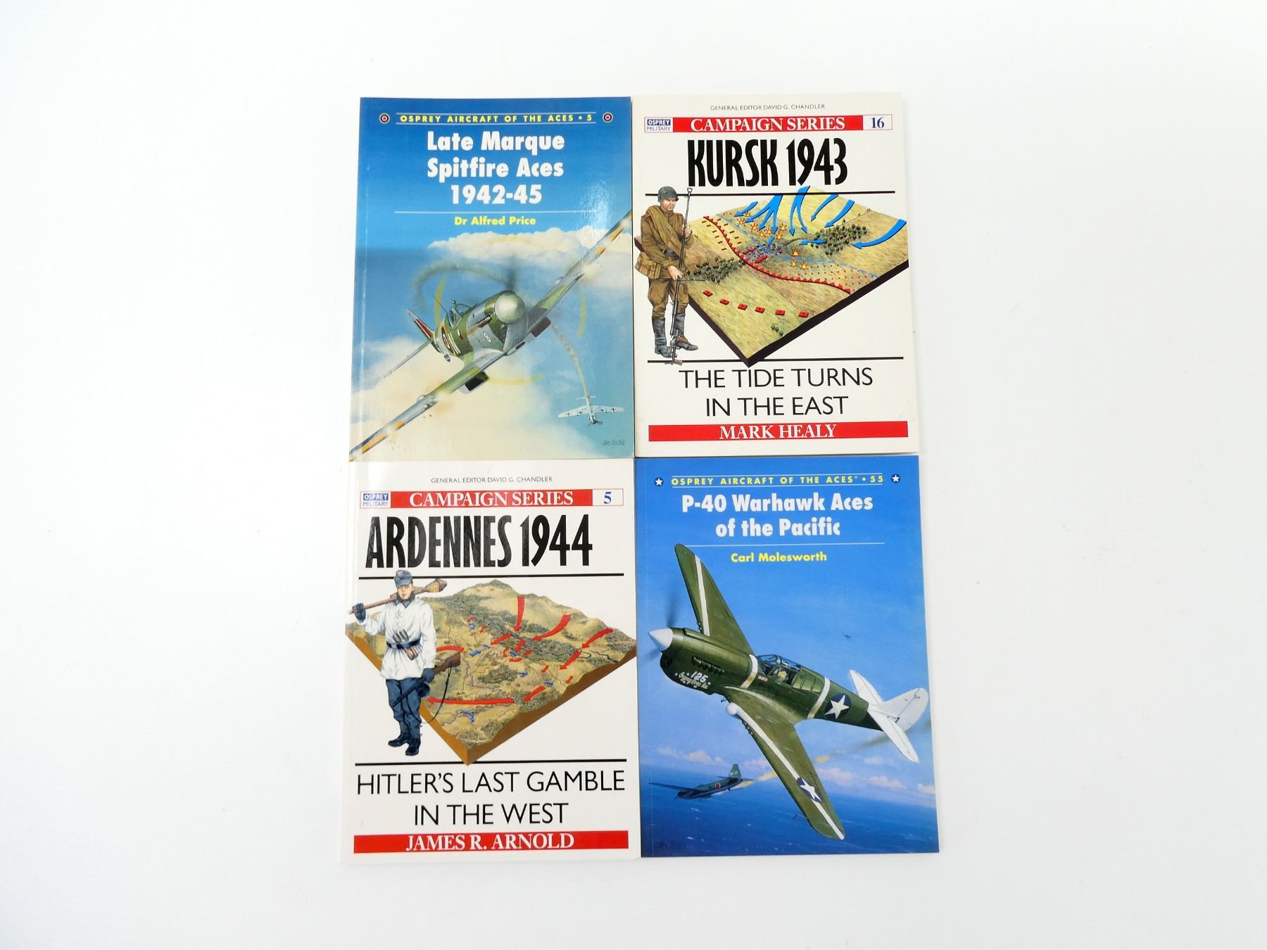 SOFT COVERS, SERIES NOT COMPLETE / SOME ISSUES MISSING, LOT INCLUDES; (1) "OSPREY AIRCRAFT OF THE ACES - 5, LATE MARQUE SPITFIRE ACES 1942-1945" BOOK BY ALFRED PRICE, ISBN: 1-85532-575-6, (1) "OSPREY AIRCRAFT OF THE ACES - 55, P-40 WARHAWK ACES OF THE PACIFIC" BOOK BY CARL MOLESWORTH, ISBN: 1-84176-536-8, (1) "OSPREY MILITARY CAMPAIGN SERIES 5, ARDENNES 1944, HITLER'S LAST GAMBLE IN THE WEST" BOOK BY JAMES R. ARNOLD, ISBN: 0-85045-959-1 & (1) "OSPREY MILITARY CAMPAIGN SERIES 16, KURSK 1943, THE TIDE TURNS IN THE EAST" BOOK BY MARK HEALY, ISBN: 1-85532-211-0. SEE PHOTOS.