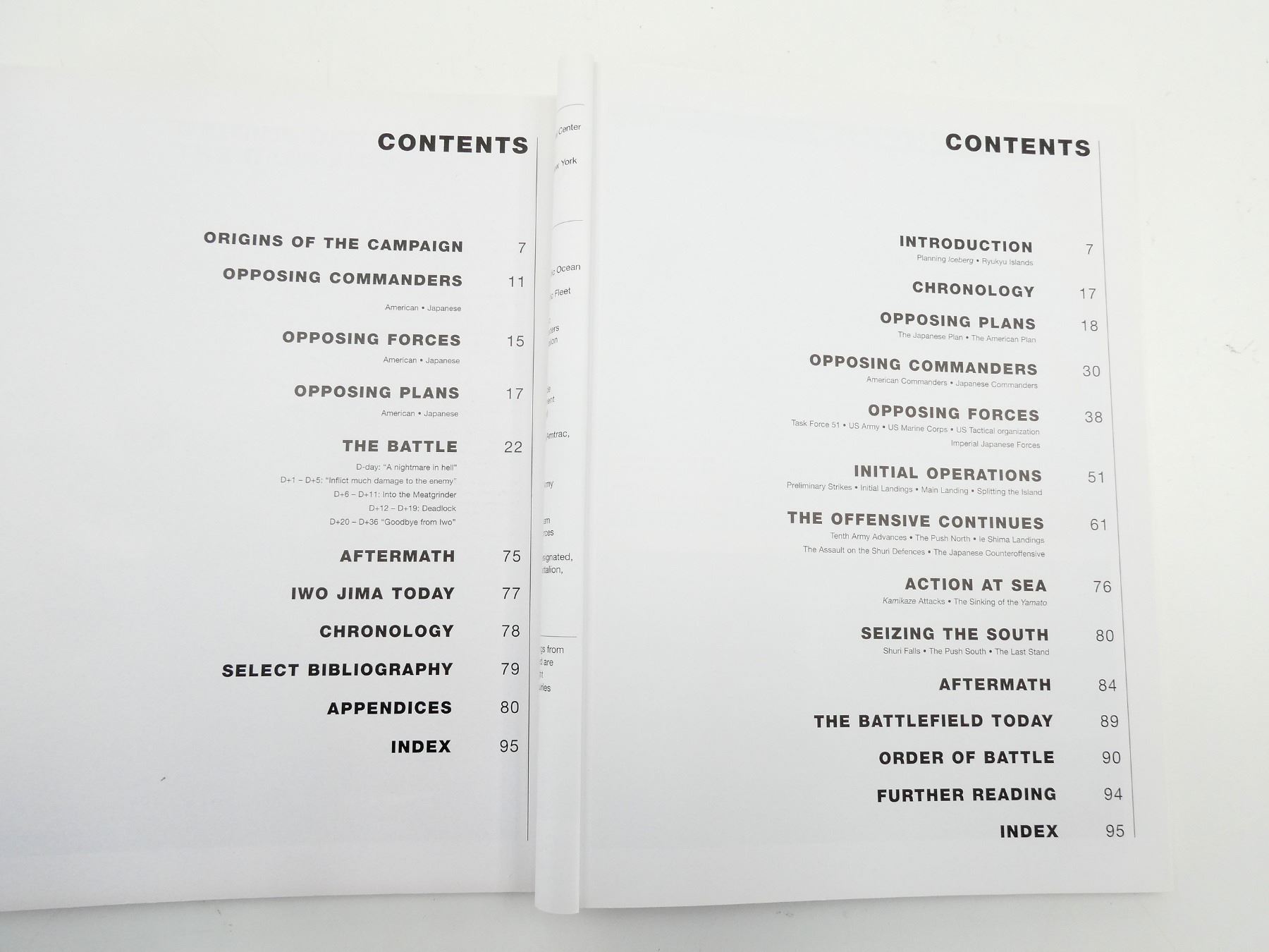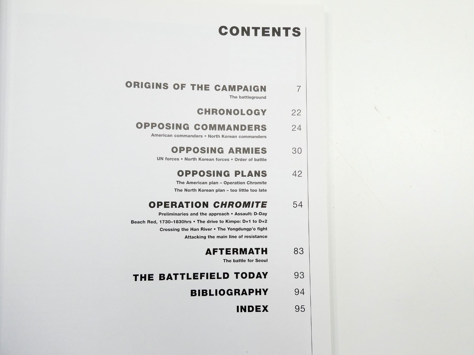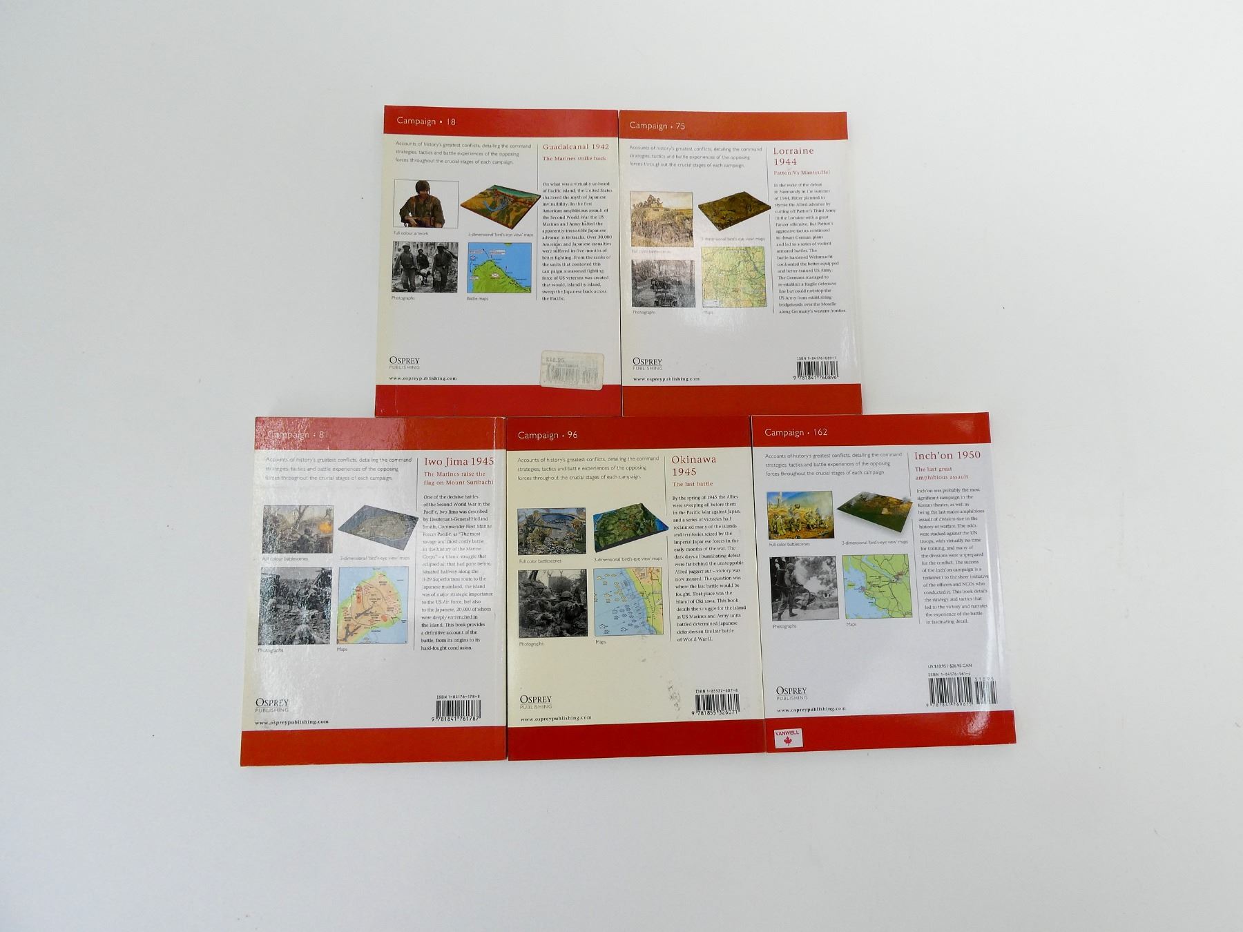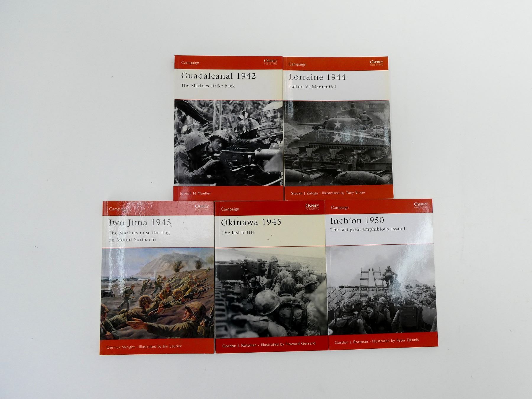 SOFT COVERS, VARIOUS AUTHORS, SERIES NOT COMPLETE / SOME ISSUES MISSING, LOT INCLUDES; (1) "CAMPAIGN 18, GUADALCANAL 1942, THE MARINES STRIKE BACK" BOOK, ISBN: 1-85532-253-6, (1) "CAMPAIGN 75, LORRAINE 1944, PATTON VS MANTEUFFEL" BOOK, ISBN: 1-84176-089-7, (1) "CAMPAIGN 81, IWO JIMA 1945, THE MARINES RAISE THE FLAG ON MOUNT SURIBACHI" BOOK, ISBN: 1-84176-178-8, (1) "CAMPAIGN 96, OKINAWA 1945, THE LAST BATTLE" BOOK, ISBN: 1-85532-607-8 & (1) "CAMPAIGN 162, INCH'ON 1950, THE LAST GREAT AMPHIBIOUS ASSAULT" BOOK, ISBN: 1-84176-961-4. SEE PHOTOS.