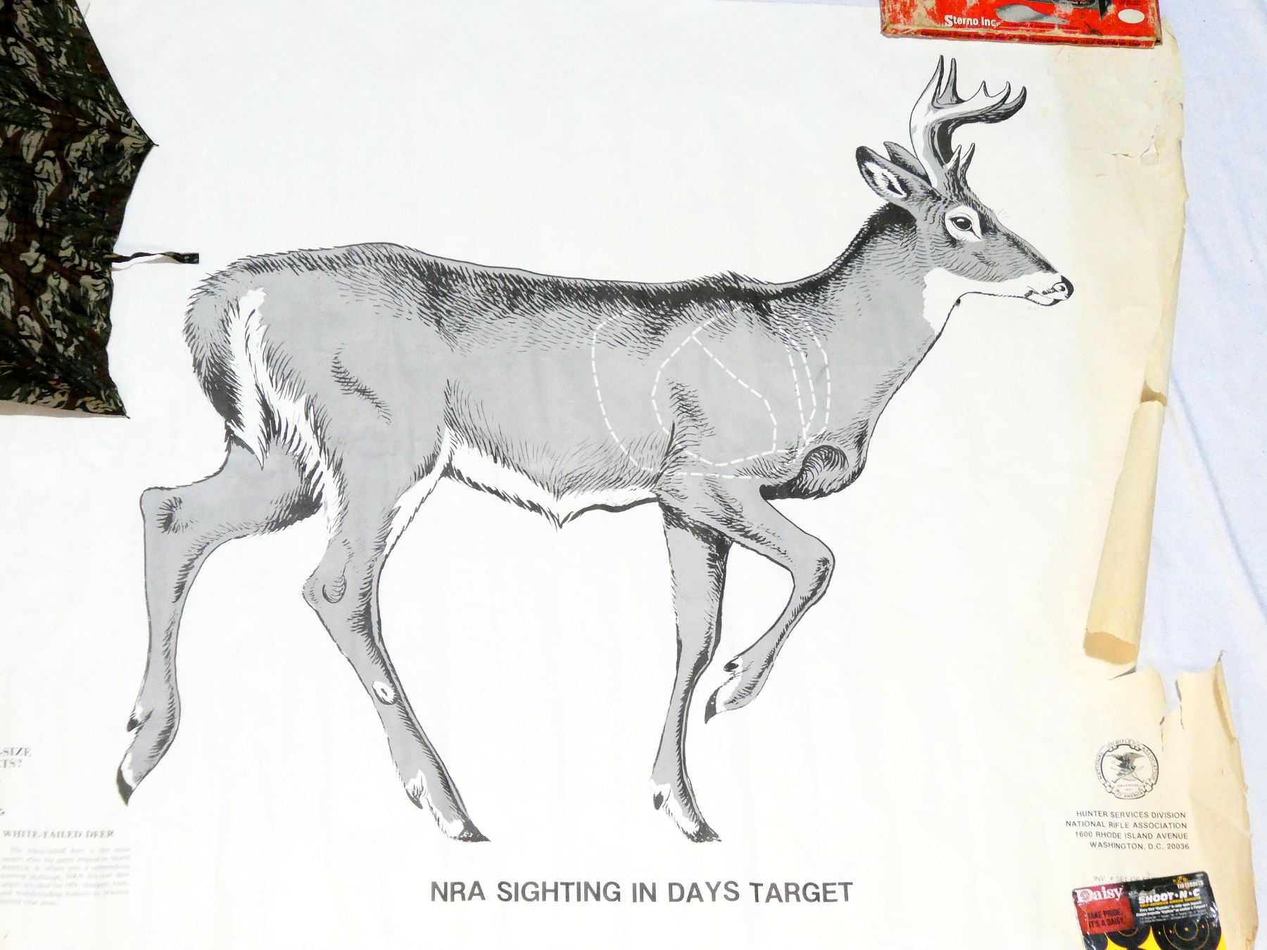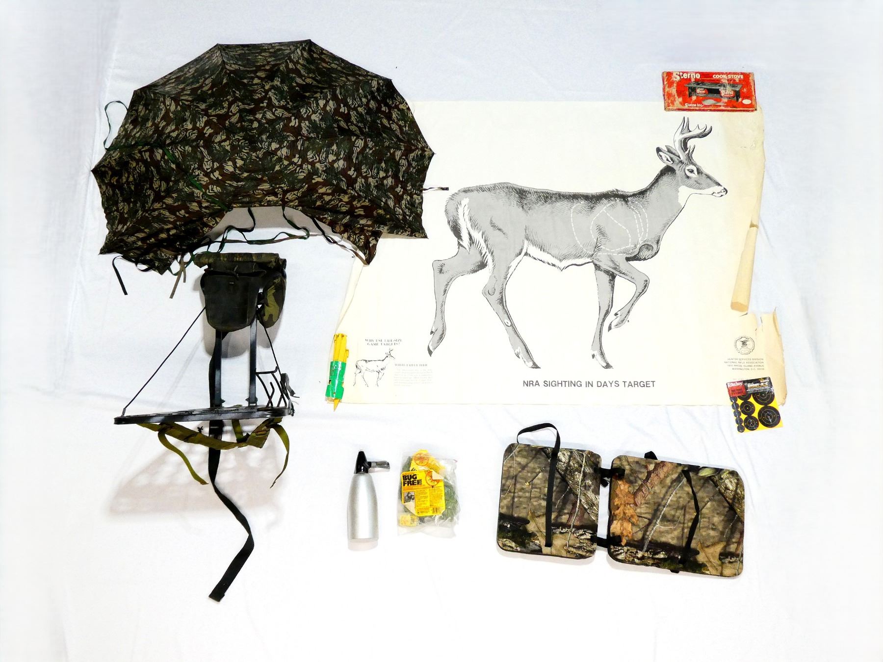 LOT INCLUDES; (1) TREE STAND SEAT AND FOOD REST, LADDER NOT INCLUDED, (1) FOAM CUSHION WITH CLIP STRAPS, (1) TREE STAND UMBRELLA, (1) BUG FREE INSECT REPELLENT HOODED JACKET WITH BUG FREE INSECT REPELLENT, (1) SHOOT-N-C SELF-ADHESIVE AIRGUN TARGETS PACKET OF 110 TARGETS, (1) HUNTER SERVICES DIVISION NRA SIGHTING IN DAYS LIFE-SIZED WHITETAIL DEER TARGET, APPROX. 66" X 47.5", (1) SET OF 6 TENT PEGS, APPEARS INCOMPLETE / PIECES MAY BE MISSING, (1) WHIP CREAM DISPENSER & (1) PORTABLE STOVE TOP. SEE PHOTOS.