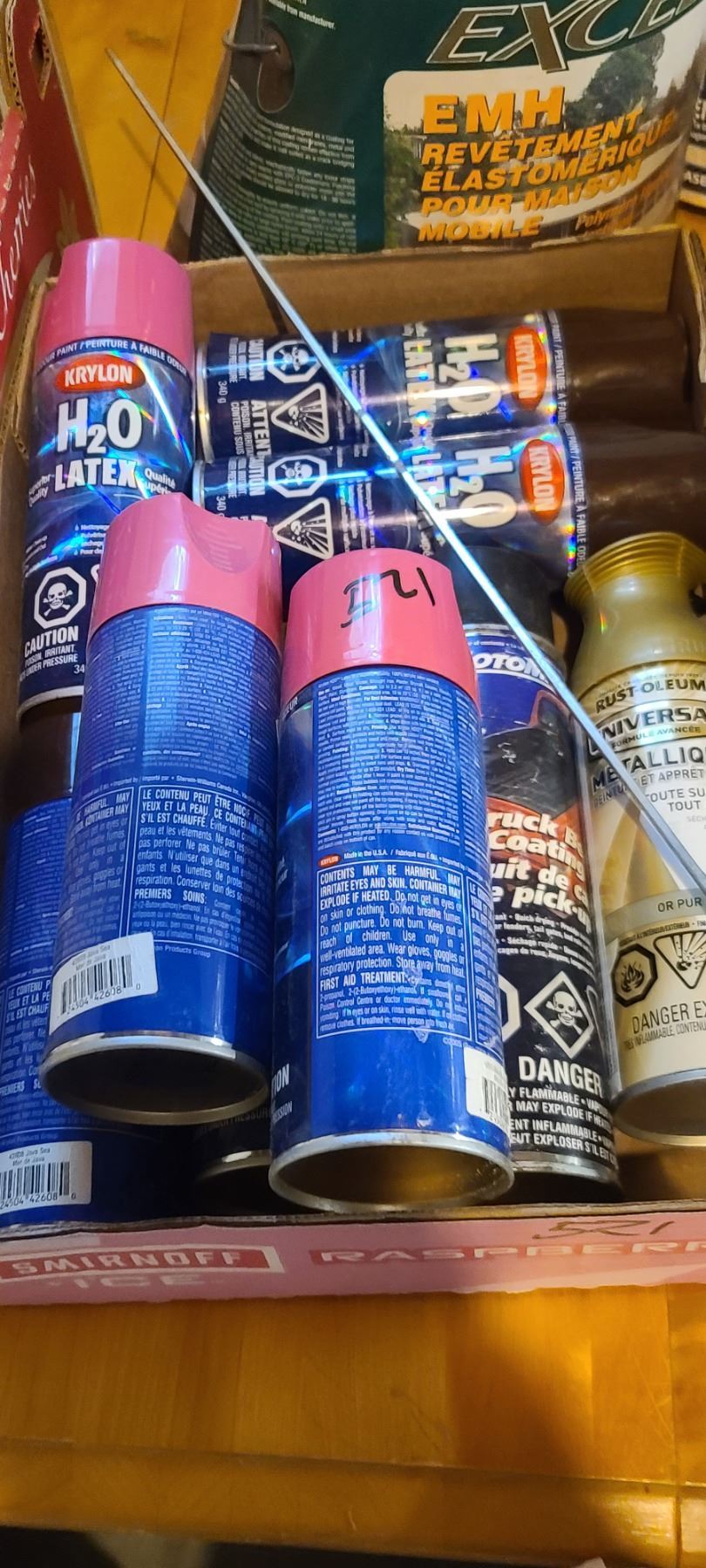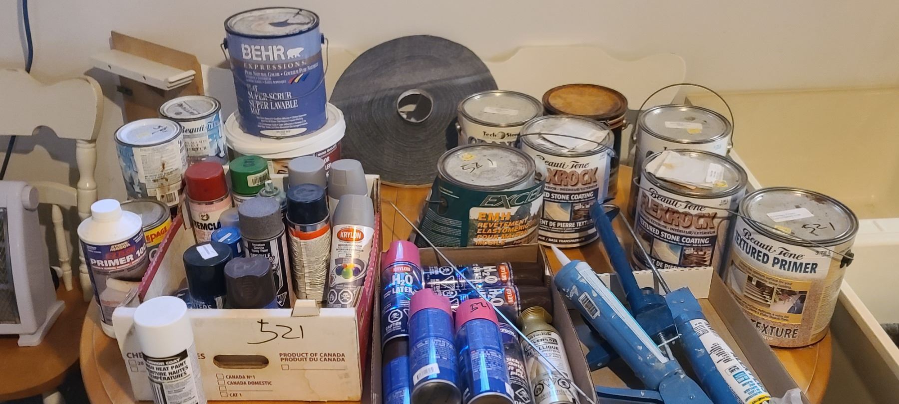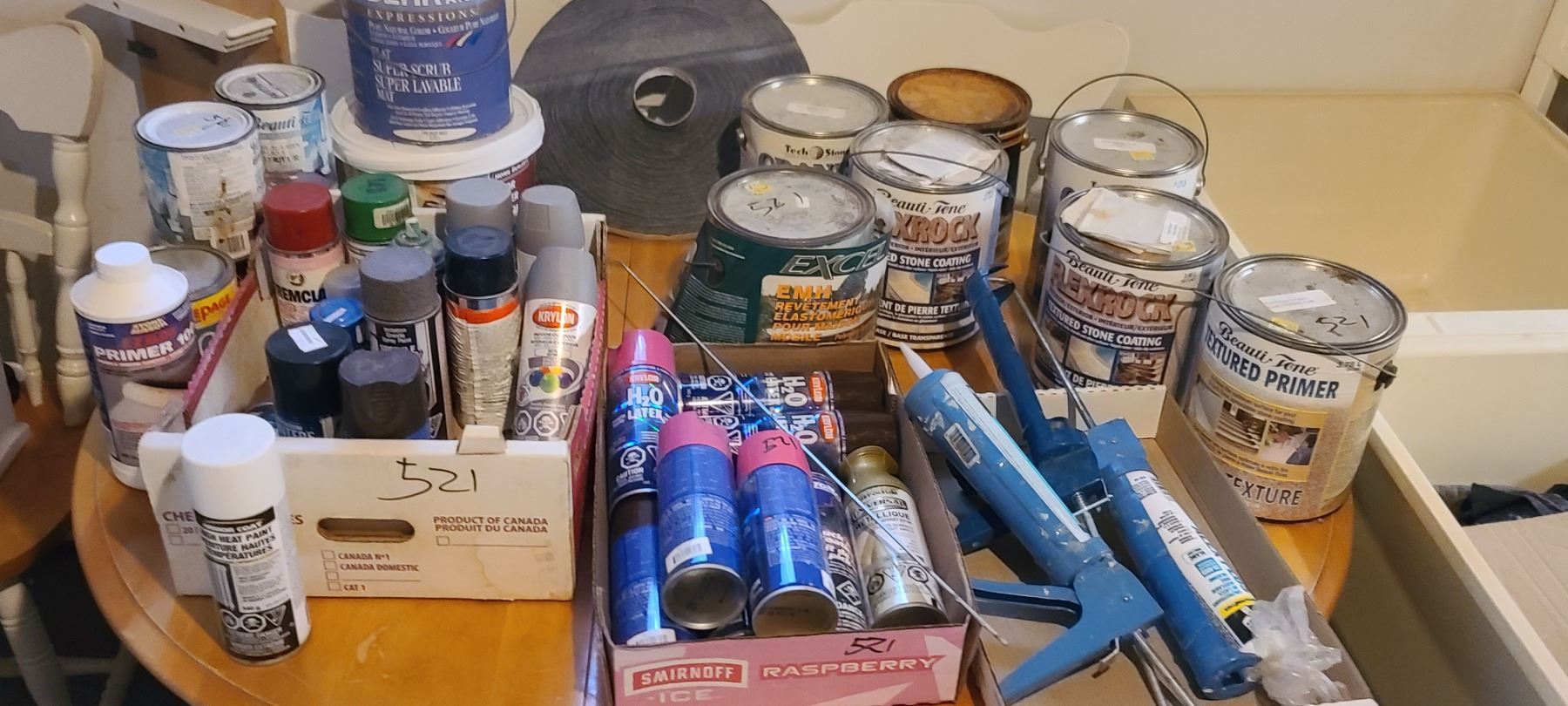 ASSORTED PAINTS(SPRAYS, QTS, & GALS); FLOOR LEVEL/PATCH, CAULKING GUNS w/ CAULK