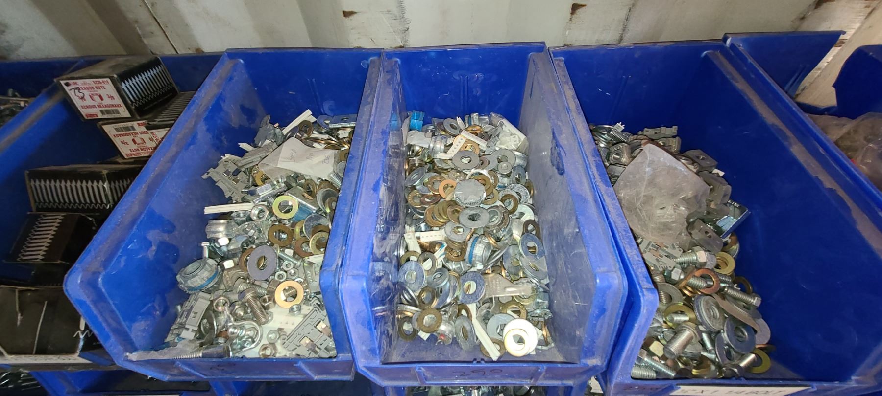 ASSORTED PART BINS OF NUTS, SCREWS, BOLTS , WASHERS PLEASE SEE IMAGES
