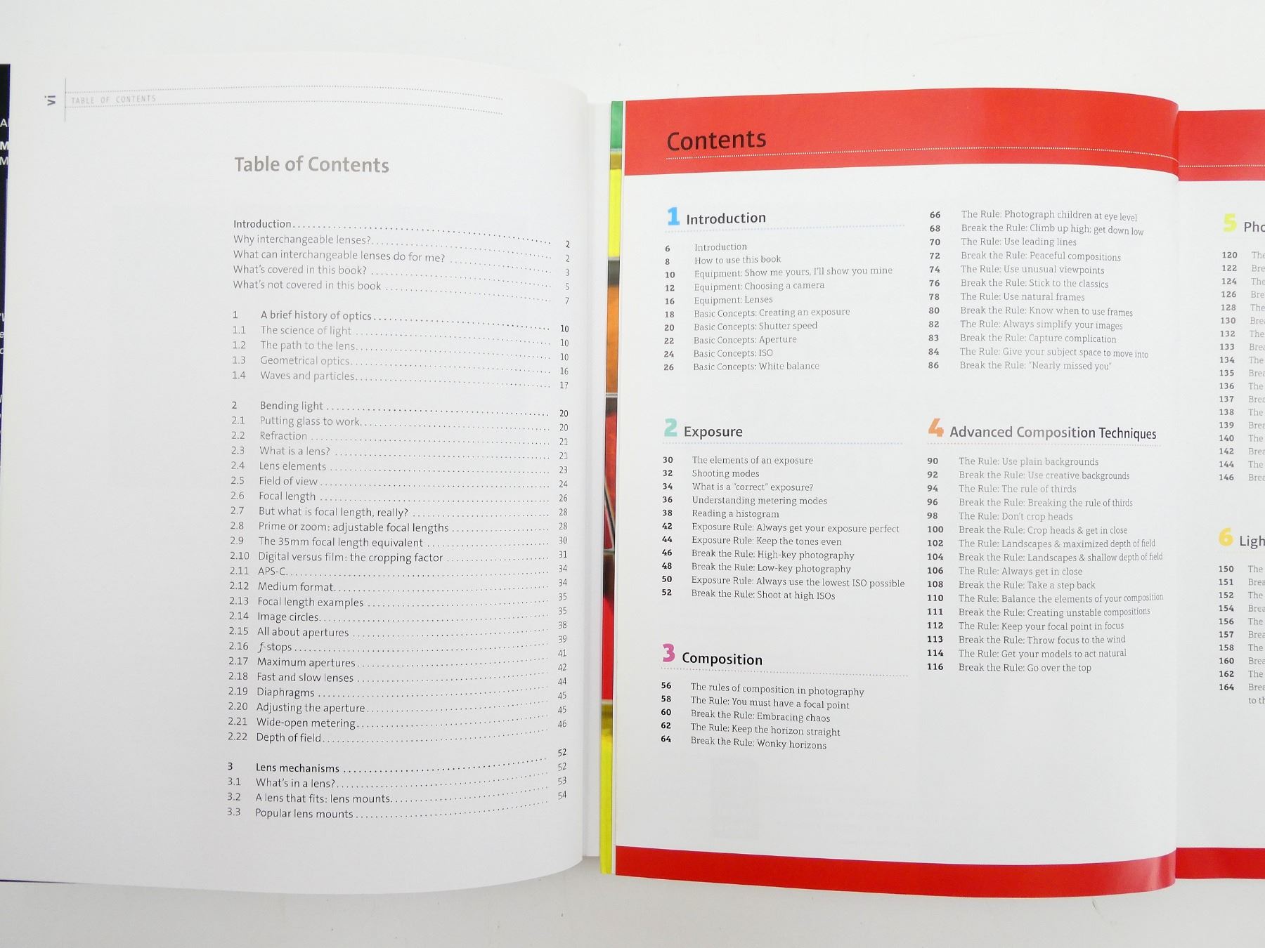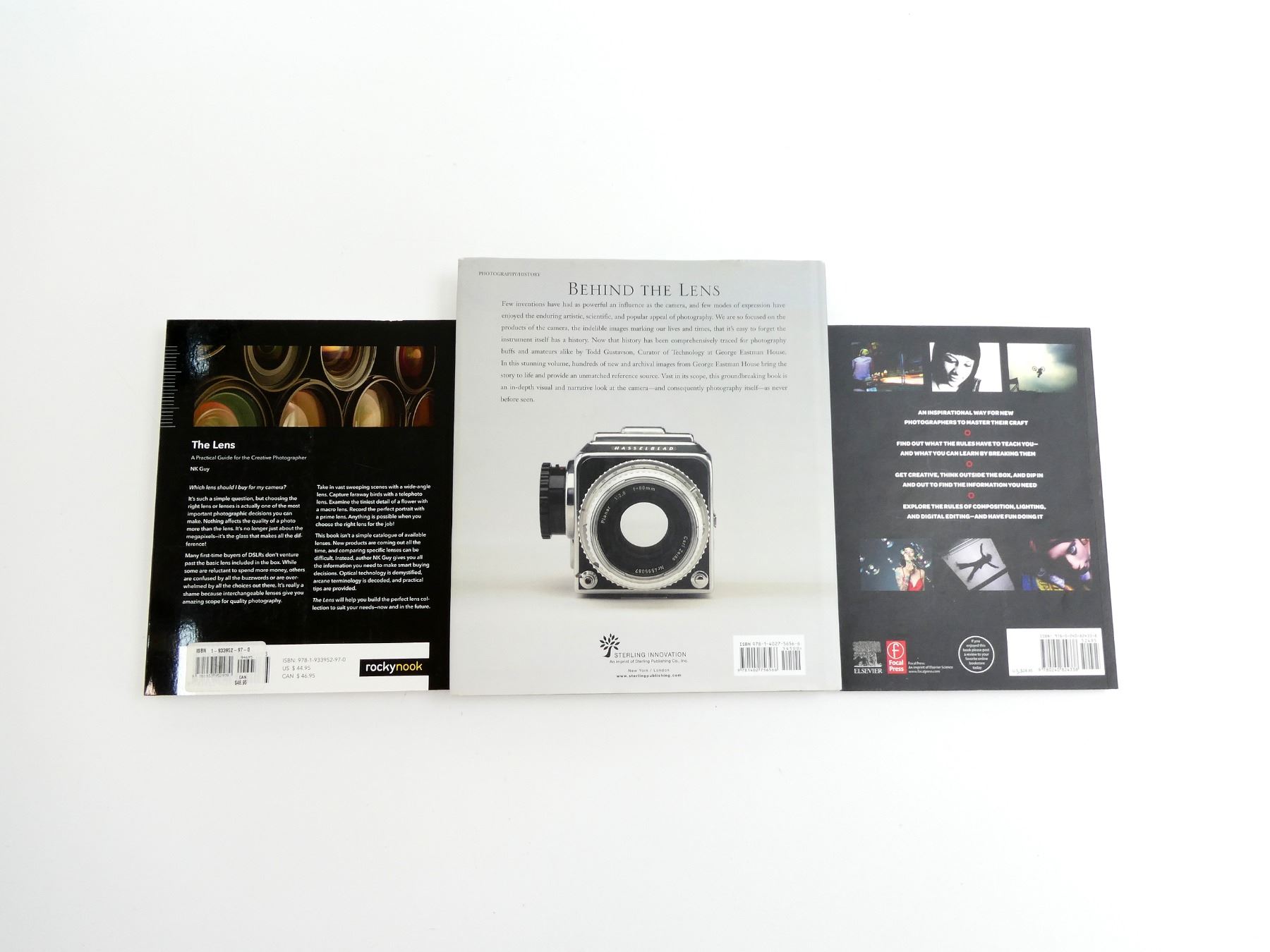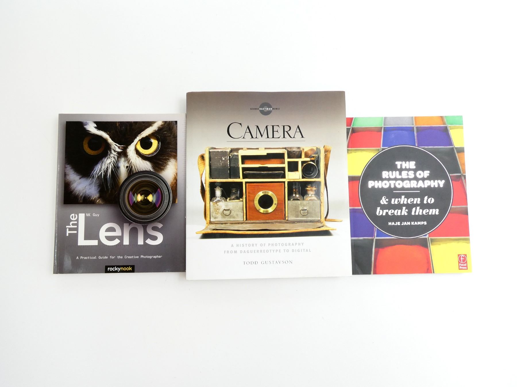 LOT INCLUDES; (1) "THE RULES OF PHOTOGRAPHY & WHEN TO BREAK THEM" BOOK BY HAJE JAN KAMPS, SOFT COVER, ISBN: 978-0-240-82433-8, (1) "THE LENS, A PRACTICAL GUIDE FOR THE CREATIVE PHOTOGRAPHER" BOOK BY NK GUY, SOFT COVER, ISBN: 1-933952-97-0 & (1) "CAMERA, A HISTORY OF PHOTOGRAPHY FROM DAGUERREOTYPE TO DIGITAL" BOOK BY TODD GUSTAVSON, HARD COVER WITH DUST COVER, ISBN: 978-1-4027-5656-6. SEE PHOTOS.