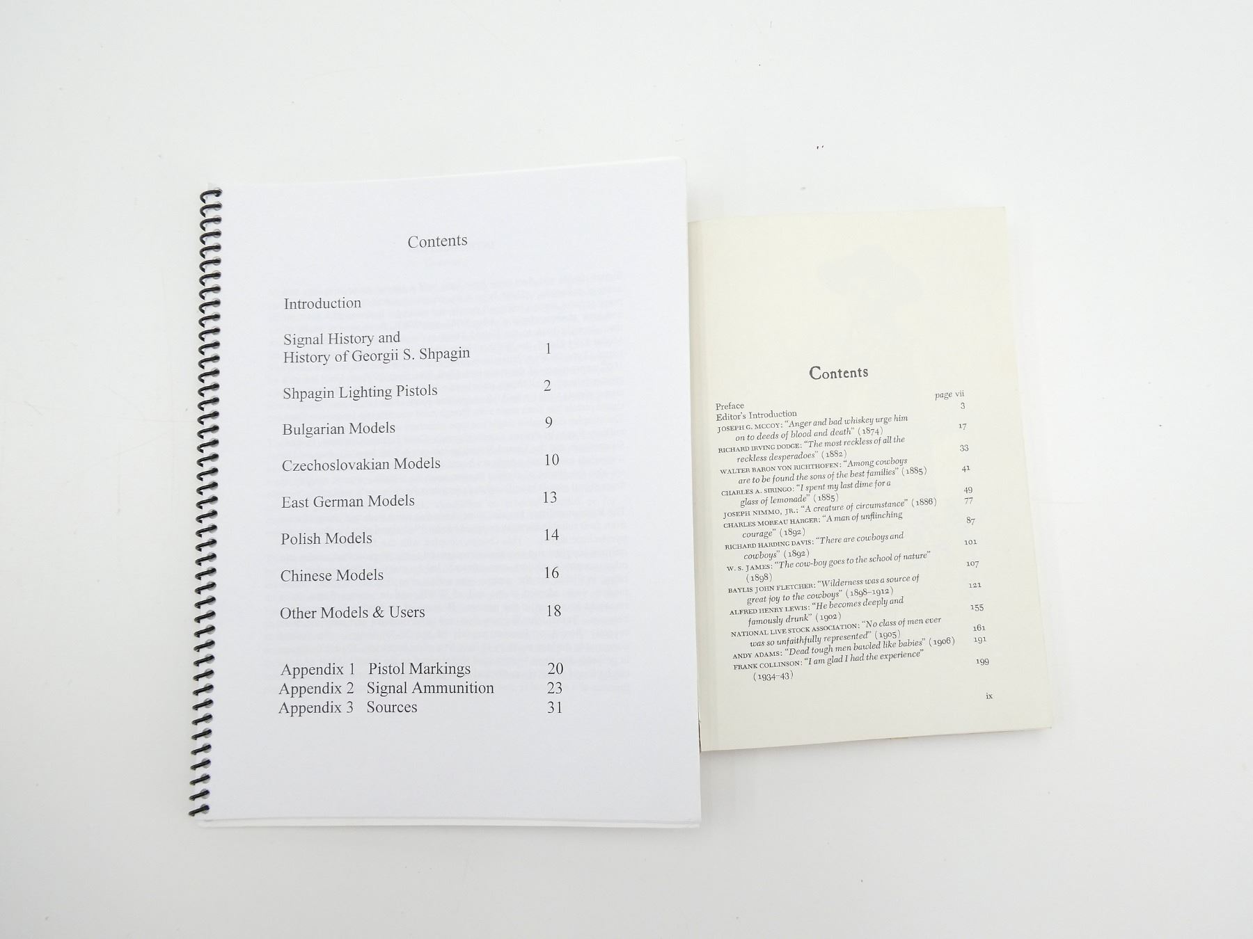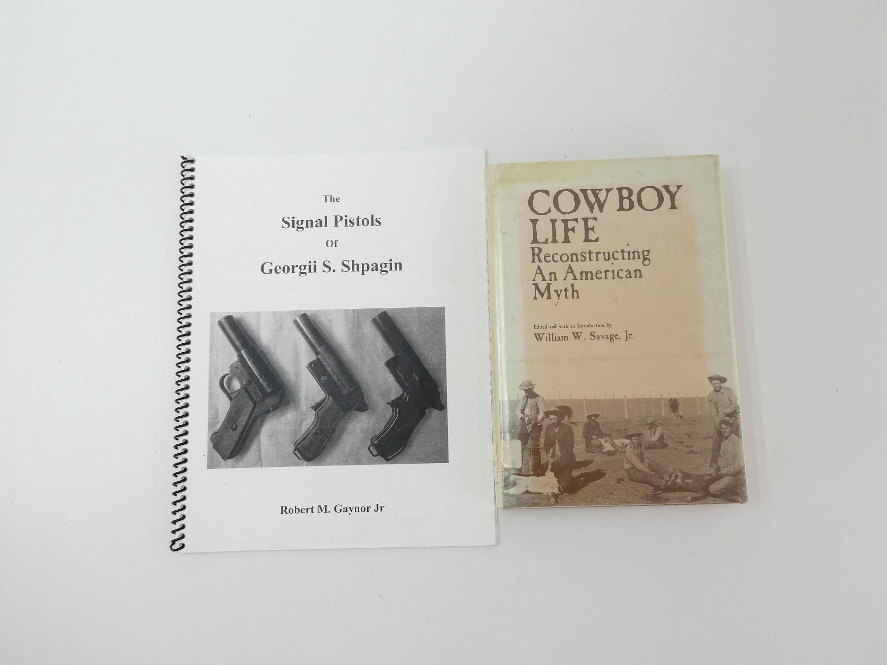 LOT INCLUDES; (1) "THE SIGNAL PISTOLS OF GEORGII S. SHPAGIN" BOOK, BY ROBERT M. GAYNOR JR, INSCRIBED / SIGNED BY AUTHOR, SOFT COVER, COPYRIGHT 2011 & (1) "COWBOY LIFE, RECONSTRUCTING AN AMERICAN MYTH" BOOK BY WILLIAM W. SAVAGE JR, SECOND PRINTING, HARD COVER WITH DUST COVER, ISBN: 0-8061-1218-2. SEE PHOTOS.