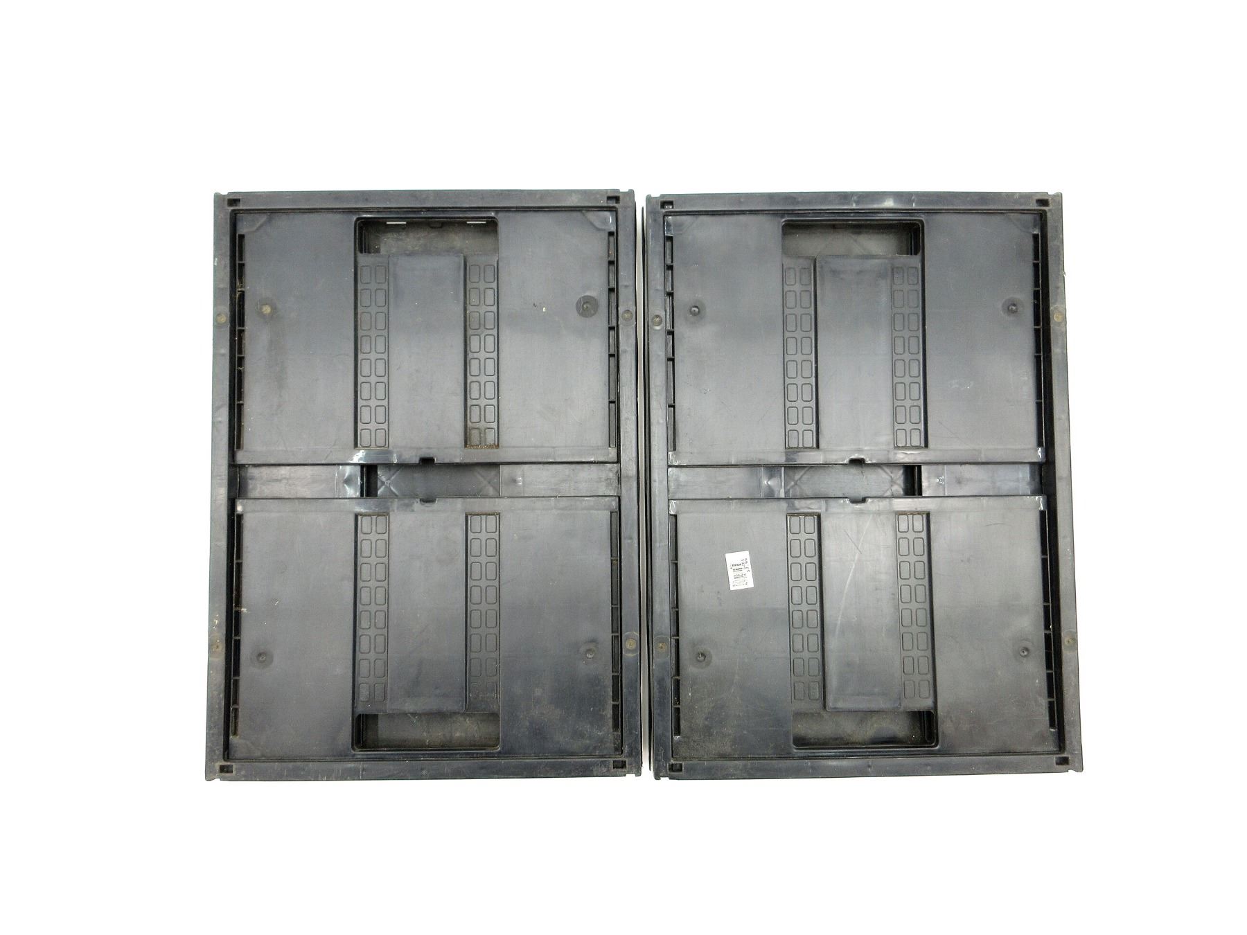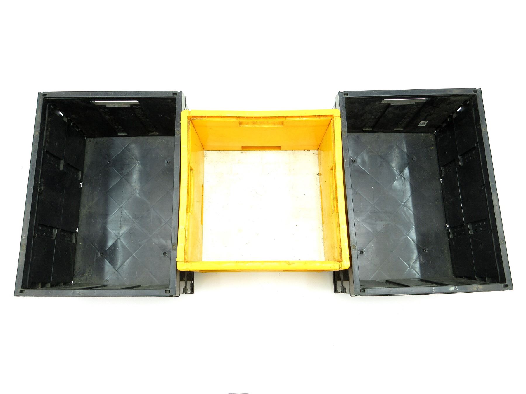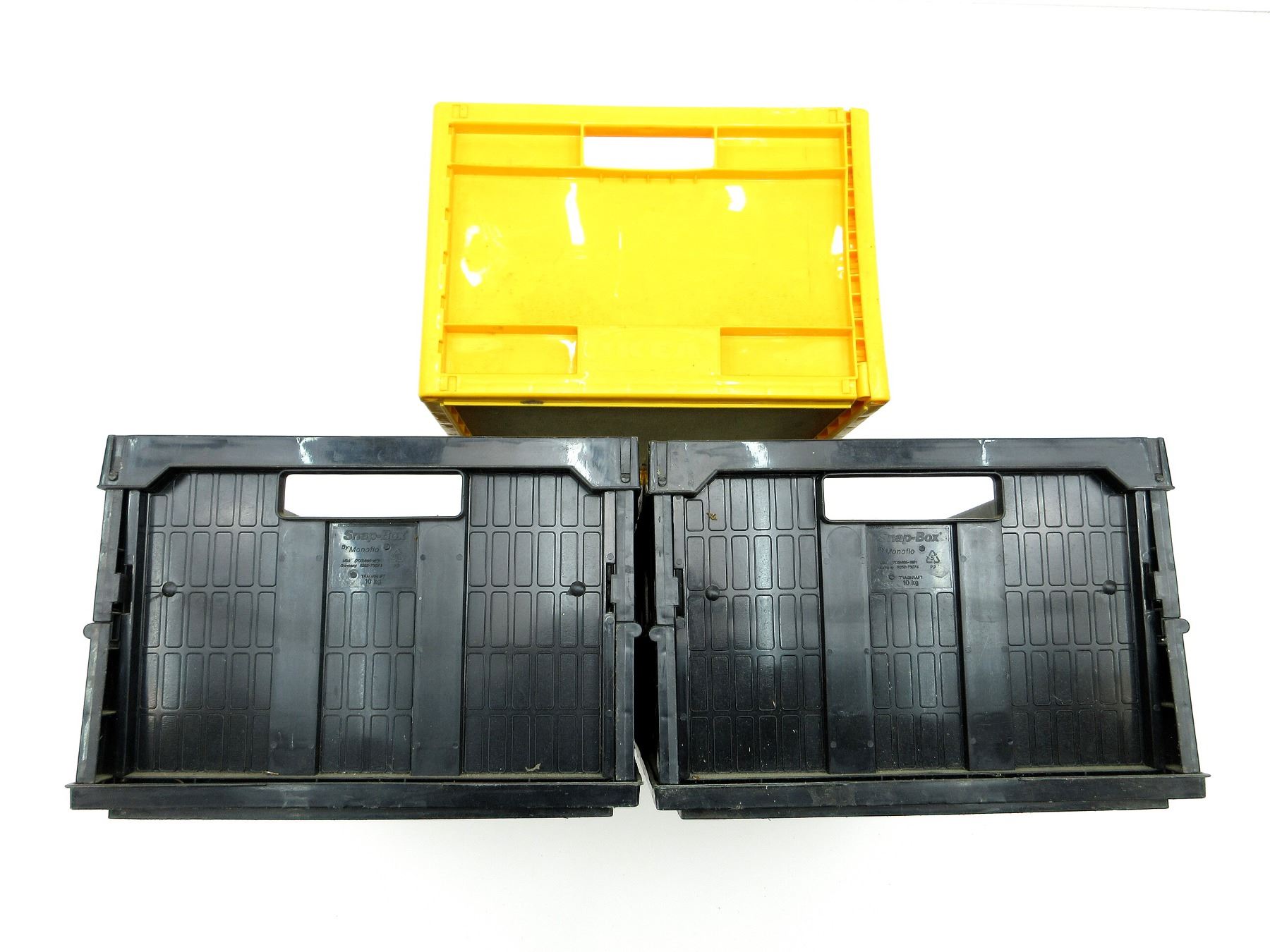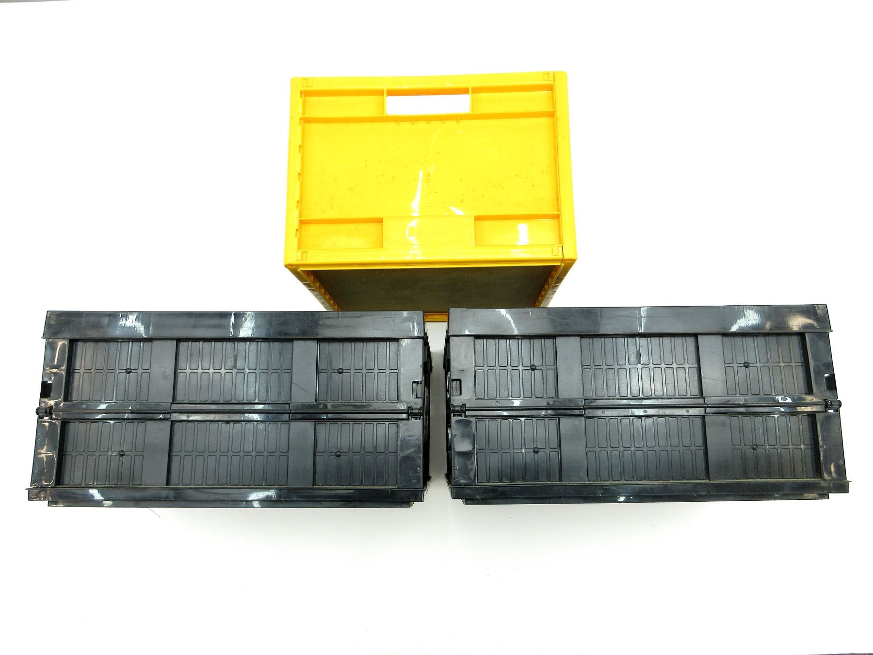 LOT INCLUDES; (2) MFG'D BY MONOFLO, BLACK PLASTIC FOLDING CRATE, VARIOUS MARKINGS, MAX. WEIGHT 10KG, APPROX. 19" X 13.75" X 9.75" & (1) MFG'D BY IKEA, YELLOW PLASTIC FOLDING CRATE, VARIOUS MARKINGS, APPROX. 14.5" X 14.5" X 10.25". SEE PHOTOS.