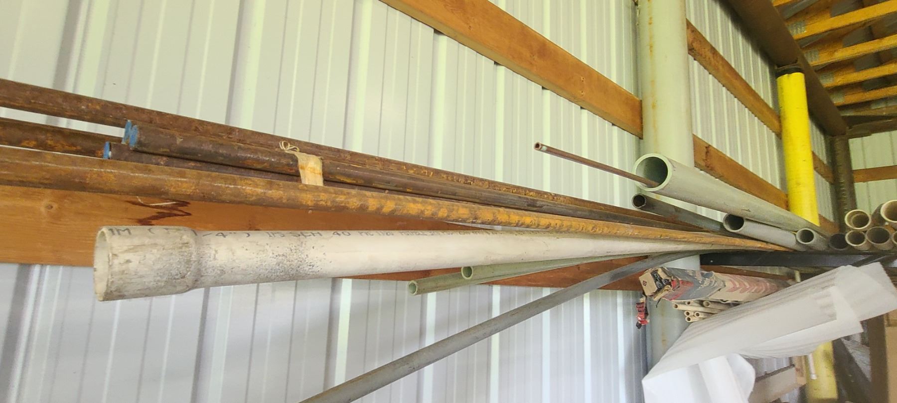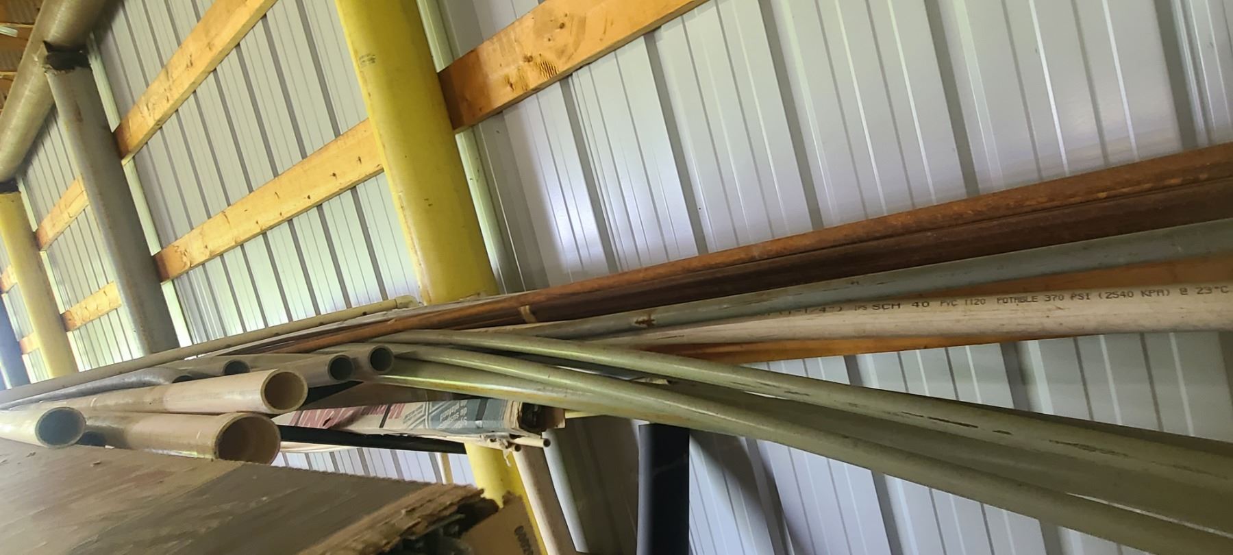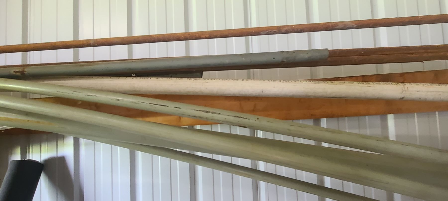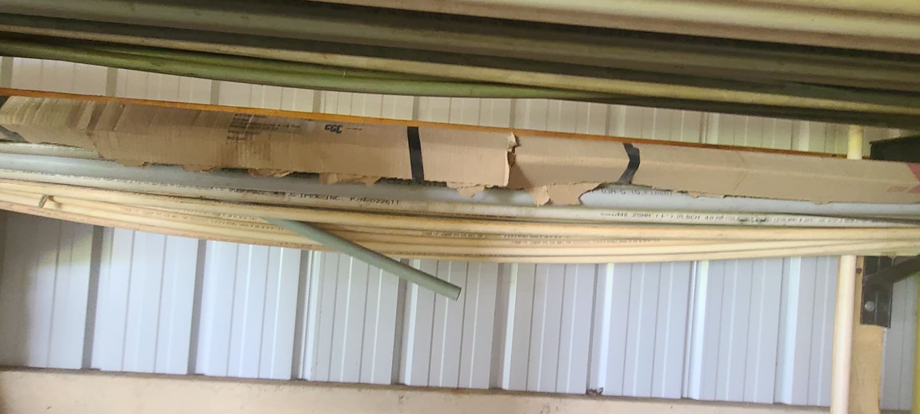 ASSORTED PLASTIC PIPE, TUBING AND METAL STOCK ON TOP OF PIPE RACK