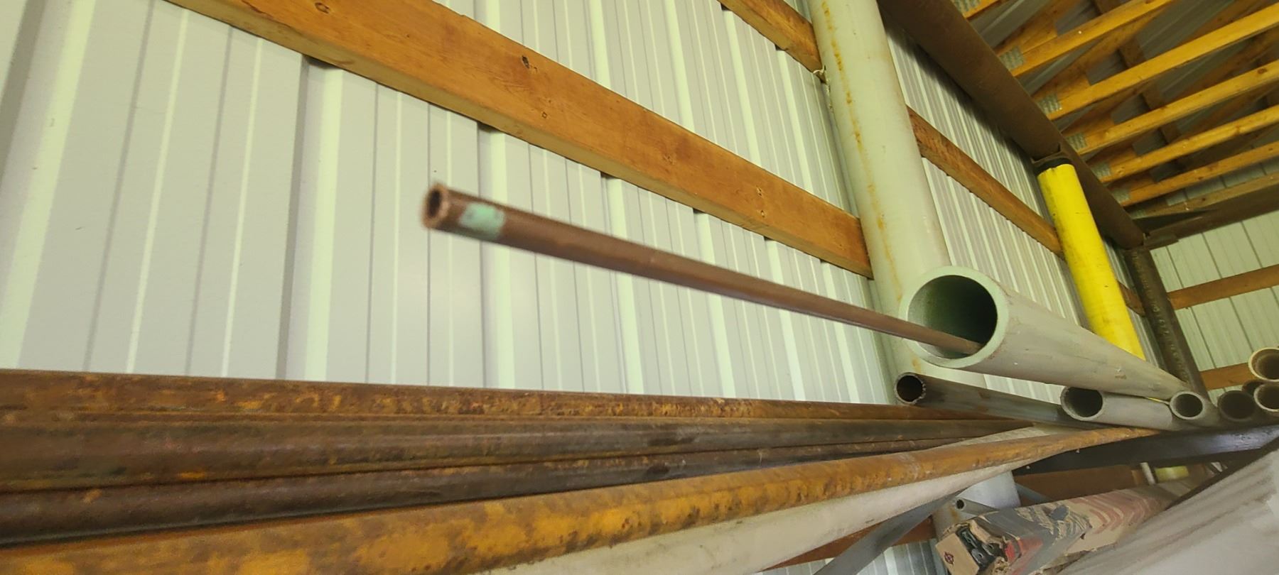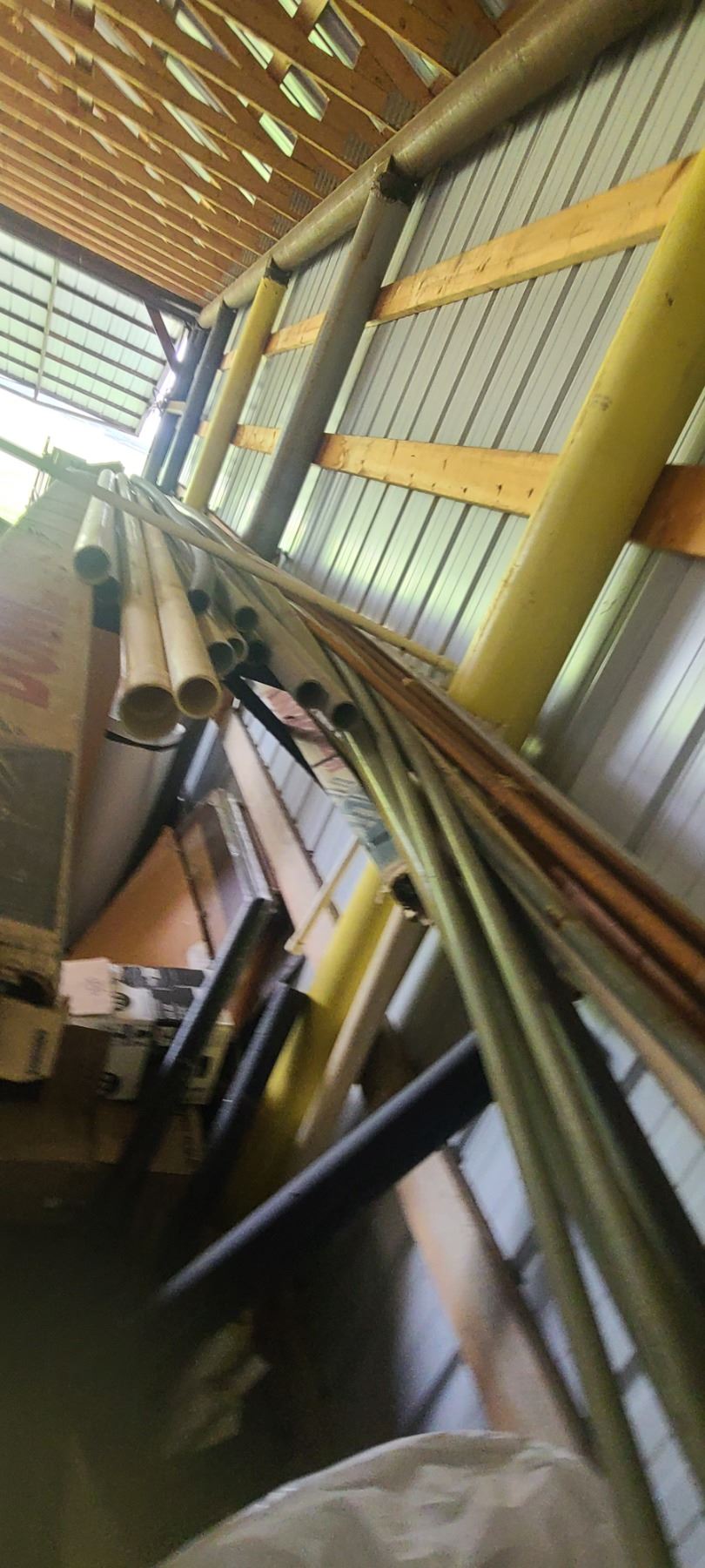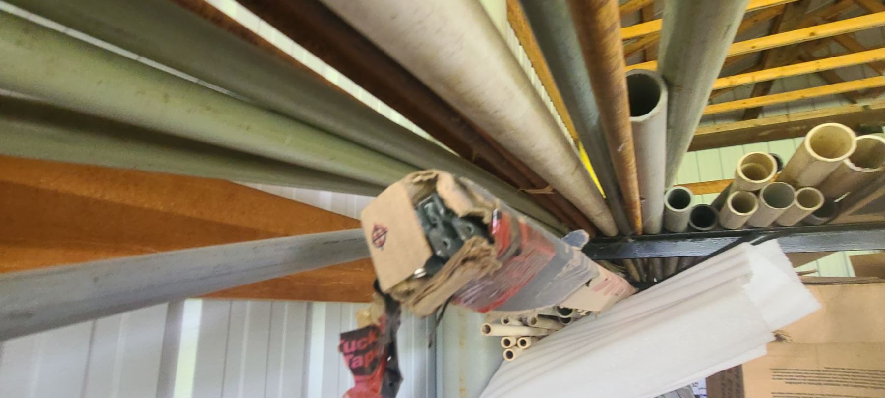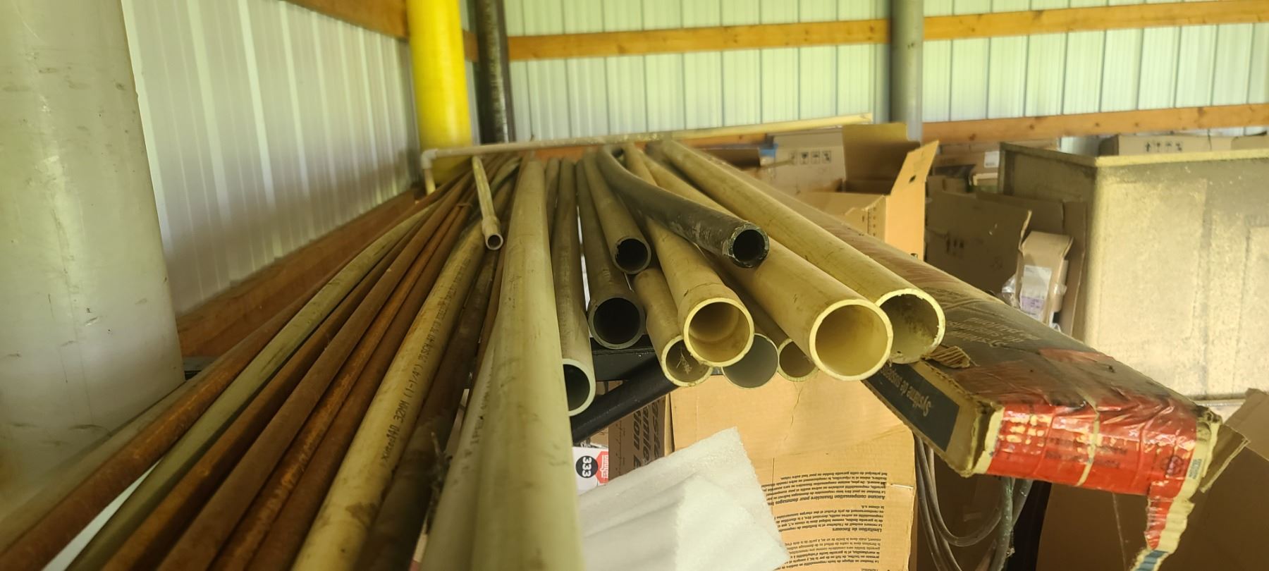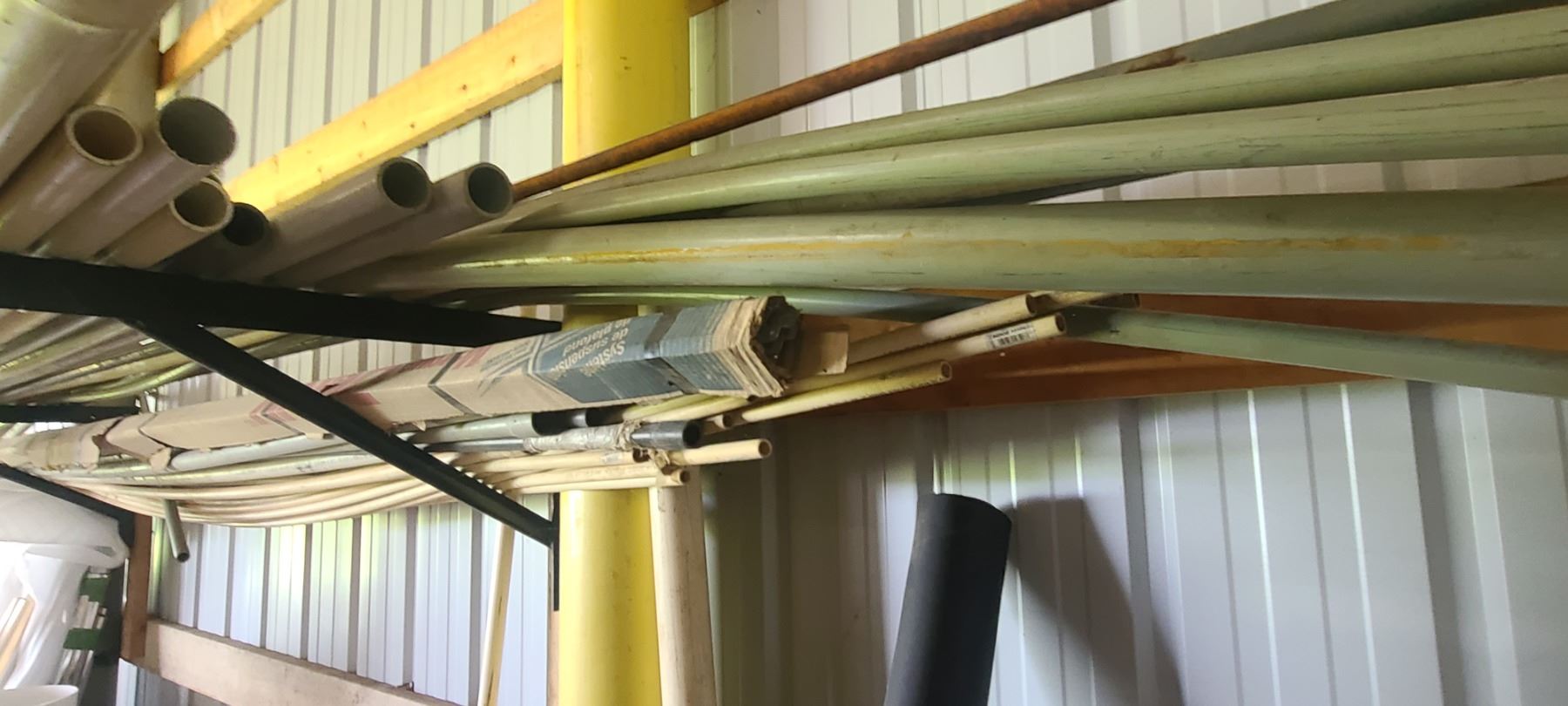 ASSORTED PLASTIC PIPE, TUBING AND METAL STOCK ON TOP OF PIPE RACK