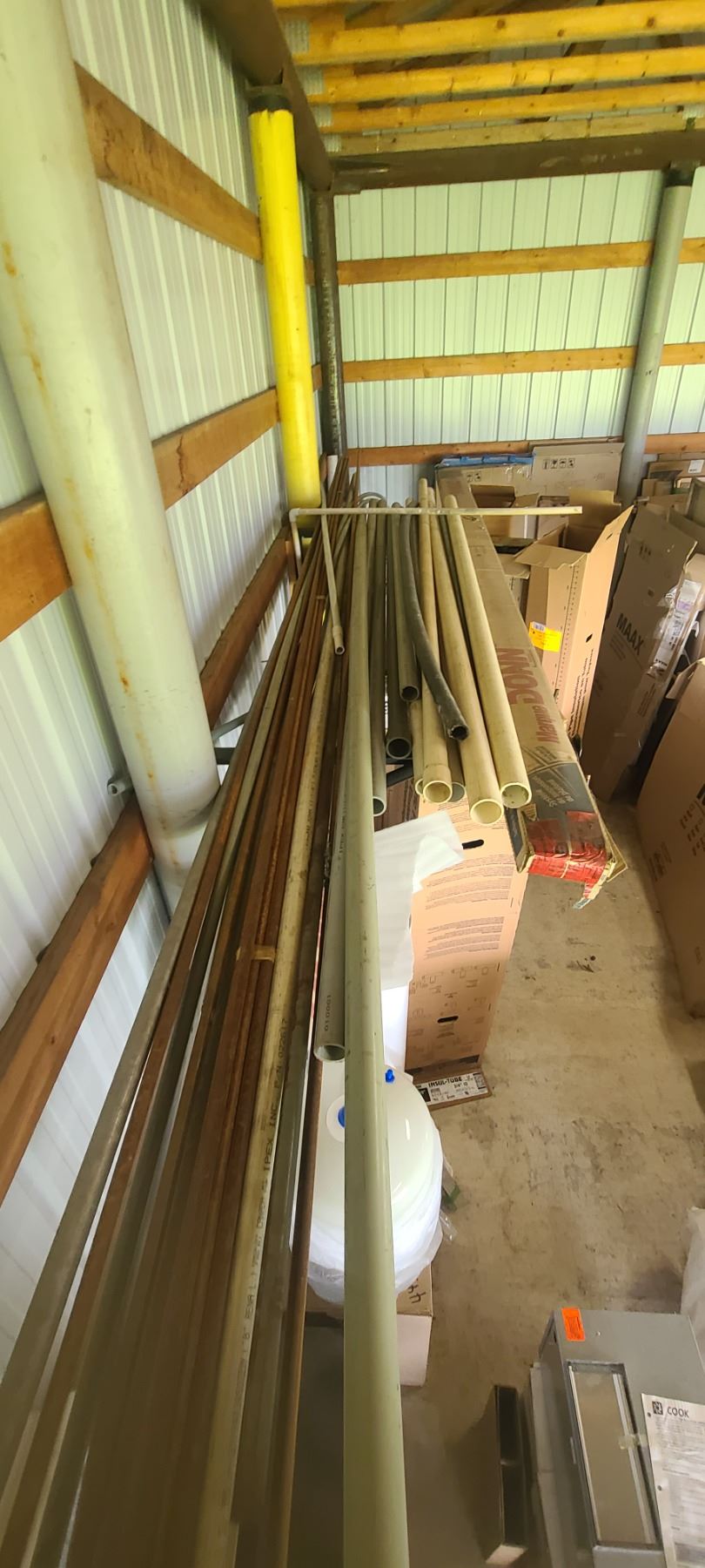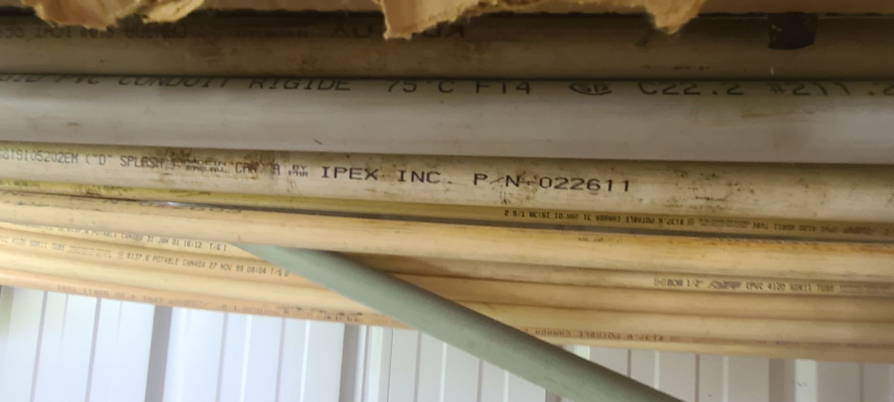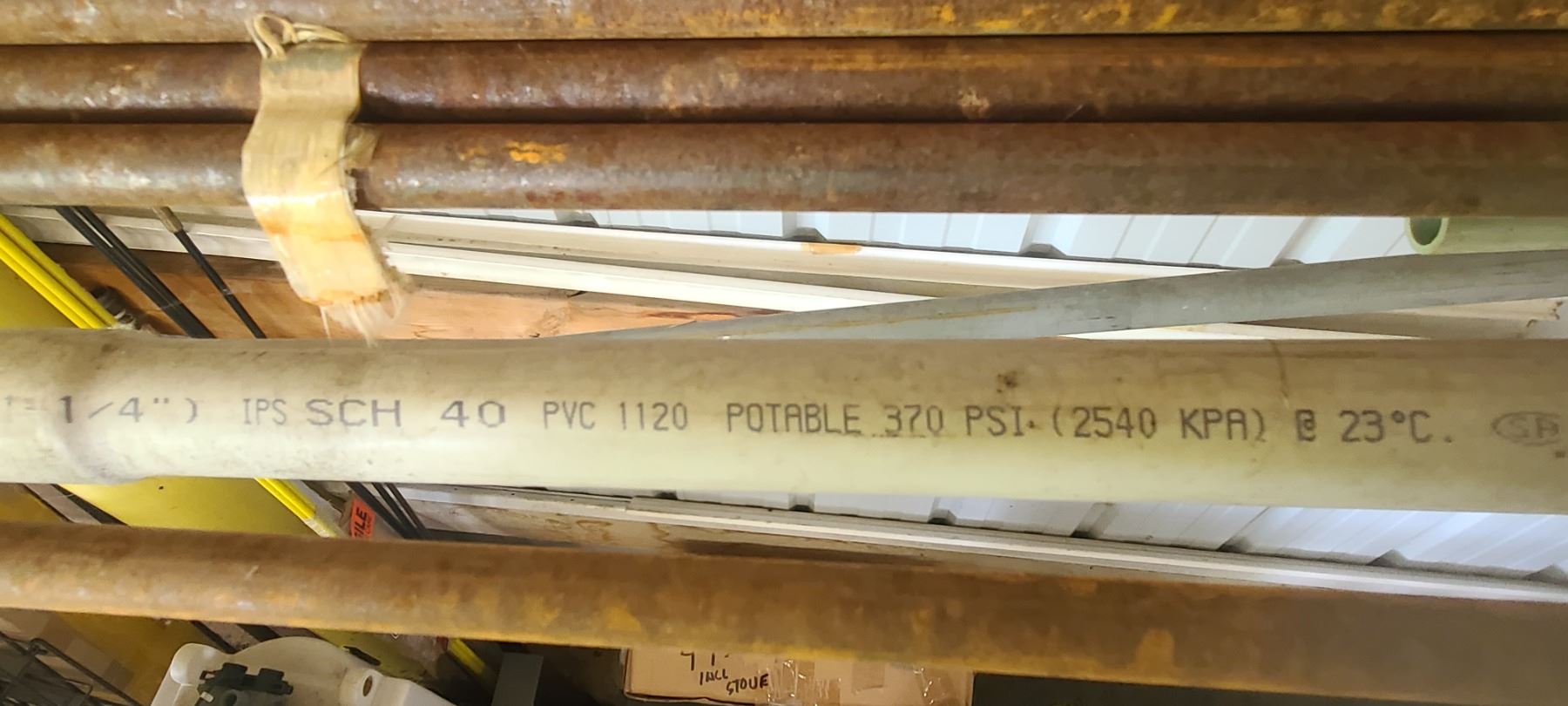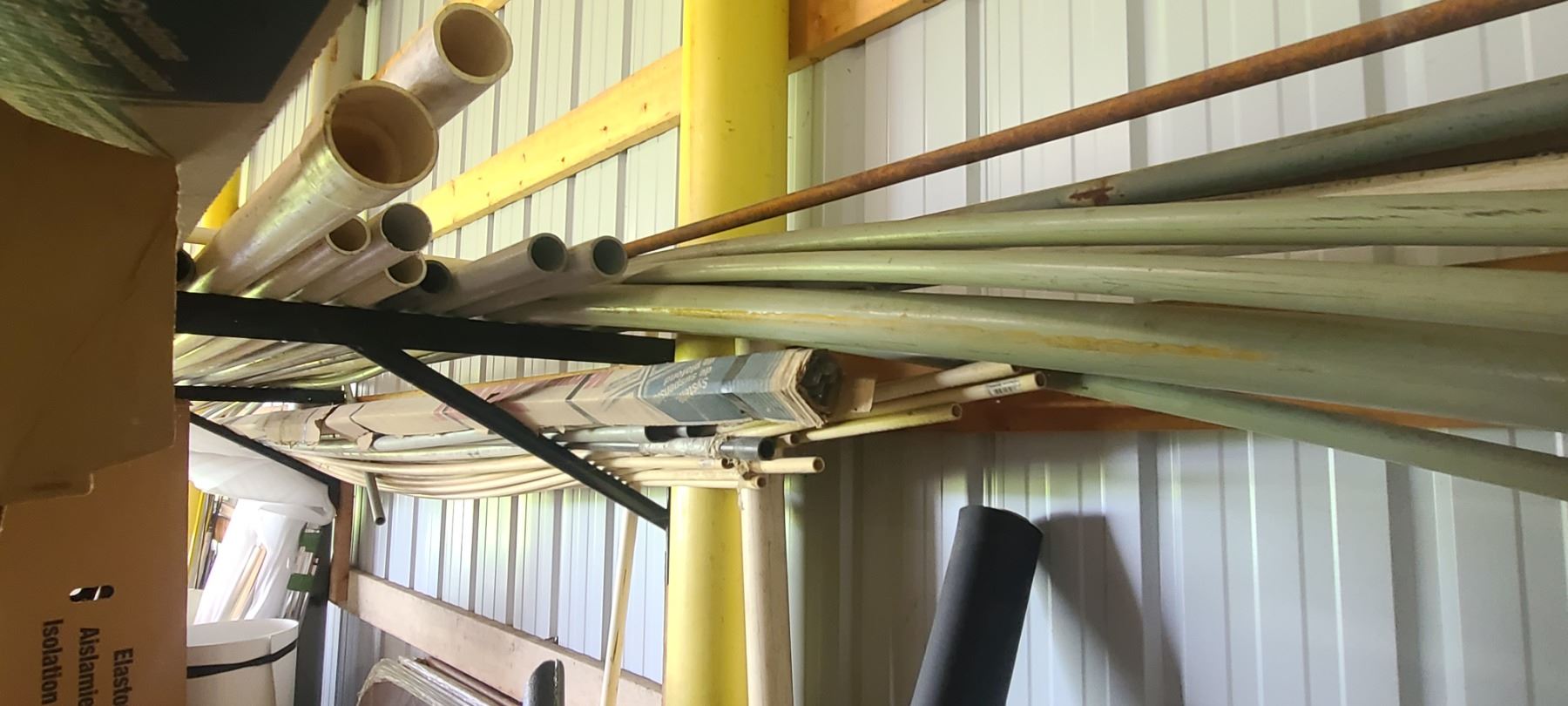 ASSORTED PLASTIC PIPE, TUBING AND METAL STOCK ON TOP OF PIPE RACK