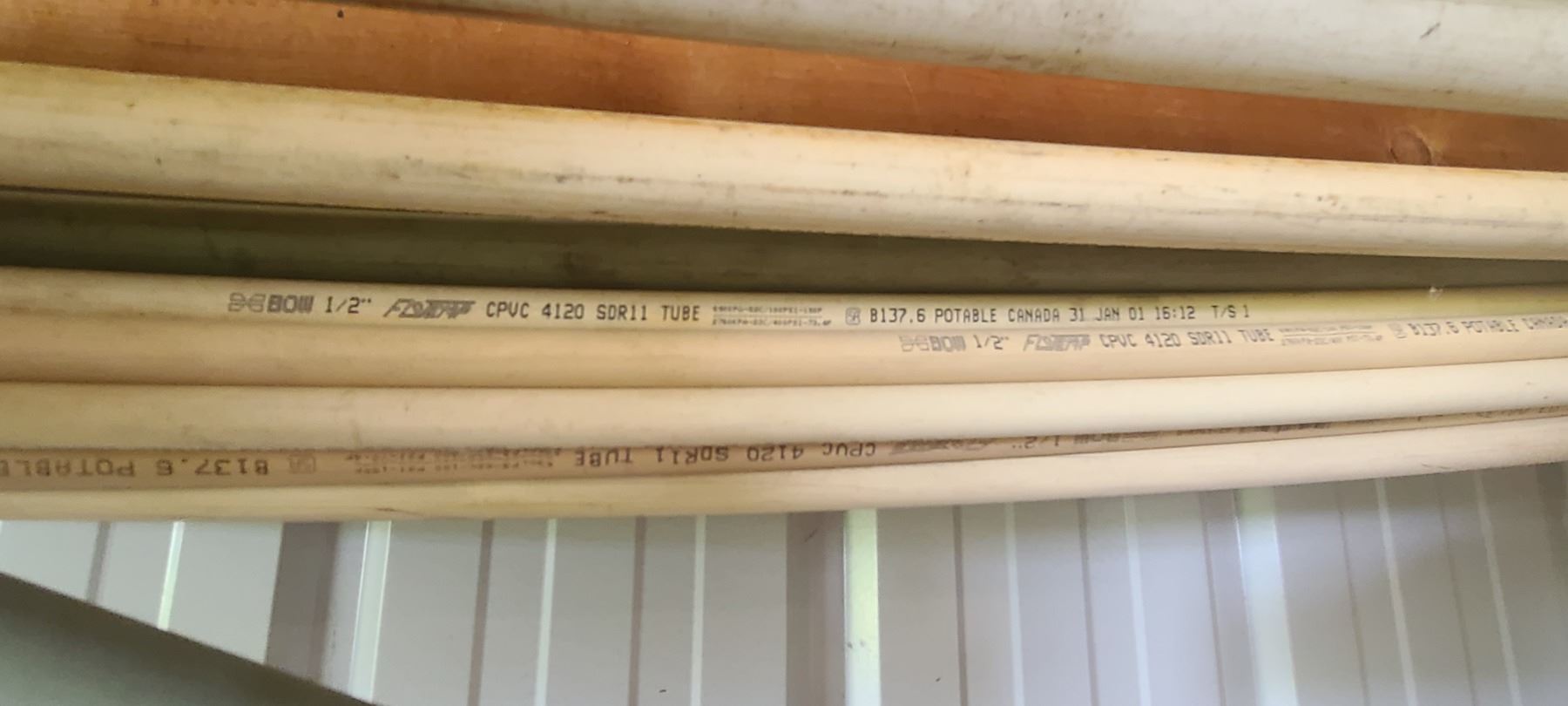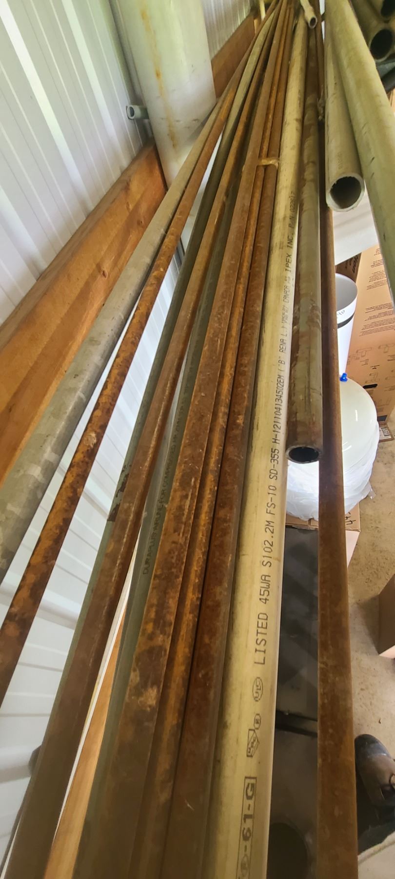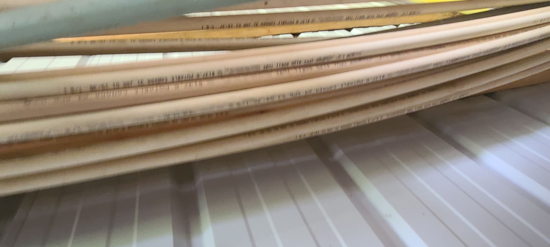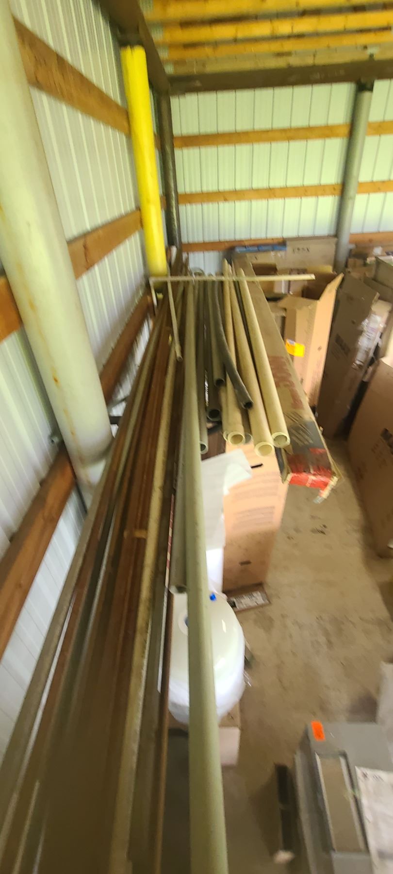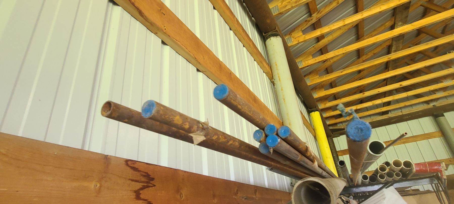 ASSORTED PLASTIC PIPE, TUBING AND METAL STOCK ON TOP OF PIPE RACK