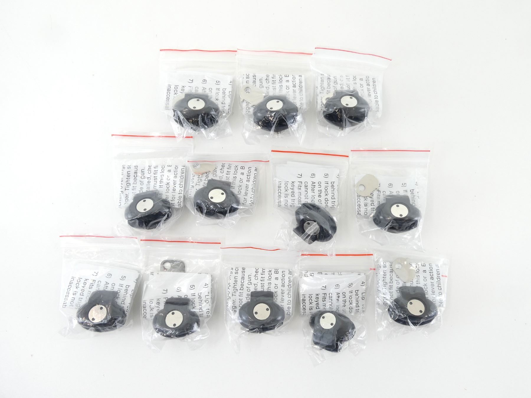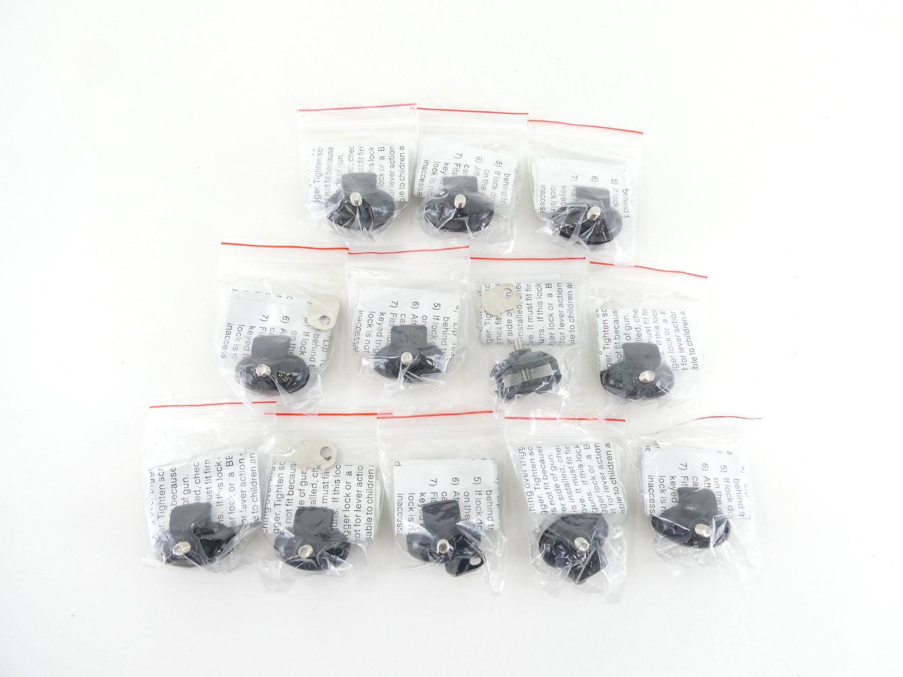 LOT INCLUDES; (12) BLACK PLASTIC TRIGGER LOCKS, IN ORIGINAL PACKAGING, WITH KEYS & MOUNTING INSTRUCTIONS. SEE PHOTOS.