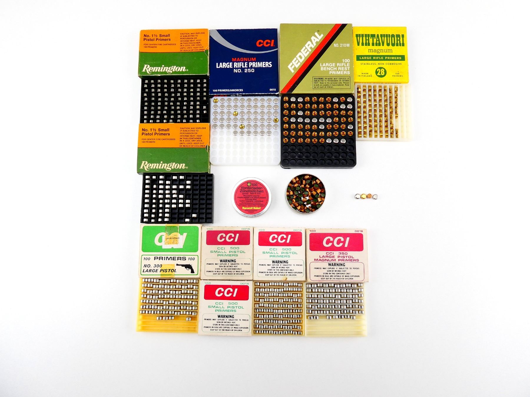 LOT INCLUDES; APPROX. (832)PRIMERS & PERCUSSION CAPS, VARIOUS SMANUFACTURERS INCLUDING; CCI 350 LARGE PISTOL, CCI 500 SMALL PISTOL, CCI NO. 300 LARGE PISTOL, REMINGTON NO 1 1/2 SMALL PISTOL, ETC., SEE PHOTOS.