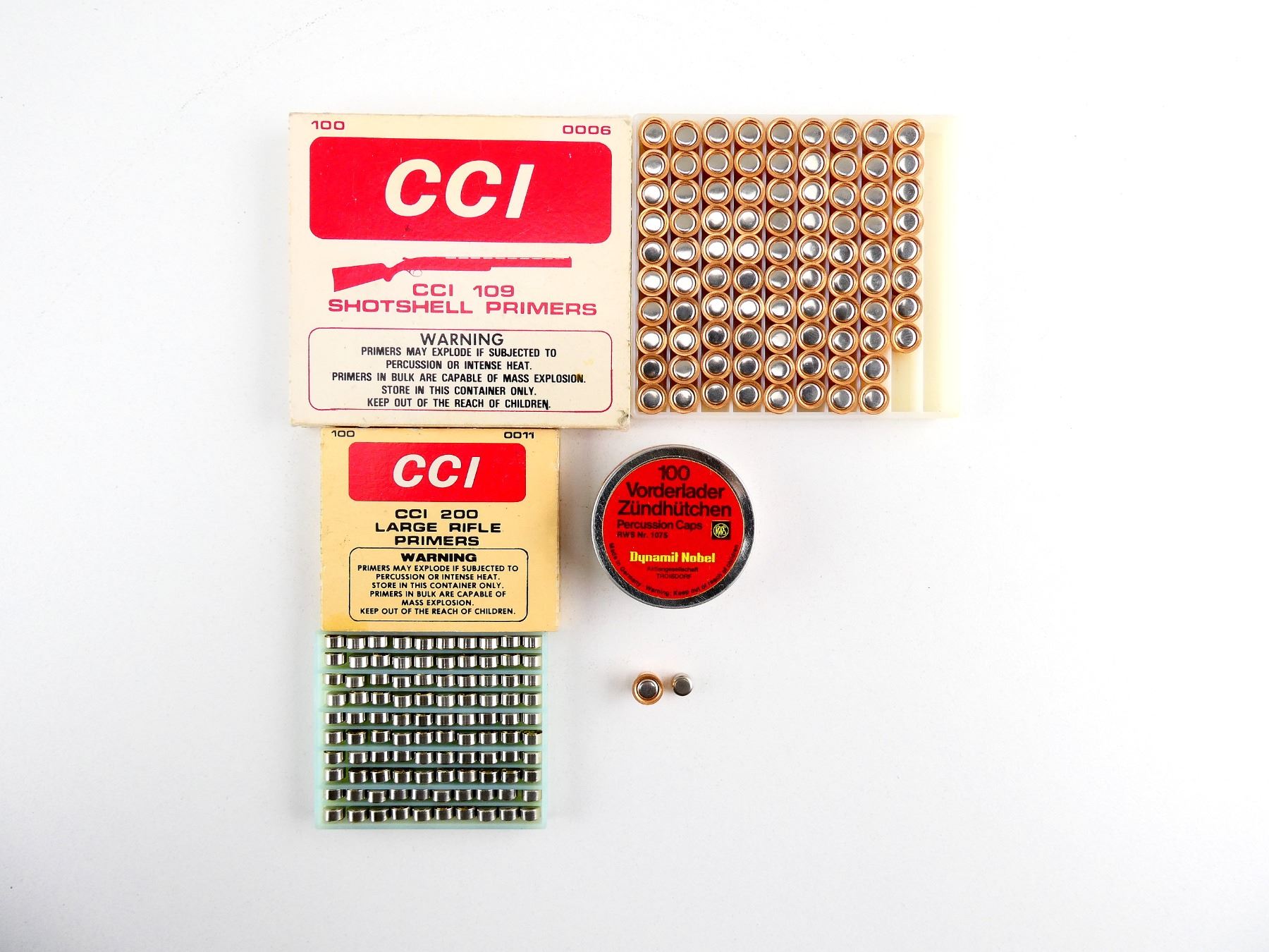 LOT INCLUDES; APPROX. (190) PRIMERS & PERCUSSION CAPS, VARIOUS MANUFACTURERS INCLUDING; CCI NO 109 SHOTSHELL PRIMERS, CCI NO. 200 LARGE RIFLE PRIMERS, CCI NO. 250 LARGE RIFLE MAGNUM PRIMERS & DYNAMIT NOBEL NR. 1075 PERCUSSION CAPS, (1) UNOPENED.
