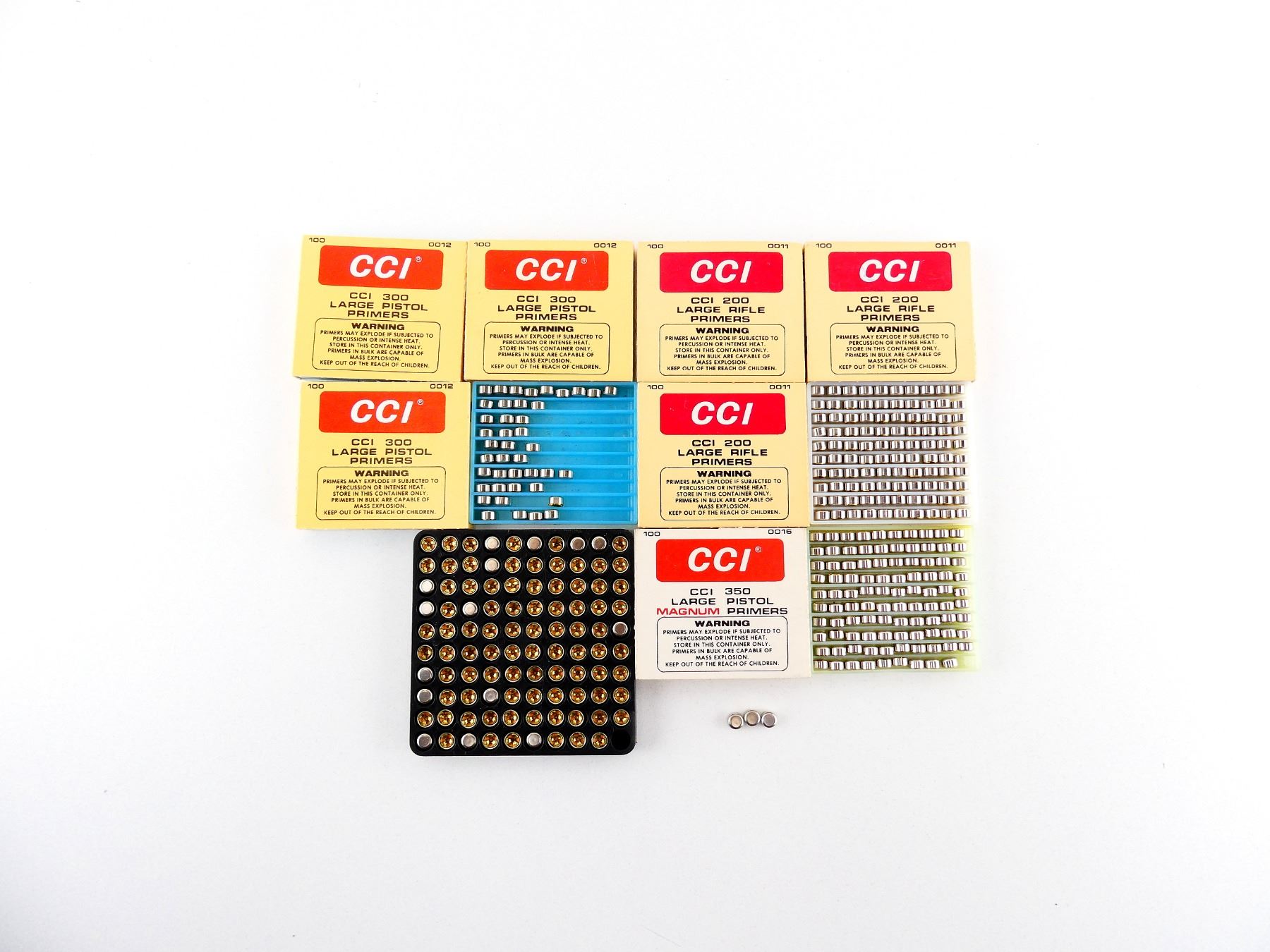 LOT INCLUDES; APPROX. (743) PRIMERS, VARIOUS SIZES INCLUDING; CCI 200 LARGE RIFLE, CCI 300 LARGE PISTOL, CCI 350 LARGE PISTOL MAGNUM, ETC.