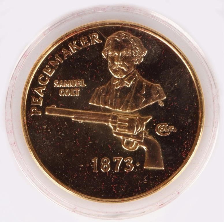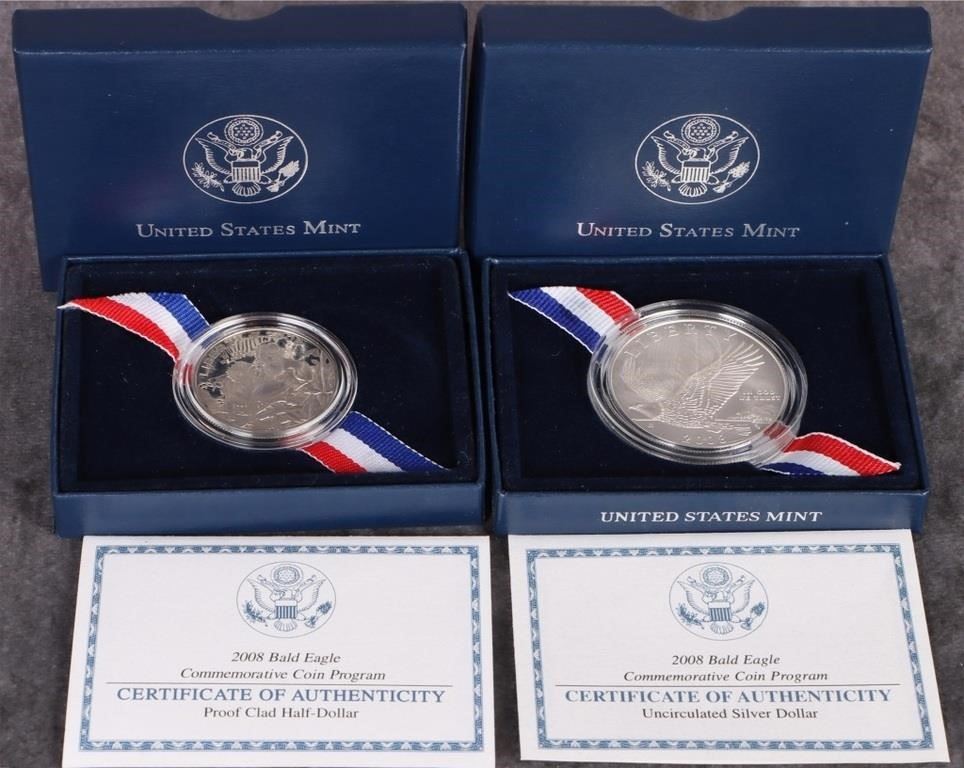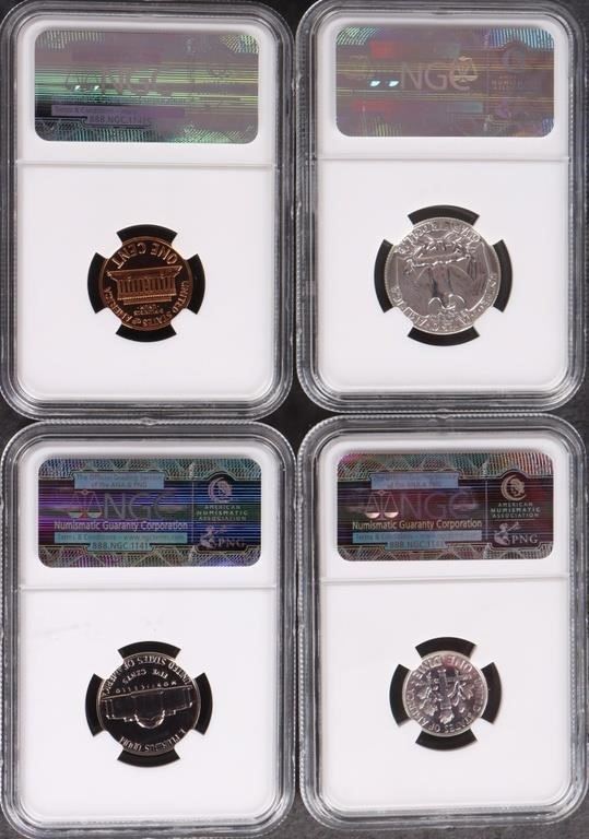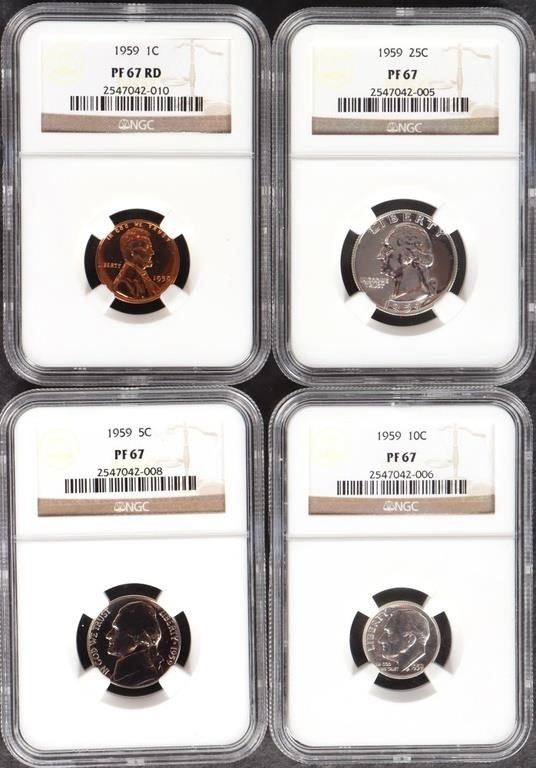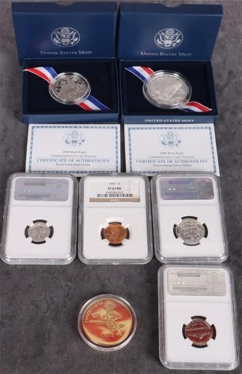 Assorted Proof/ Mint State uncirculated U.S. coinage lot to include an NGC Proof-67 1959 P quarter, dime, nickel and penny (Red proof), one 24K gold plated Samuel Colt 1873 Peacemaker commemorative coin, one 2008 Bald Eagle Silver Uncirculated Dollar, and one 2008 Bald Eagle Clad Proof Half Dollar.
