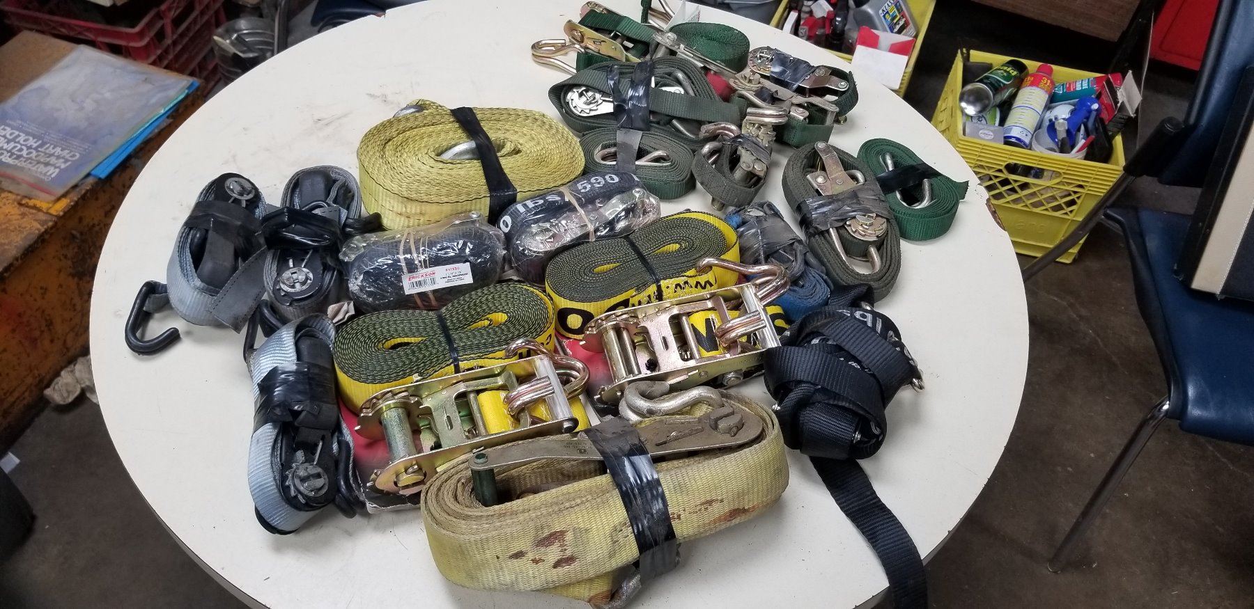ASSORTED RATCHET STRAPS- 5,000LBS X2, 1,300LBS X2, OTHER MISC STAPS, AND TOW ROPE