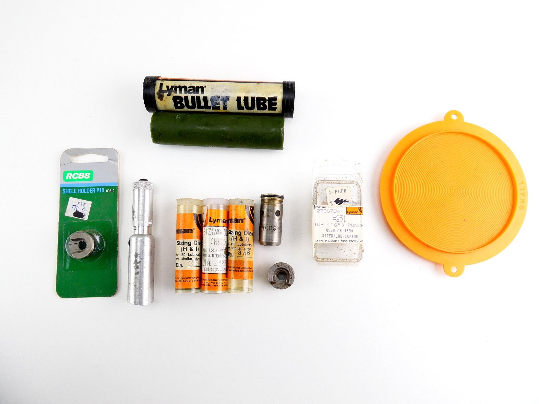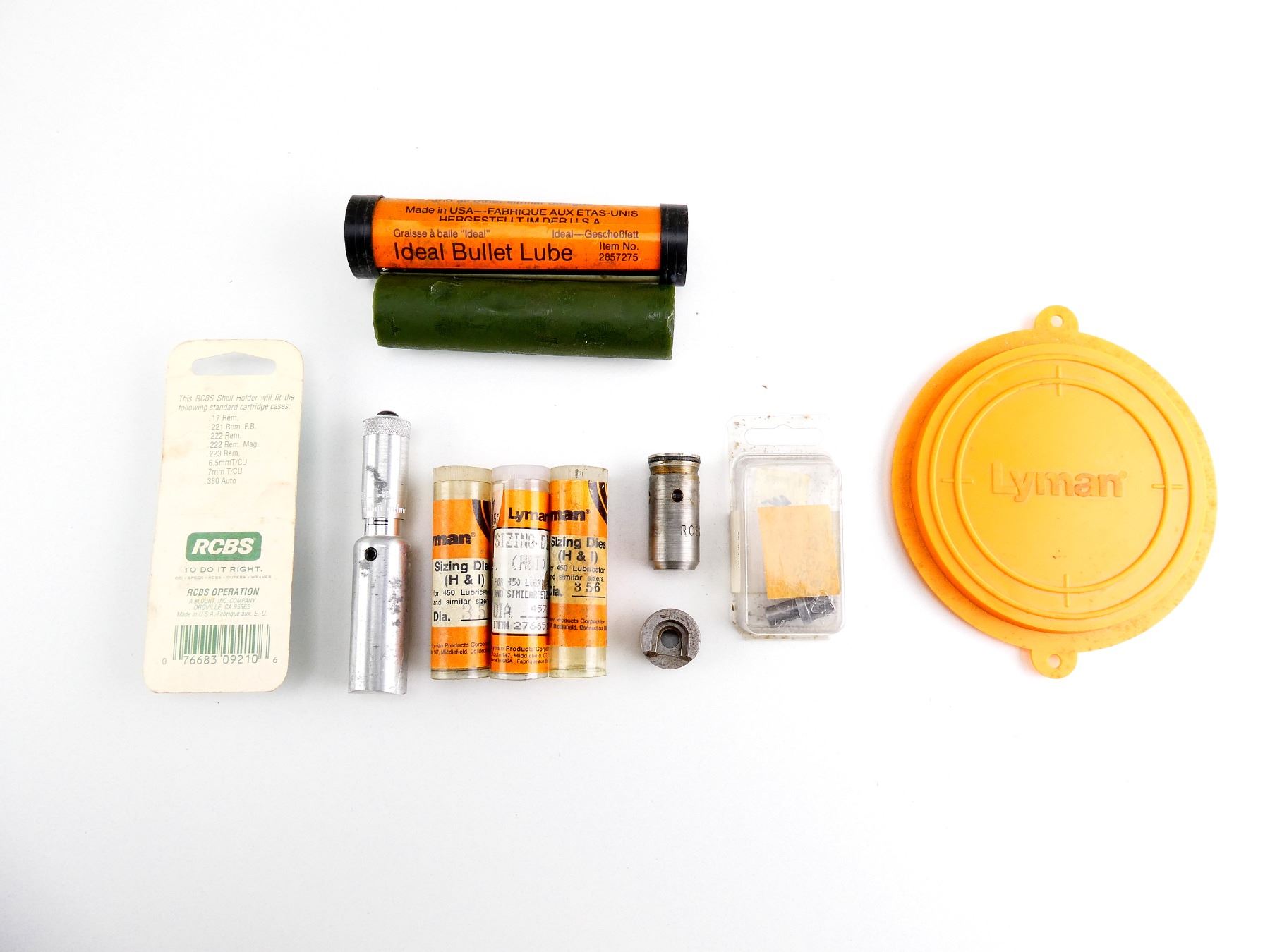 LOT INCLUDES; (2) ASSORTED RCBS BULLET SIZER DIES, (1) LYMAN TOP PUNCH # 251, APPEARS NOS IN ORIGINAL SEALED PACKAGING, (3) ASSORTED LYMAN SIZING DIES, (1) USED LYMAN BULLET LUBE, (1) USED RCBS BULLET LUBRICANT, (1) RCBS #10 SHELL HOLDER, APPEARS NOS IN ORIGINAL SEALED PACKAGING, (1) UNKNOWN #11 SHELL HOLDER, ETC. SEE PHOTOS.