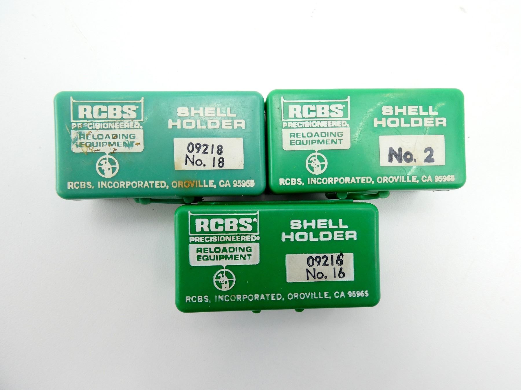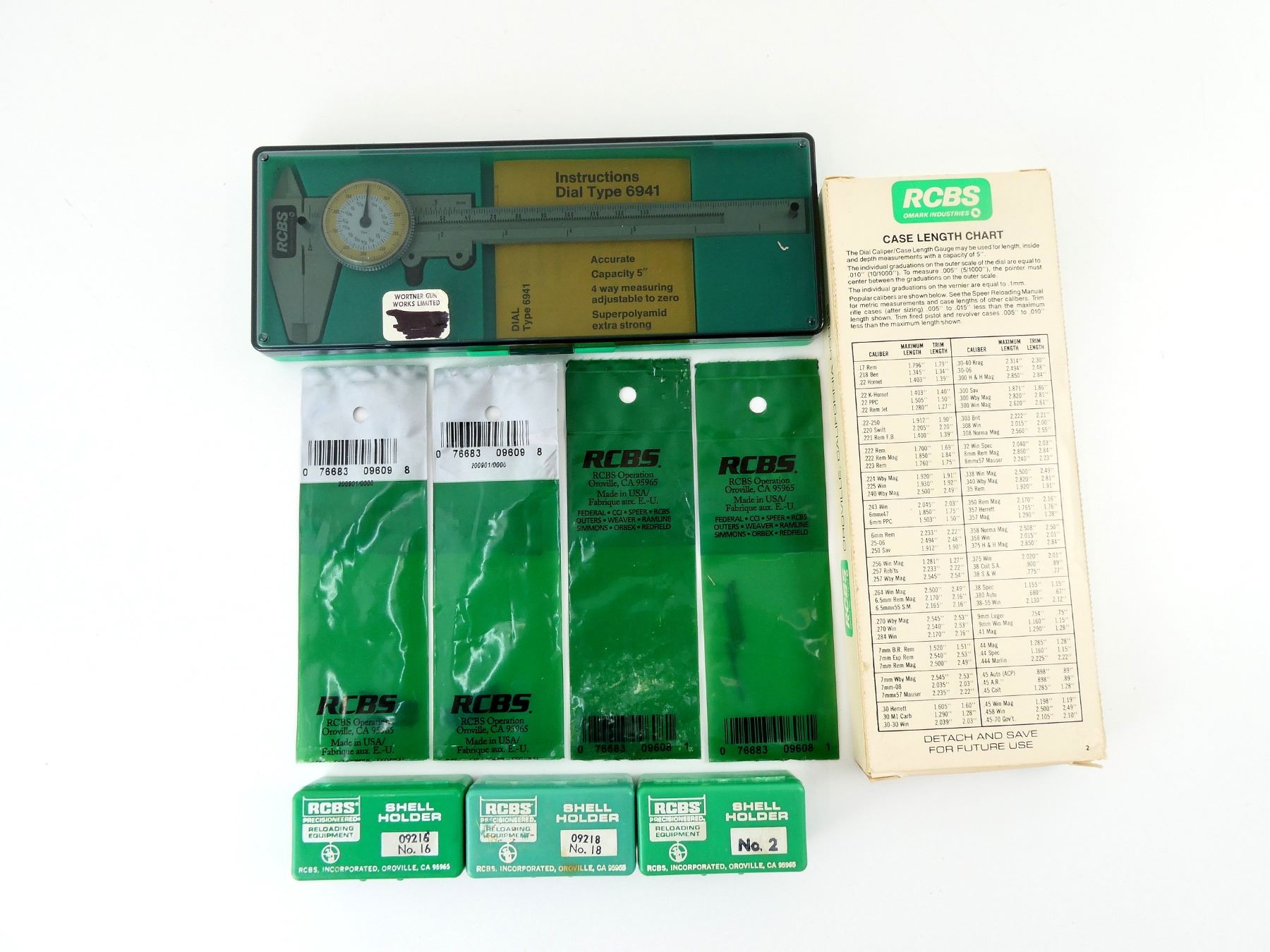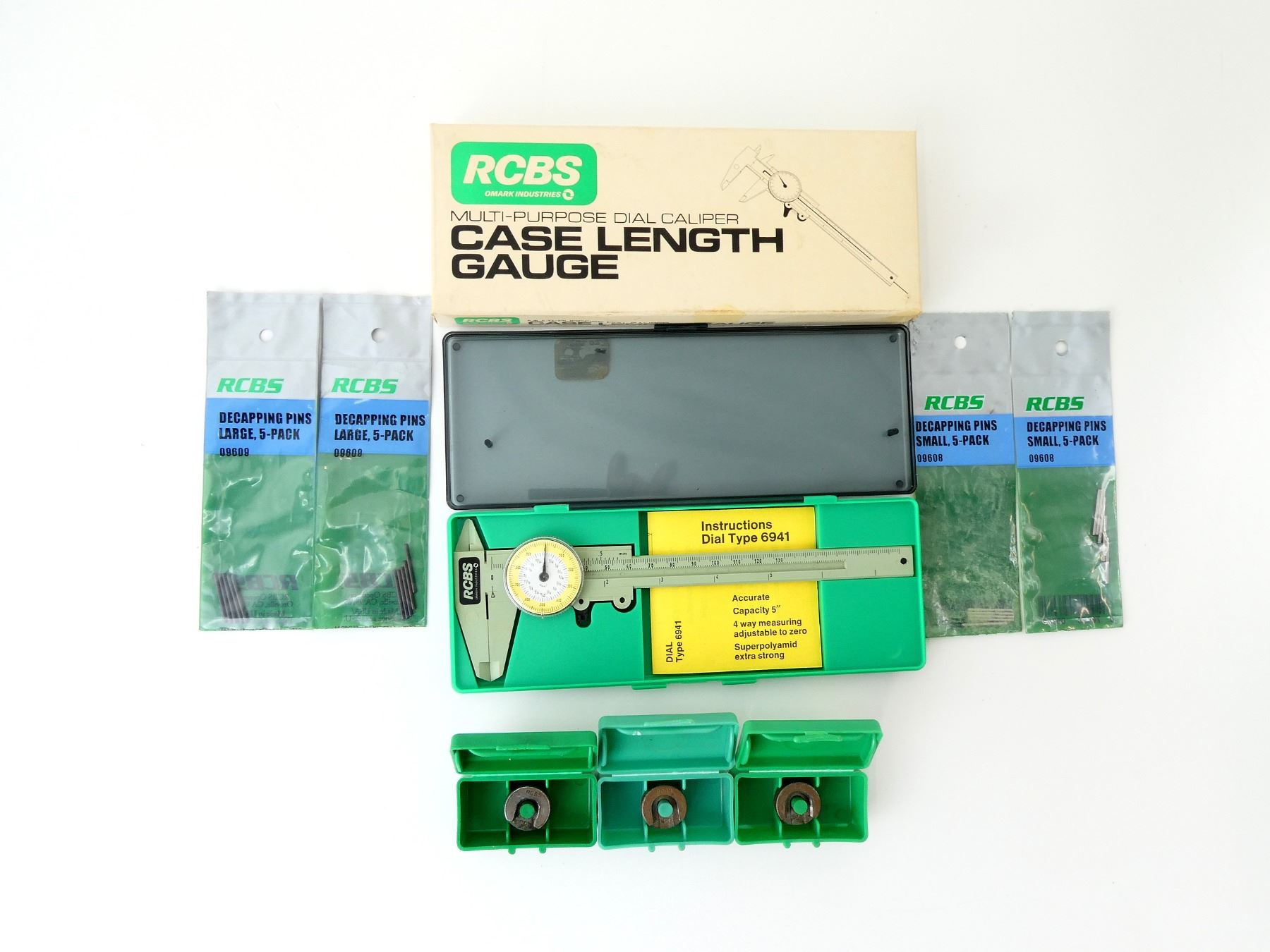 LOT INCLUDES; (2) PACKAGES OF 5 SMALL DECAPPING PINS, NOS, (2) PACKAGES OF 5 LARGE DECAPPING PINS, NOS, (1) #2 SHELL HOLDER WITH CASE, (1) #18 SHELL HOLDER WITH CASE, (1) #16 SHELL HOLDER WITH CASE & (1) MULTI-PURPOSE DIAL CALIPER CASE LENGTH GAUGE, IN ORIGINAL PACKAGING, APPEARS NOS. SEE PHOTOS.