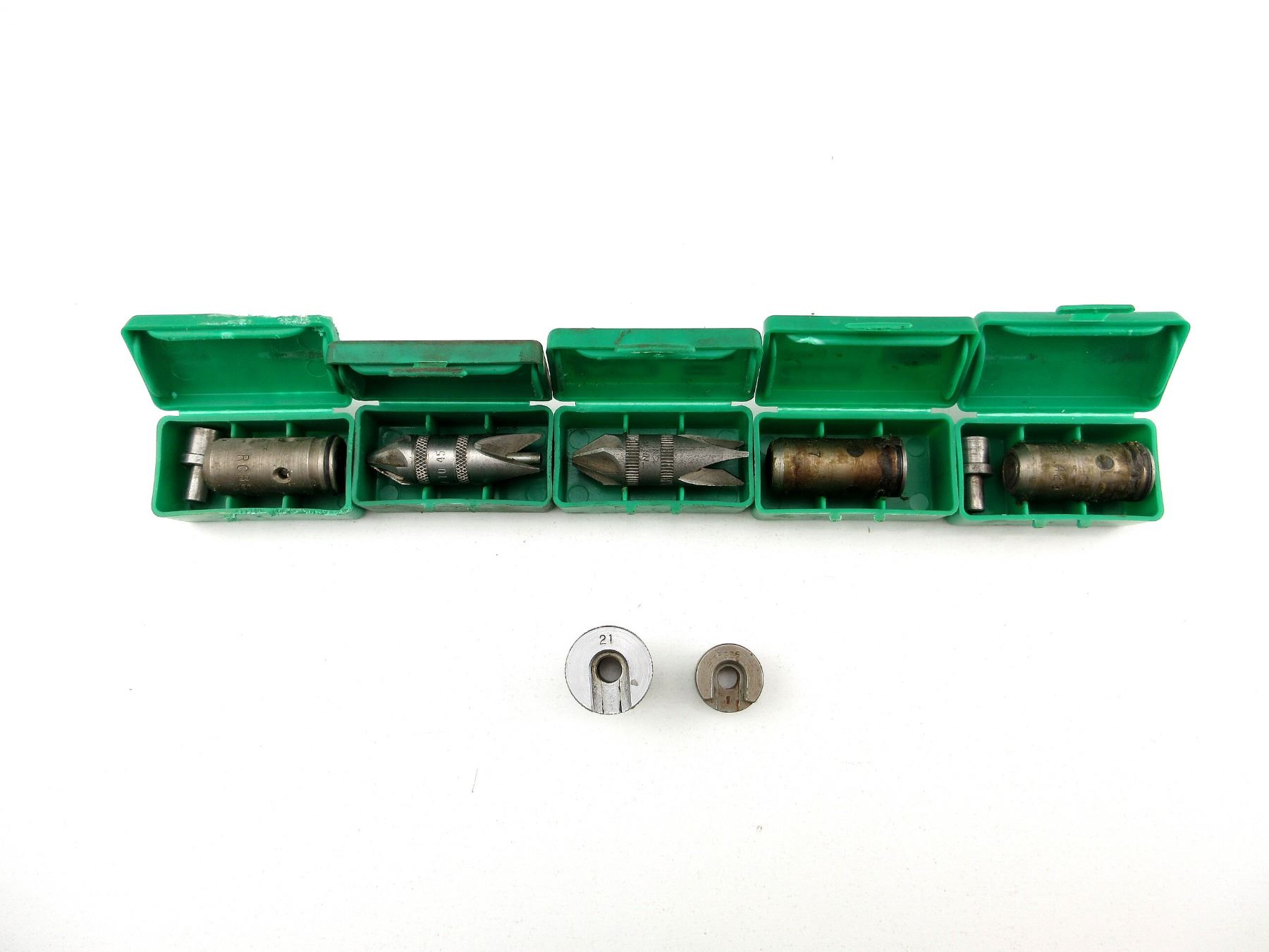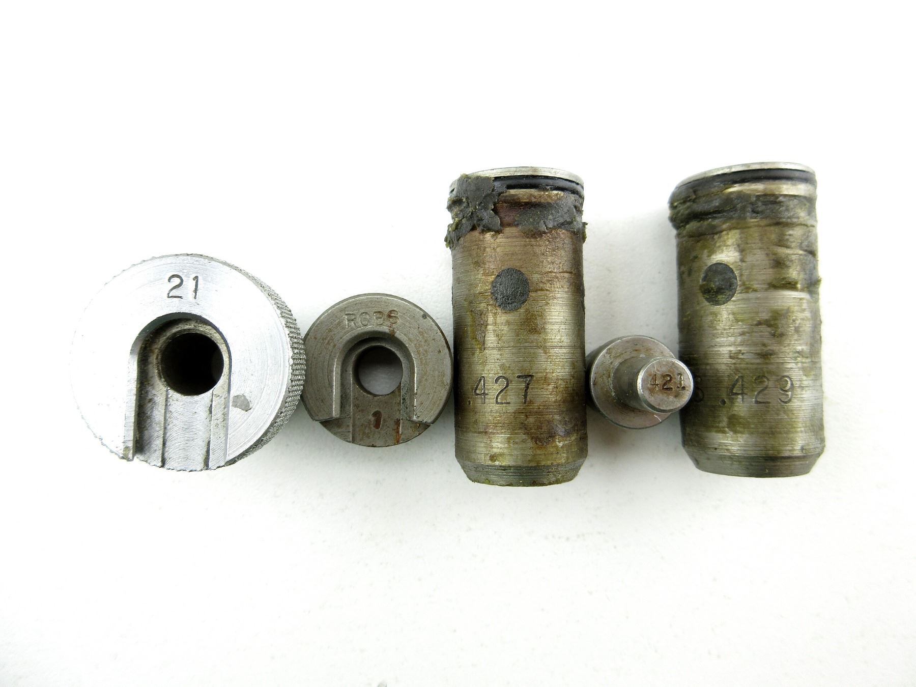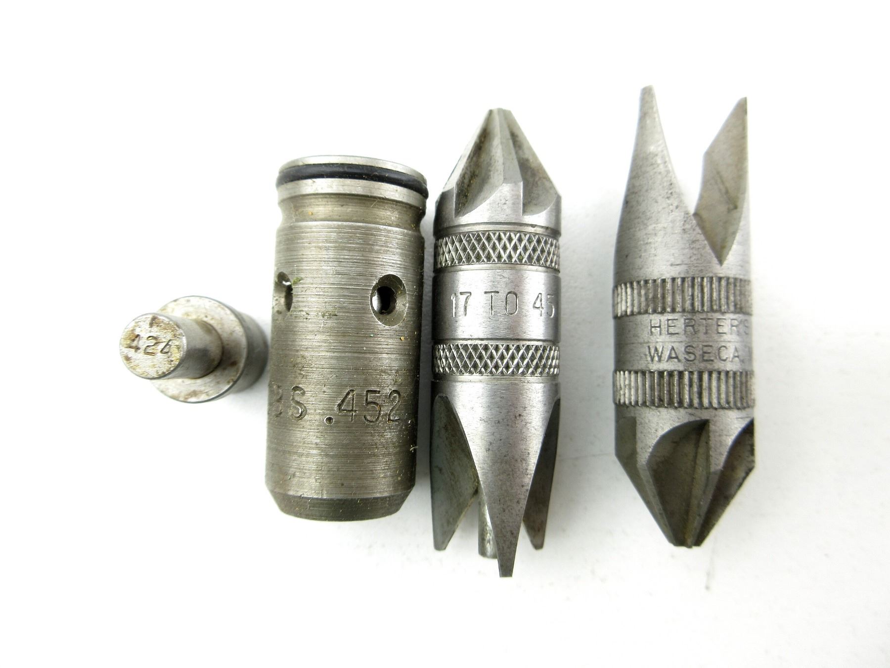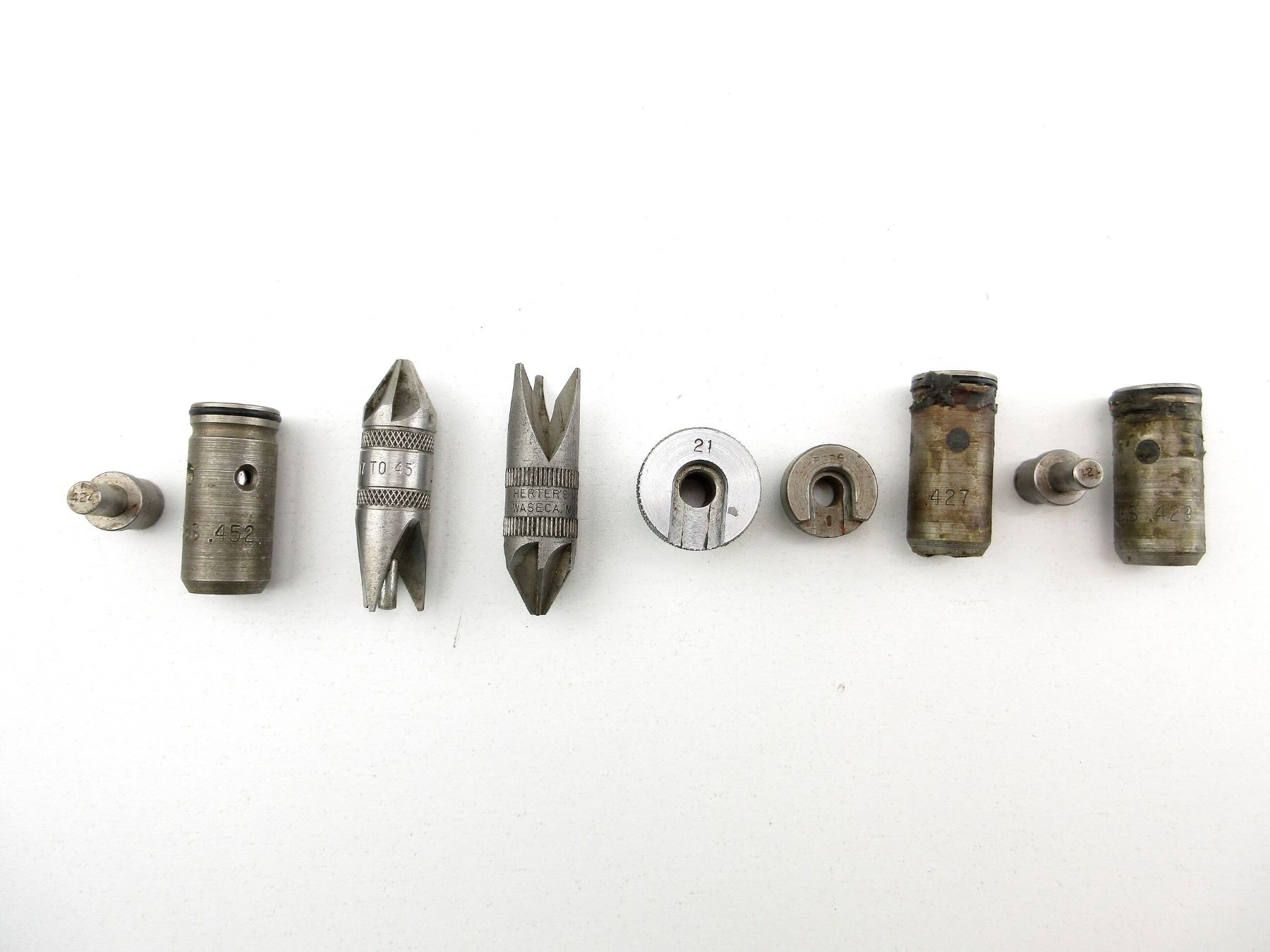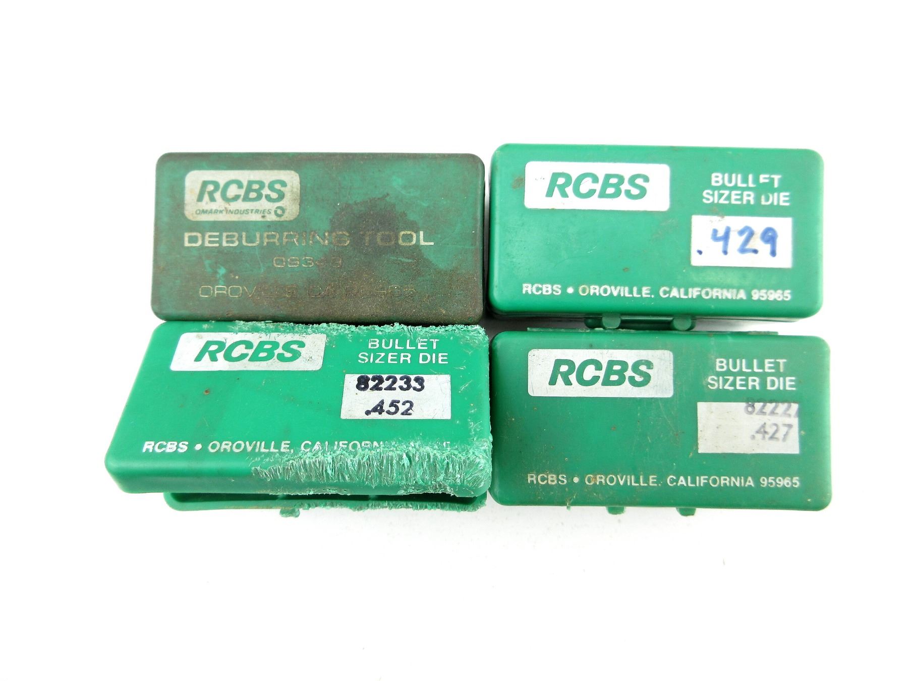 LOT INCLUDES; (1) RCBS .429 BULLET SIZER DIE WITH .421 TOP PUNCH, (1) RCBS .427 BULLET SIZER DIE, (1) RCBS .452 BULLET SIZER DIE WITH .424 TOP PUNCH, (1) L.E. WILSON / RCBS .17 TO .45 DEBURRING TOOL, (1) HERTER'S DEBURRING TOOL & (2) SHELL HOLDERS, RCBS #1 & UNKNOWN #21. SEE PHOTOS.
