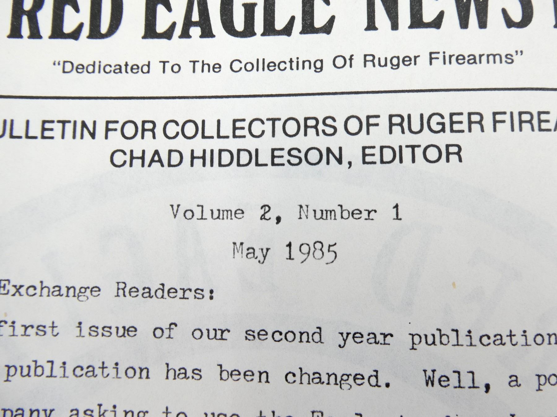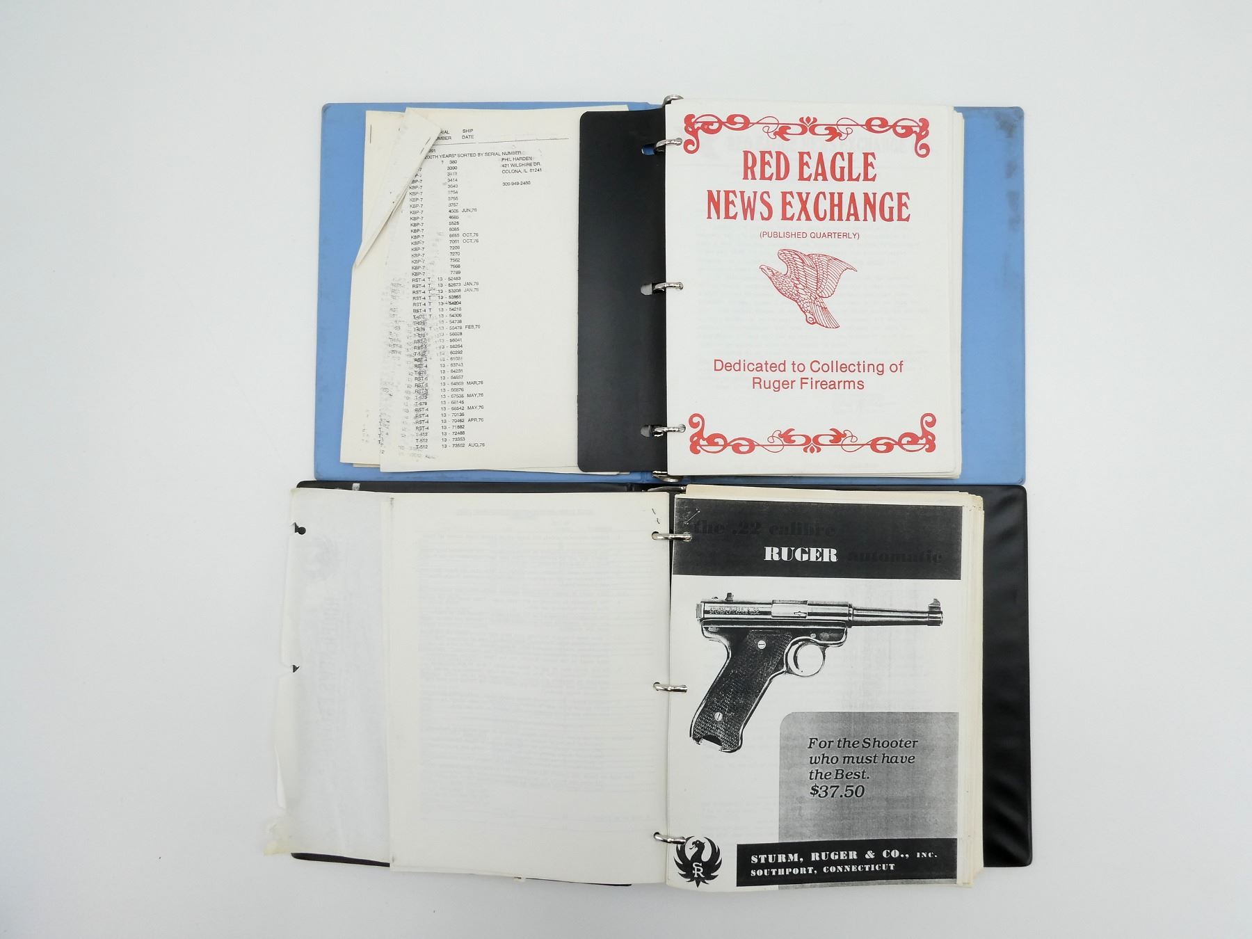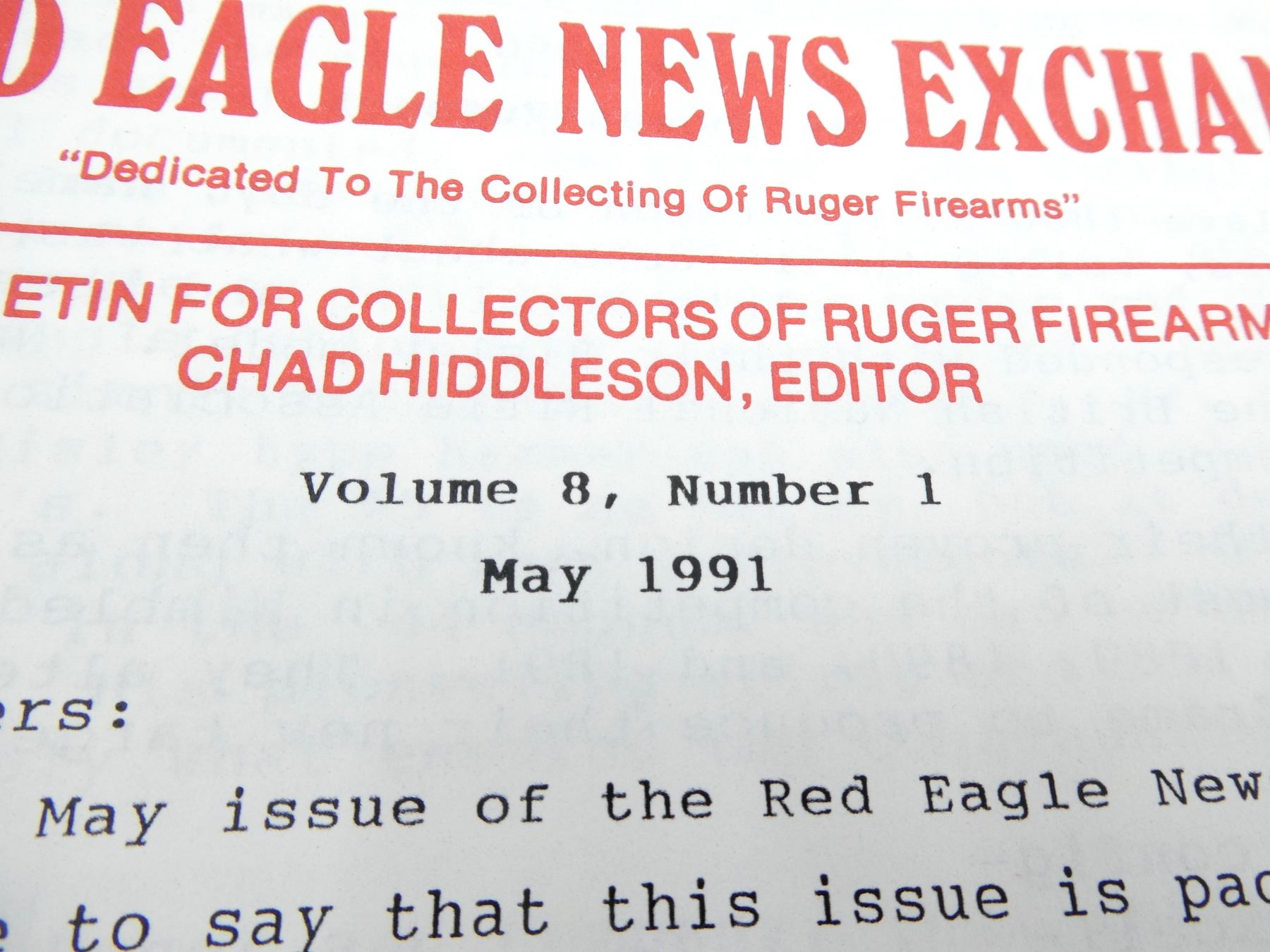 LOT INCLUDES; (2) BINDERS OF "RED EAGLE NEWS EXCHANGE", DEDICATED TO COLLECTING OF RUGER FIREARMS SERIES, VOLUME 1, NUMBER 1, MAY 1984 TO VOLUME 13, NUMBER 1 MAY 1996, SERIES NOT COMPLETE / SOME ISSUES MISSING / MAY CONTAIN DUPLICATES. SEE PHOTOS.