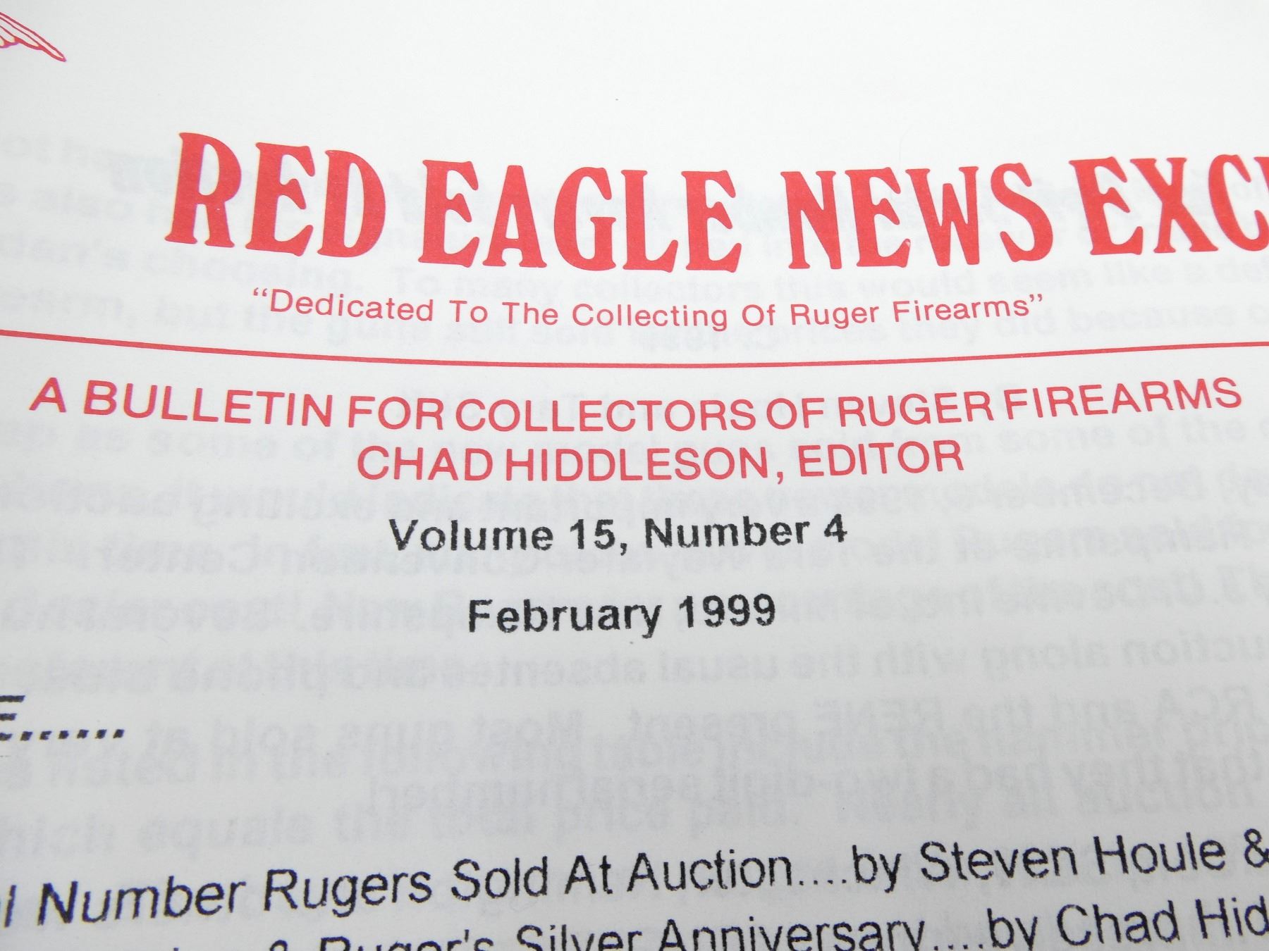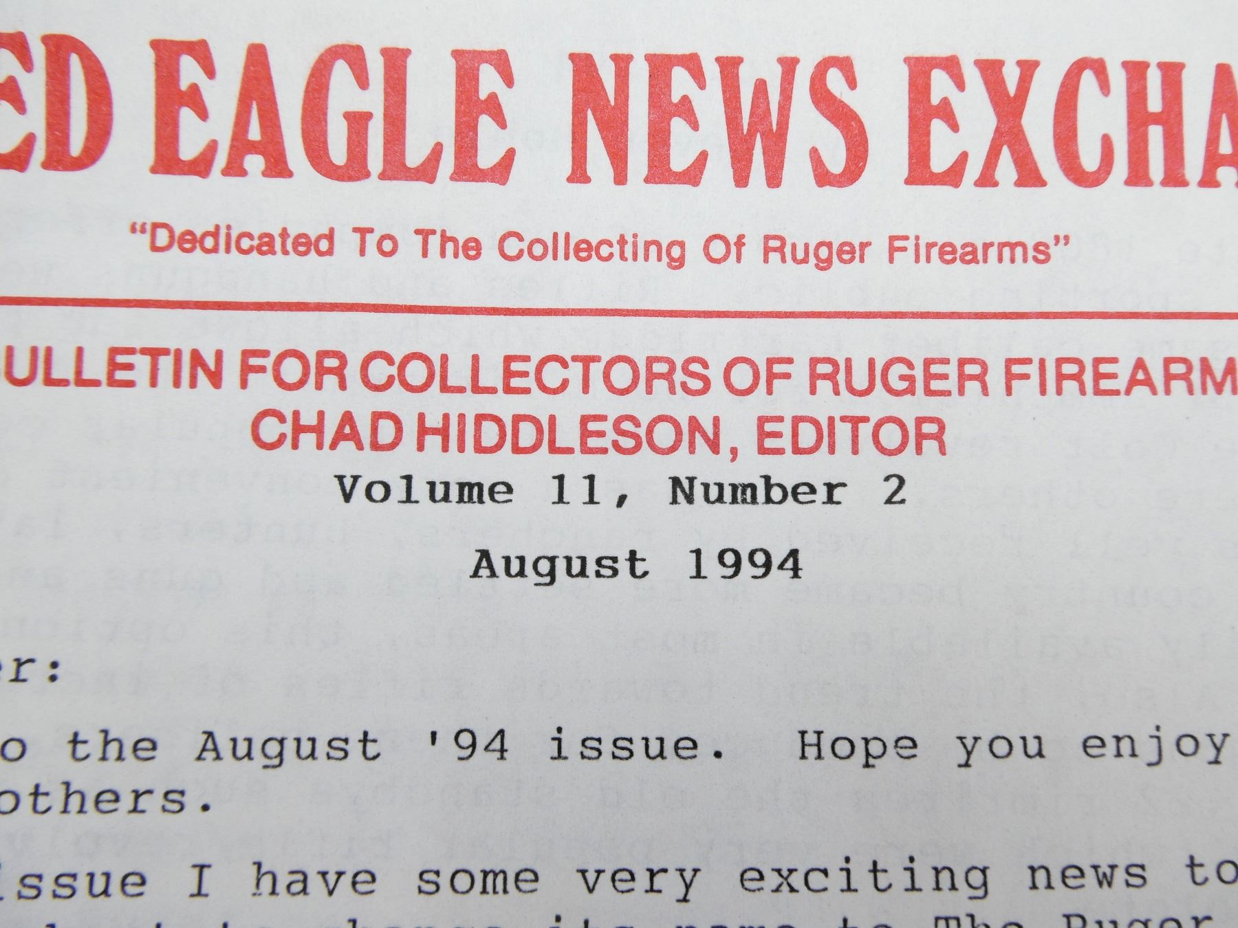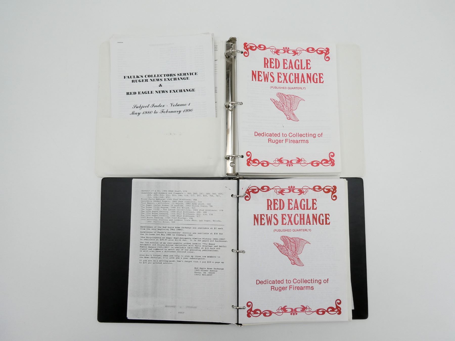 LOT INCLUDES; (2) BINDERS OF "RED EAGLE NEWS EXCHANGE", DEDICATED TO COLLECTING OF RUGER FIREARMS SERIES, VOLUME 11, NUMBER 2, AUGUST 1994 TO VOLUME 18, NUMBER 2, AUGUST 2001, SERIES NOT COMPLETE / SOME ISSUES MISSING / MAY CONTAIN DUPLICATES. SEE PHOTOS.