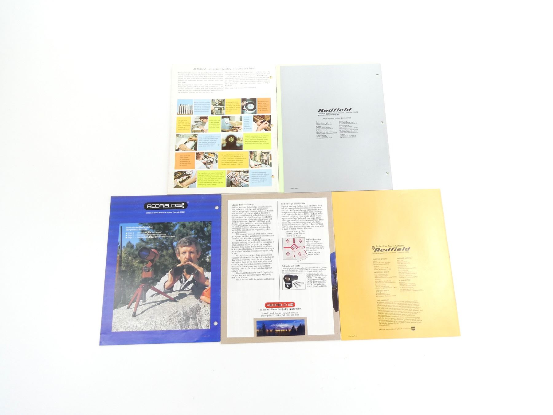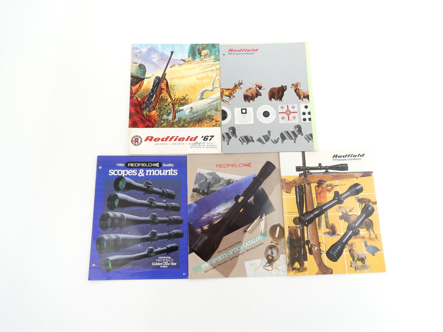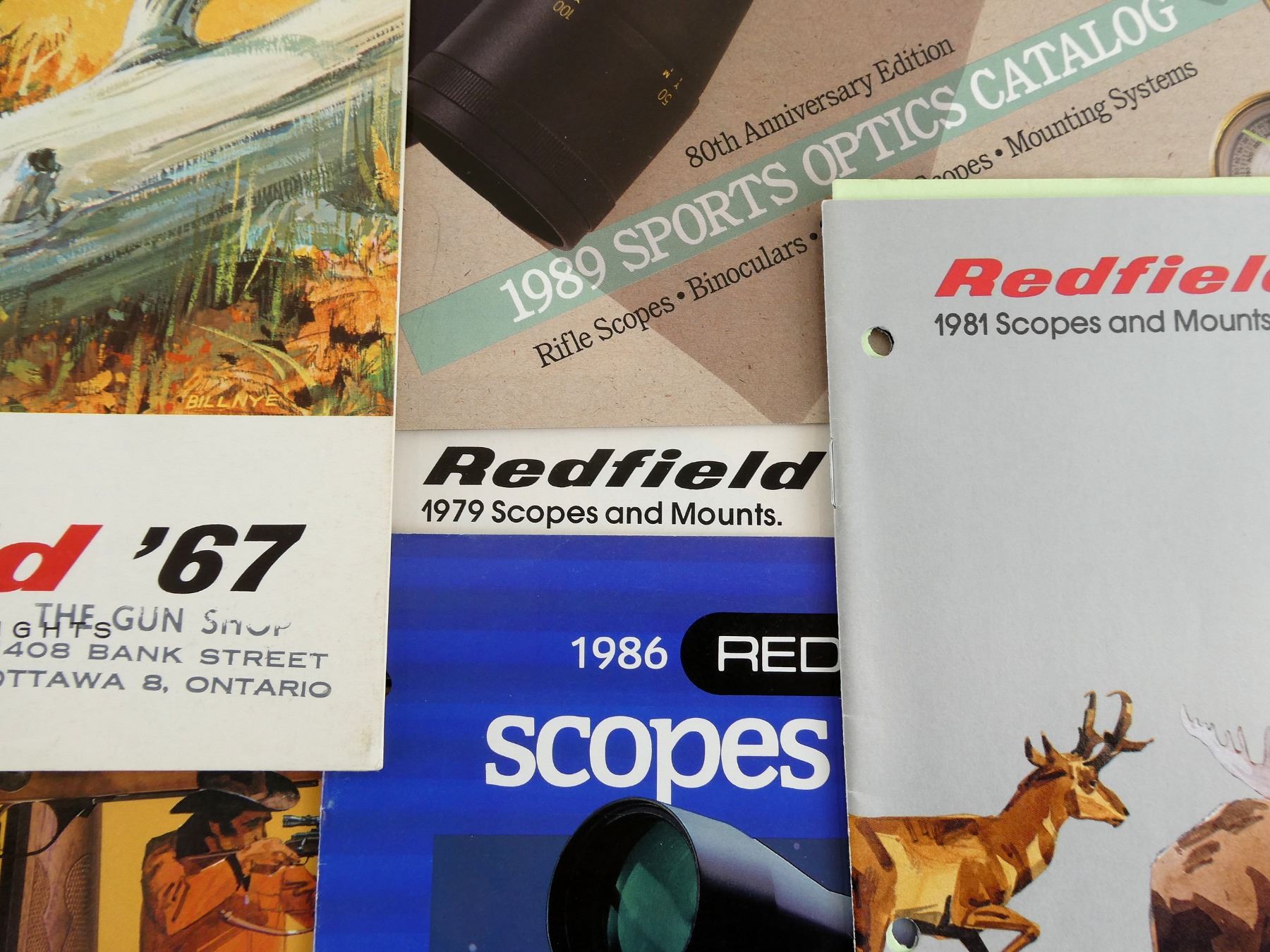 SOFT COVERS, LOT INCLUDES; (1) "REDFIELD, 80TH ANNIVERSARY EDITION, 1989 SPORTS OPTICS CATALOG" CATALOGUE, (1) "REDFIELD 1986 SCOPES AND MOUNTS" CATALOGUE, (1) "REDFIELD 1981 SCOPES AND MOUNTS" CATALOGUE, COPYRIGHT 1981, (1) "REDFIELD '67 SCOPES, MOUNTS, SIGHTS" CATALOGUE & "REDFIELD 1979 SCOPES AND MOUNTS" CATALOGUE. SEE PHOTOS.