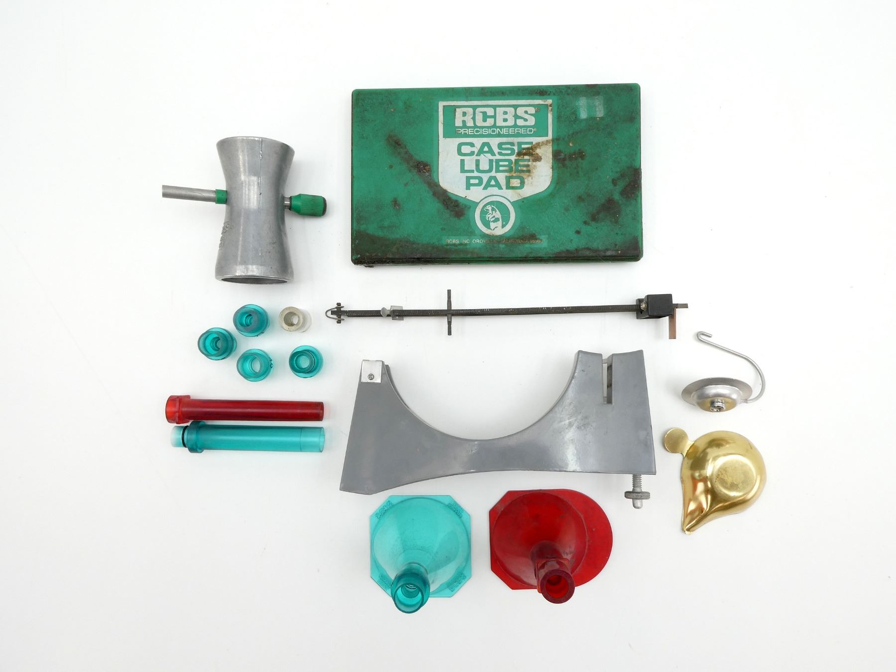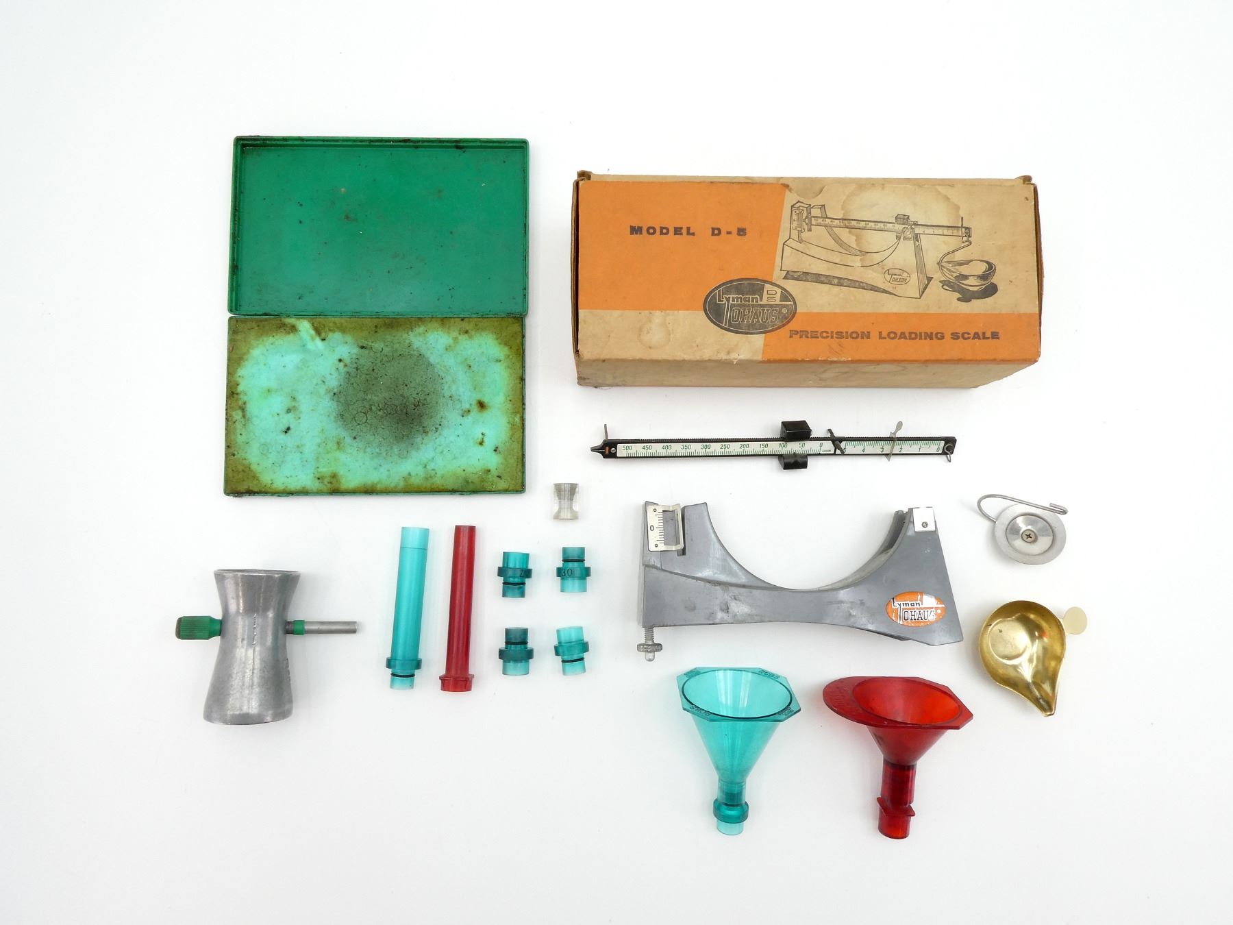 LOT INCLUDES; (1) LYMAN OHAUS MODEL D-5 PRECISION LOADING SCALE, IN ORIGINAL PACKAGING, MAY REQUIRE ADJUSTMENTS AND/OR MAY NOT BE COMPLETE, (1) MTM RED PLASTIC POWDER FUNNEL WITH (2) SPOUTS, ATTACHED SPOUT MARKED: "30", OTHER LONGER SPOUT UN-MARKED, (1) RCBS QUICK CHANGE FUNNEL WITH (6) SPOUTS, #17, #22, #27, #30, #40 & ONE UNKNOWN, (1) UNKNOWN CLEAR PLASTIC SPOUT, NO VISIBLE MARKINGS, (1) RCBS POWDER TRICKLER & (1) RCBS CASE LUBE PAD. SEE PHOTOS.