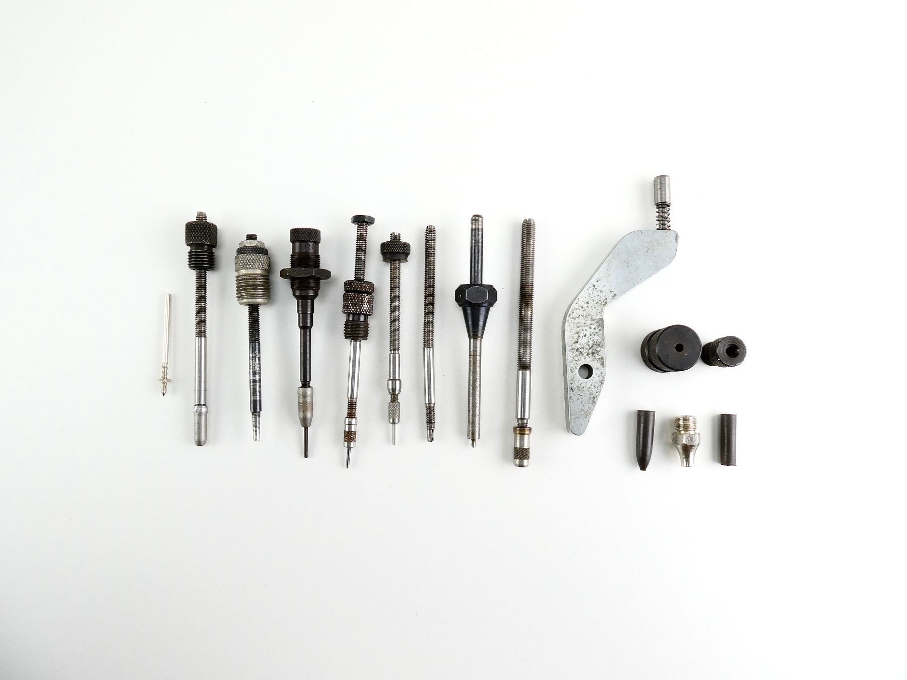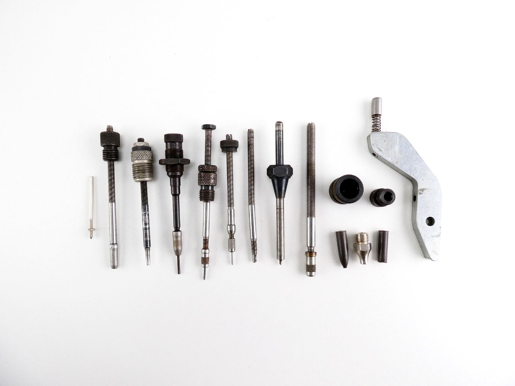 LOT INCLUDES; PRIMING ARM, FLASH HOLE DEBURRING TOOL, 0.260 EXPANDER ROD, 0.220 EXPANDER ROD, 0.305 EXPANDER ROD, 0.240 EXPANDER ROD, VARIOUS DAMAGED PARTS, ETC. SEE PHOTOS.