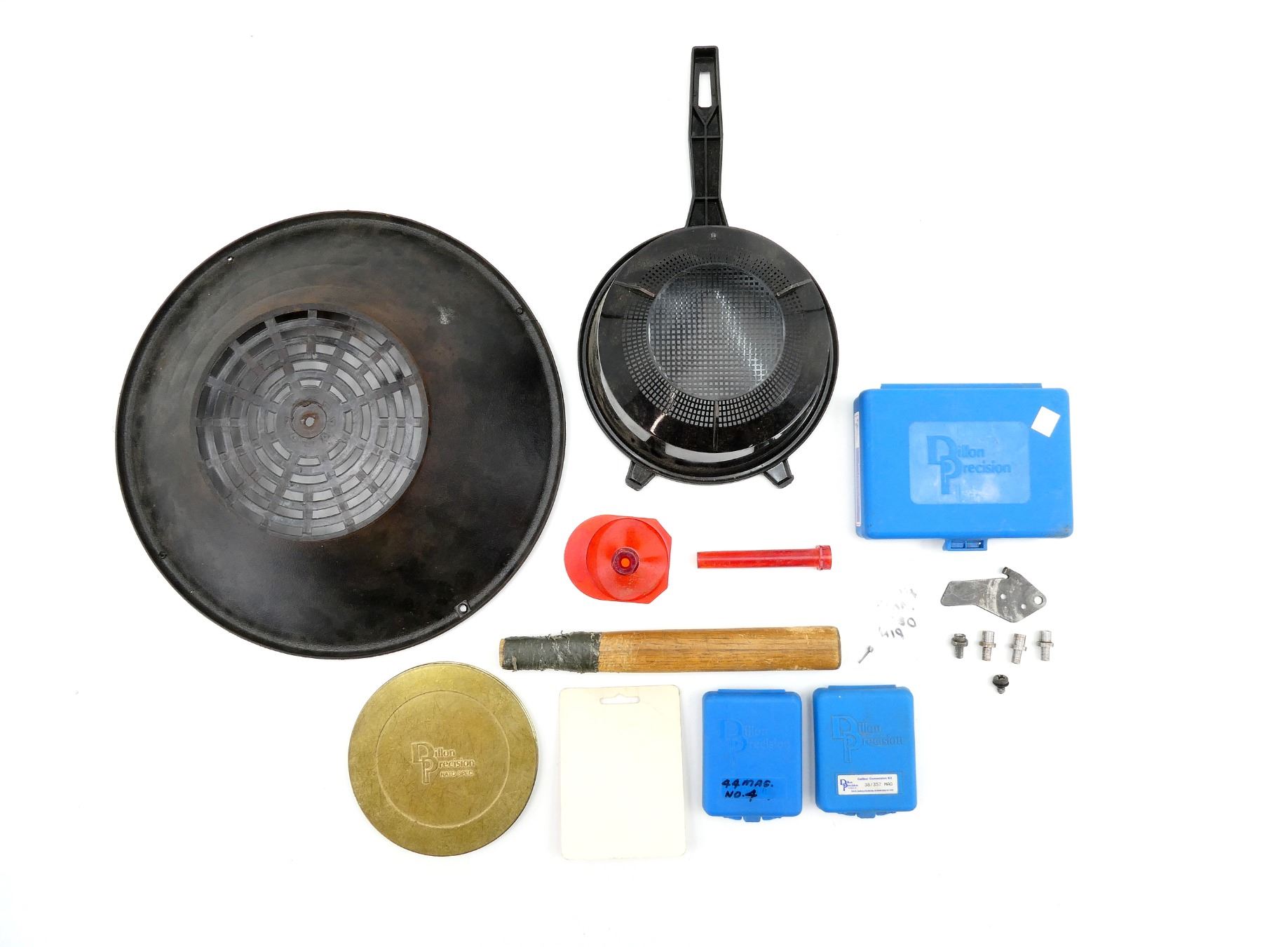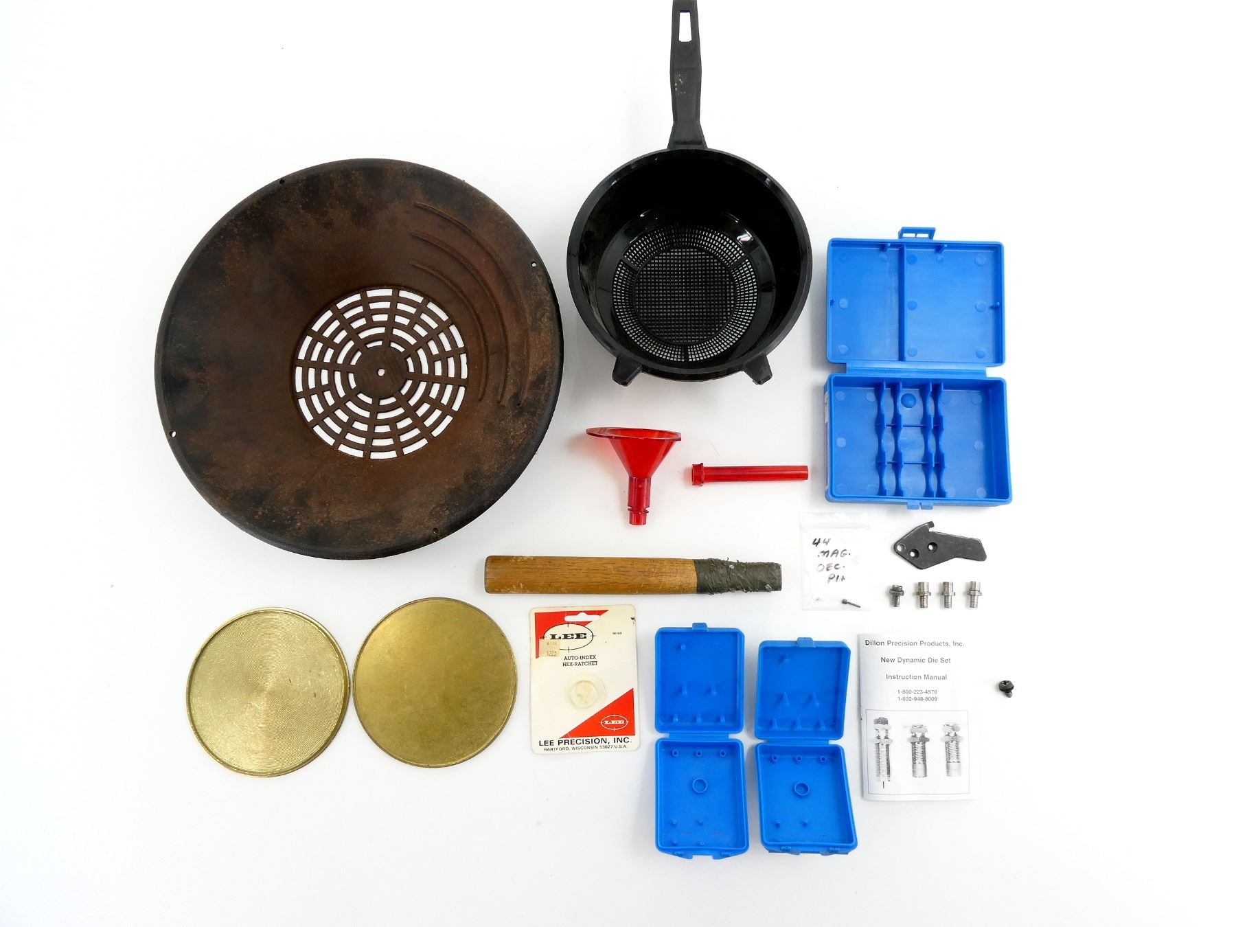 LOT INCLUDES; (2) VARIOUS LARGE SIFTERS FOR BRASS CASINGS, (1) FUNNEL, (1) PACKAGE LEE AUT-INDEX HEX-RATCHET, PART # 90108, (4) ASSORTED TOP PUNCHES, (1) DILLON FLIP-TRAY, EMPTY DILLON CASES, ETC. SEE PHOTOS.