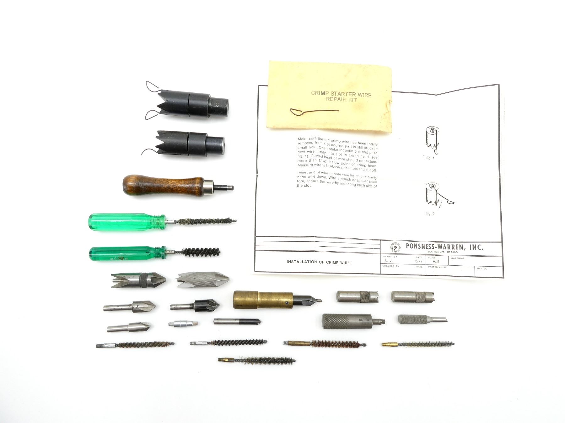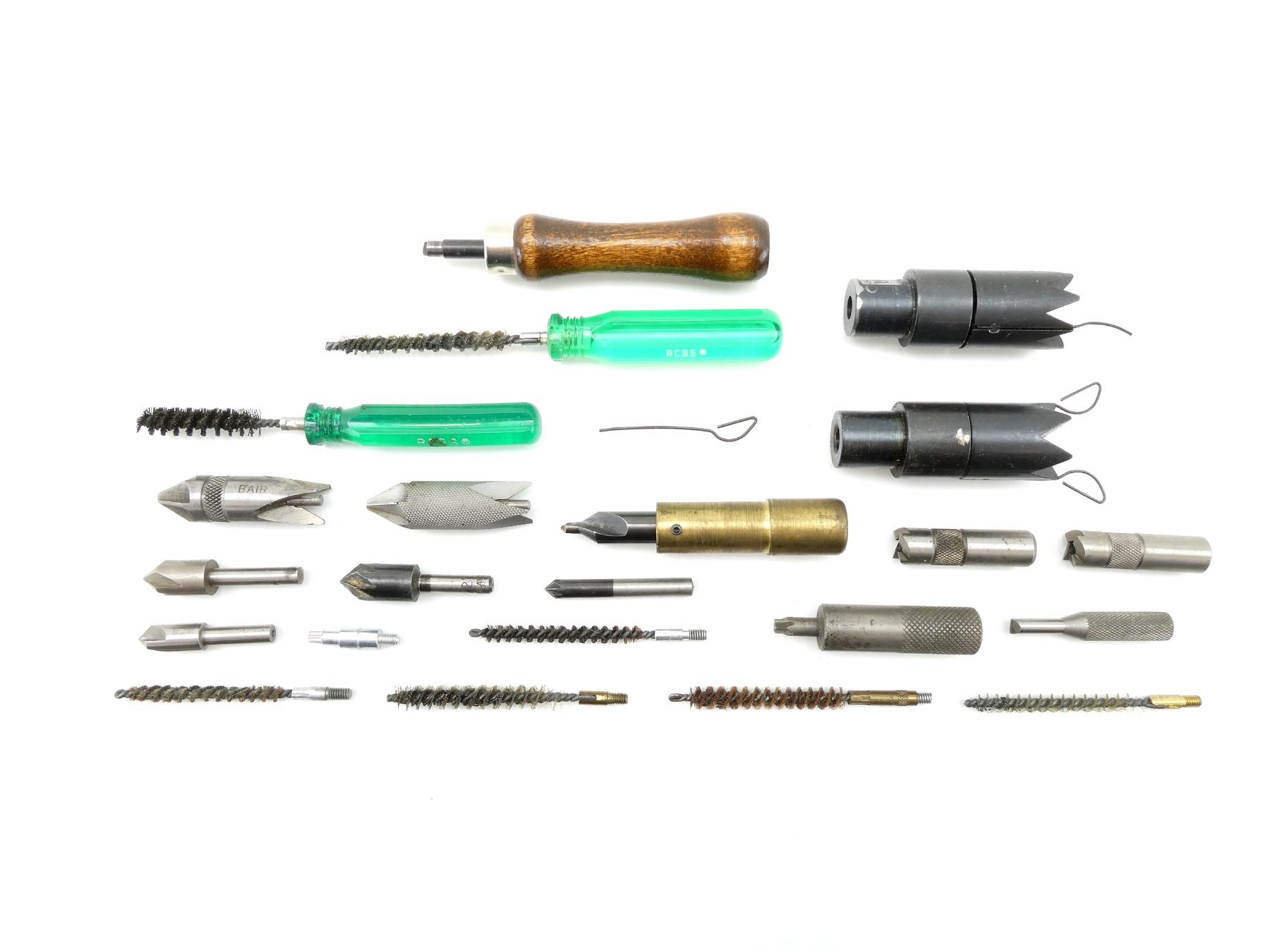 LOT INCLUDES; (2) DEBURRING TOOLS, ONE MARKED: "BAIR", (5) ASSORTED DEBURRING TOOLS, SOME MARKED: "CANADA, 3/8X90 DEGREES, HSG 751", "1/2", ENGLAND", "1/4", COASTAL, GERMANY", ETC., (2) CASE TRIMMERS, (7) WIRE BRUSHES, TWO WITH RCBS HANDLES, (2) CRIMP STARTERS WITH WIRE REPAIR KIT, ETC. SEE PHOTOS.