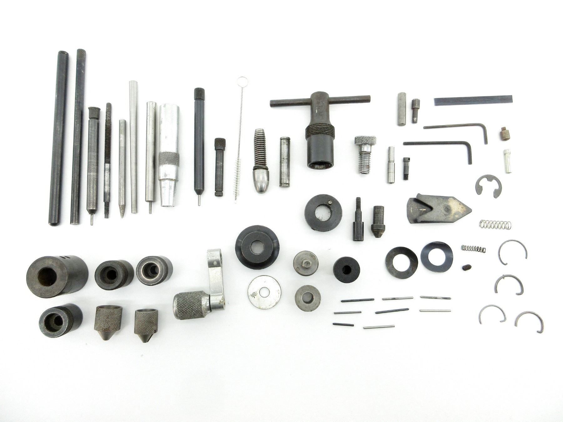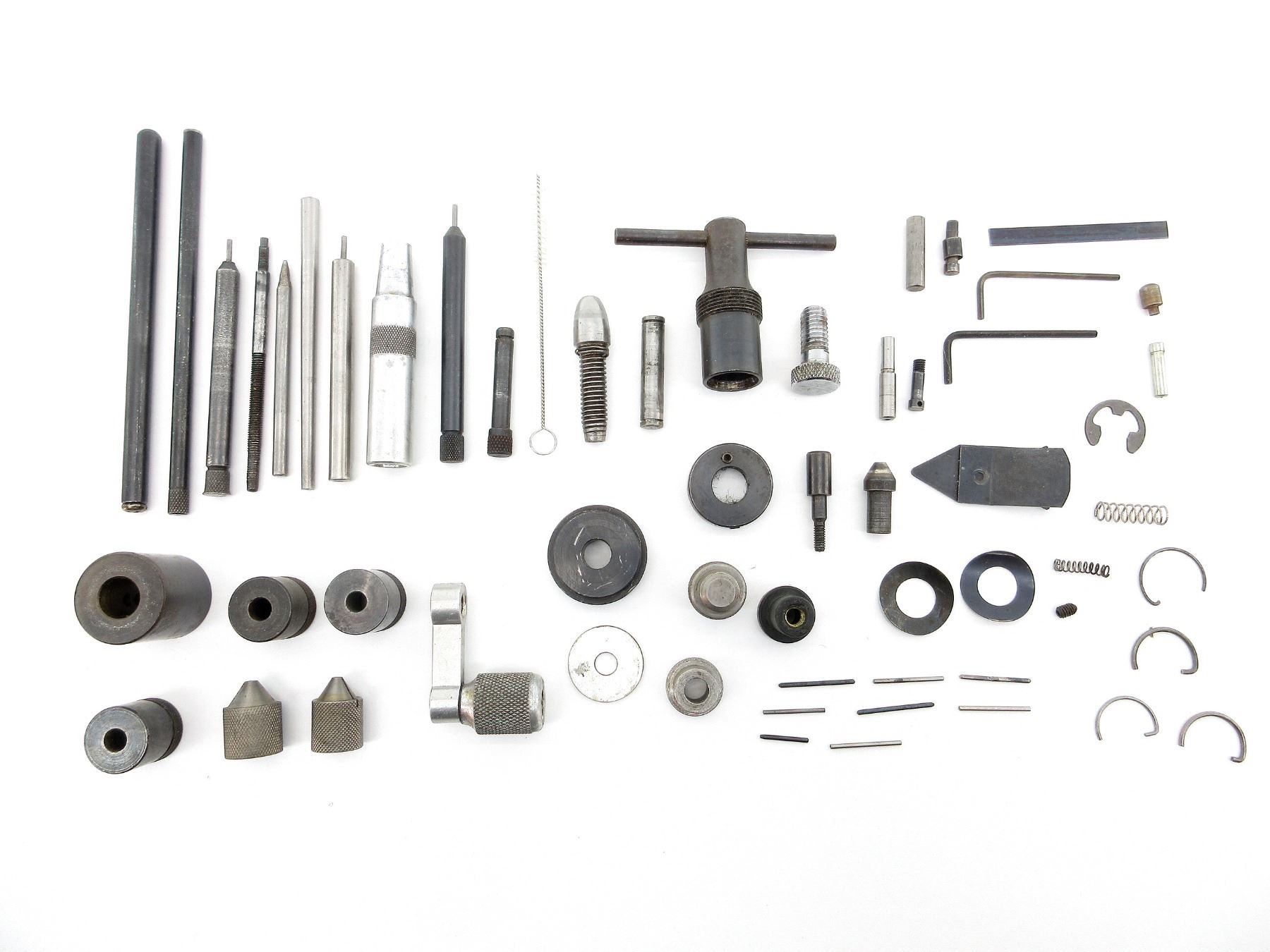 APPROX. (60) PIECES, INCLUDES; ASSORTED SIZED BUSHINGS, DECAPPING RODS, DECAPPING PINS, DEBURRING TOOLS, VARIOUS SPRINGS, VARIOUS PINS, VARIOUS SCREWS, FUNNEL, WRENCH, ALLEN KEYS, ETC. SEE PHOTOS.