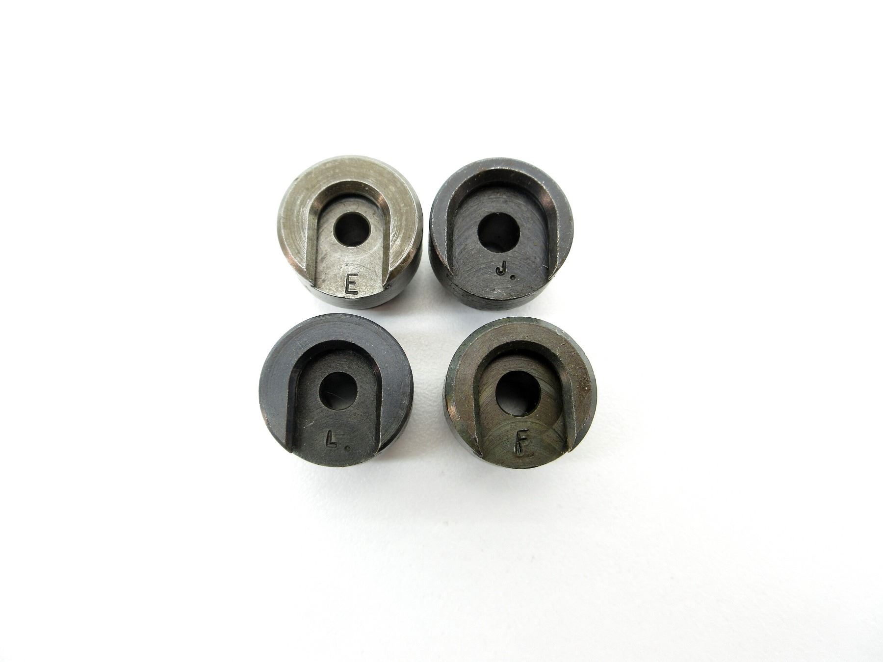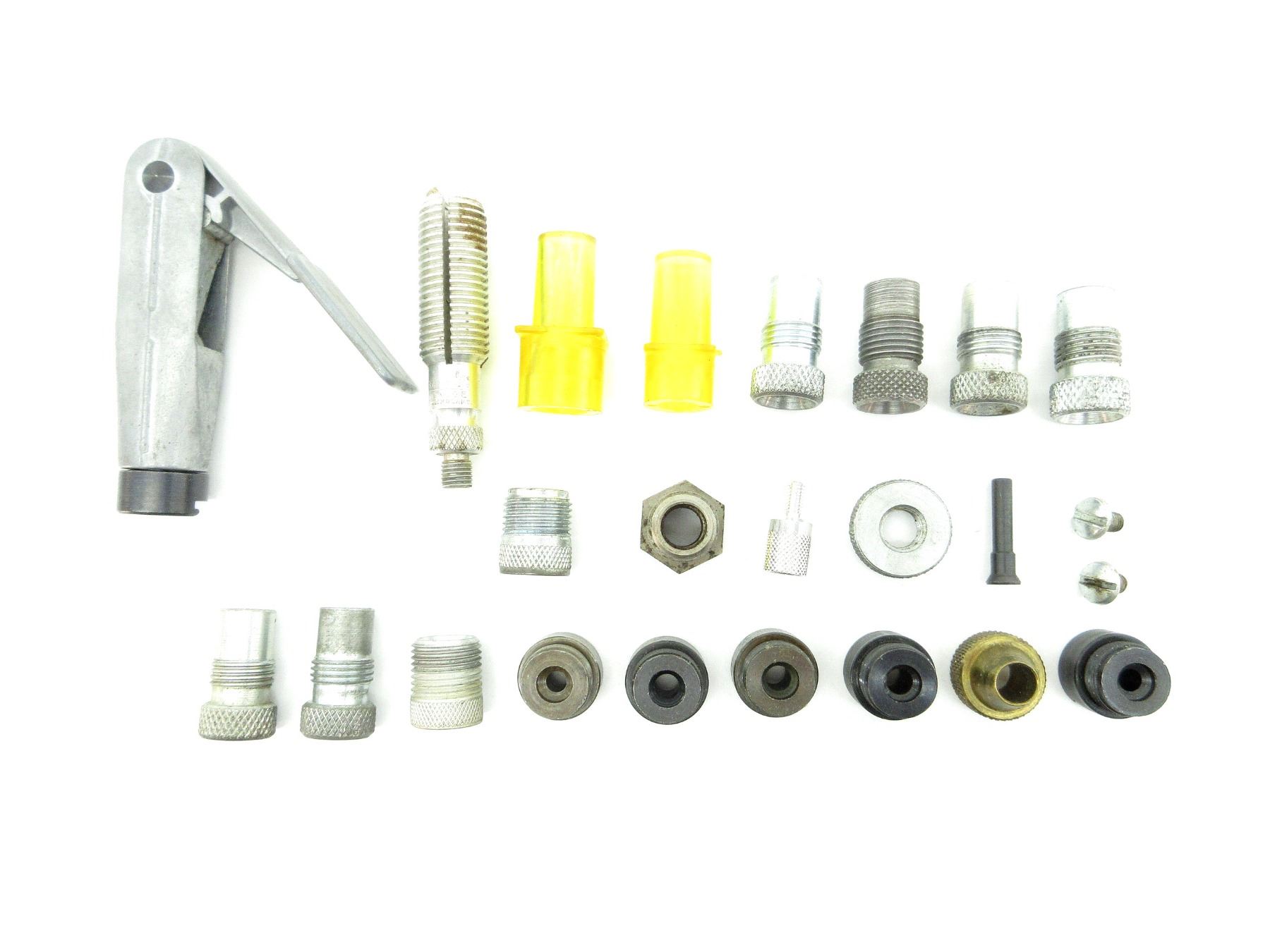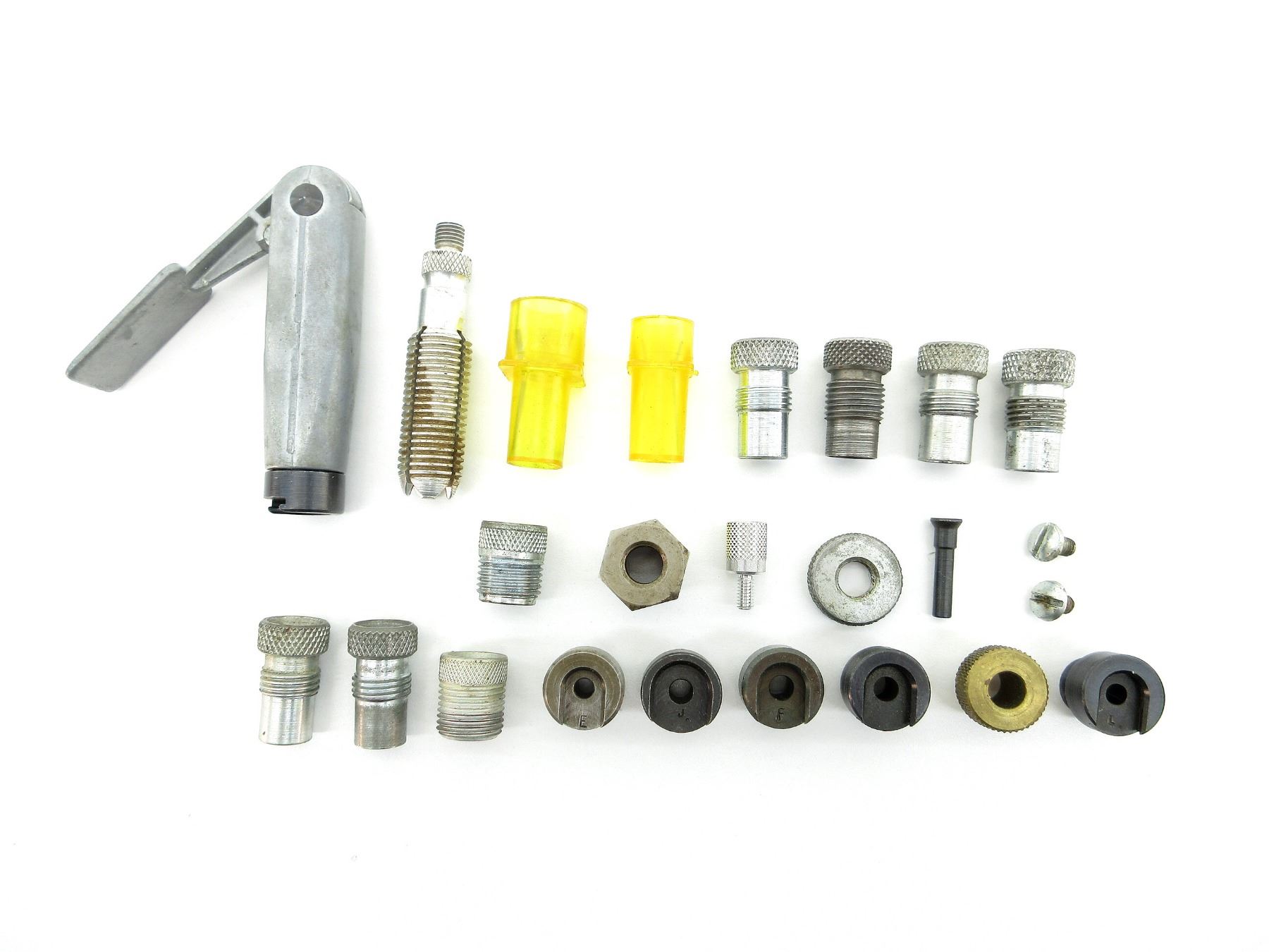 LOT INCLUDES; (1) LYMAN .310 HAND PRIMING TOOL WITH "K" SHELL HOLDER ATTACHED, (5) .310 SHELL HOLDERS, E, F, F, J, L, (8) METAL / PLASTIC FUNNEL SPOUTS, YELLOW PLASTIC FUNNEL SPOUTS MARKED: "30", "222", NO VISIBLE MARKINGS ON METAL SPOUTS, (1) LOCKING RING, (2) SCREWS, ETC. SEE PHOTOS.