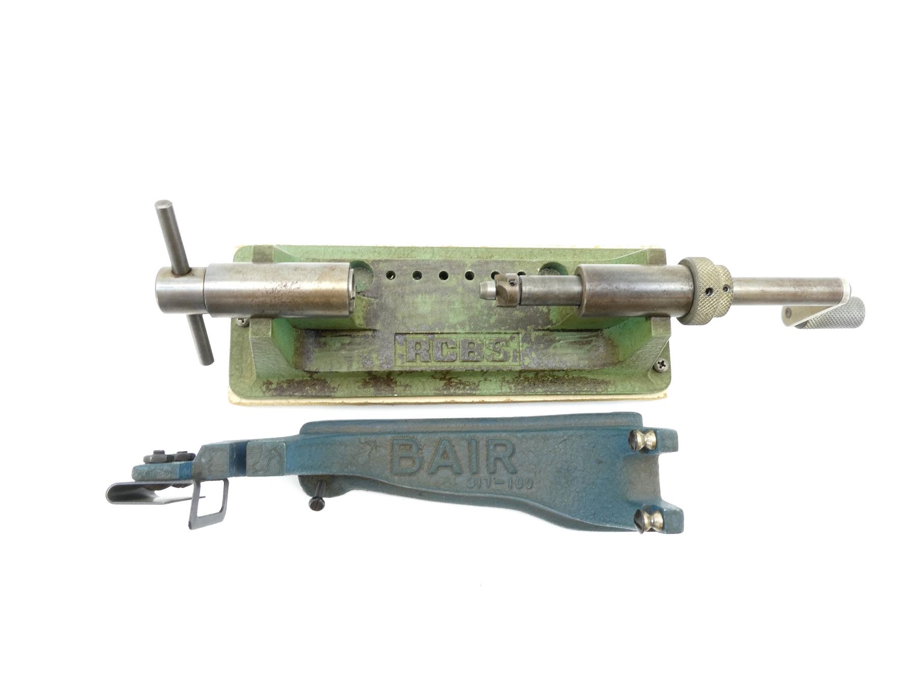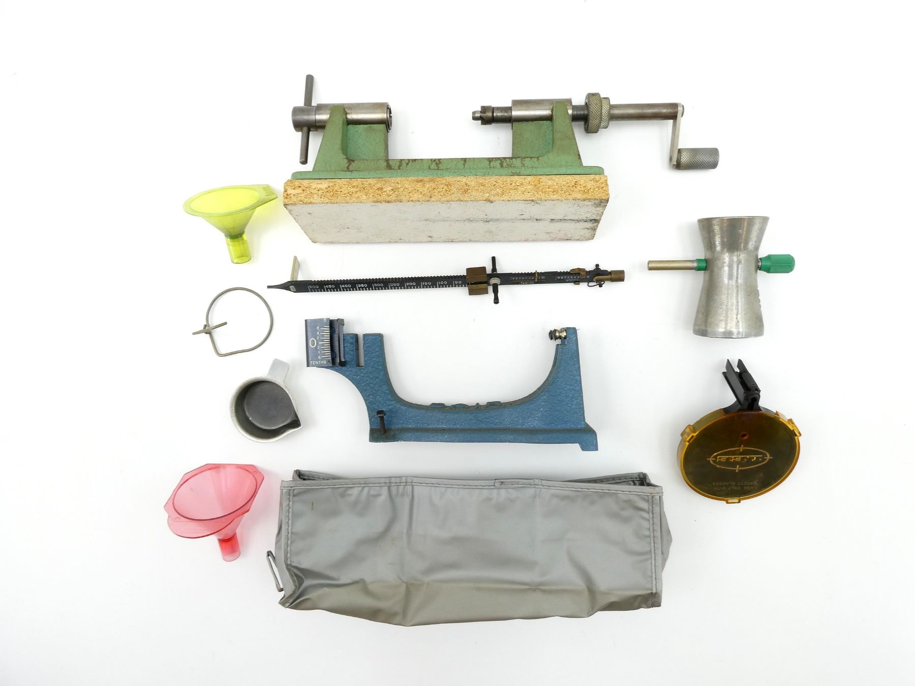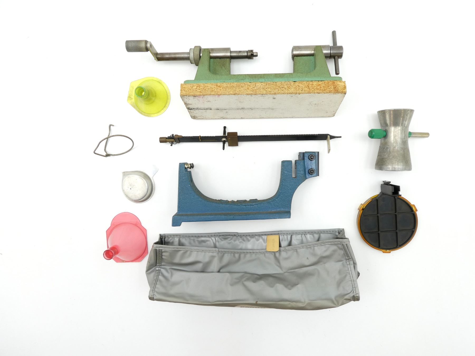 LOT INCLUDES; (1) RCBS MANUAL CASE TRIMMER WITH #30 PILOT INSTALLED, MAY REQUIRE ADJUSTMENTS AND/OR MAY NOT BE COMPLETE, UN-TESTED, (1) BAIR POWDER SCALE WITH OHAUS COVER, MAY REQUIRE ADJUSTMENTS AND/OR MAY NOT BE COMPLETE, (1) LEE PLASTIC PRIMER TRAY, (2) PLASTIC FUNNELS, RED MTM / YELLOW FLAMBEAU & (1) RCBS POWDER TRICKLER, MAY REQUIRE ADJUSTMENTS AND/OR MAY NOT BE COMPLETE. SEE PHOTOS.