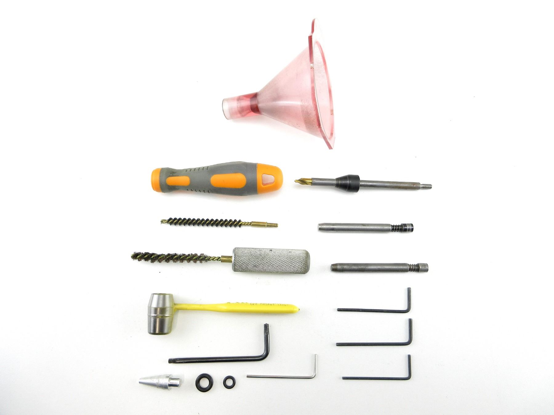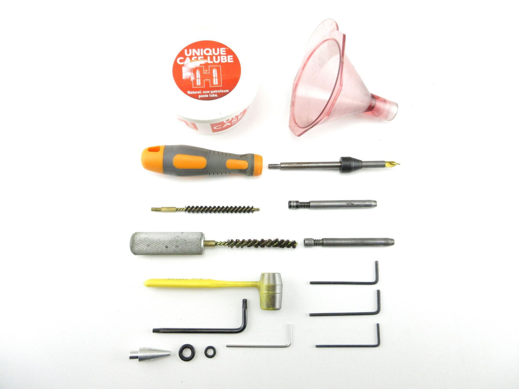 LOT INCLUDES; (1) FLASH HOLE DEBURRING TOOL WITH HANDLE, (1) 2.5CC POWDER SCOOP, (2) PRIMER RODS, (1) POWDER FUNNEL, (5) ASSORTED SIZED ALLEN KEYS, (2) WIRE BRUSHES, ONE WITH METAL HANDLE, ETC. SEE PHOTOS.