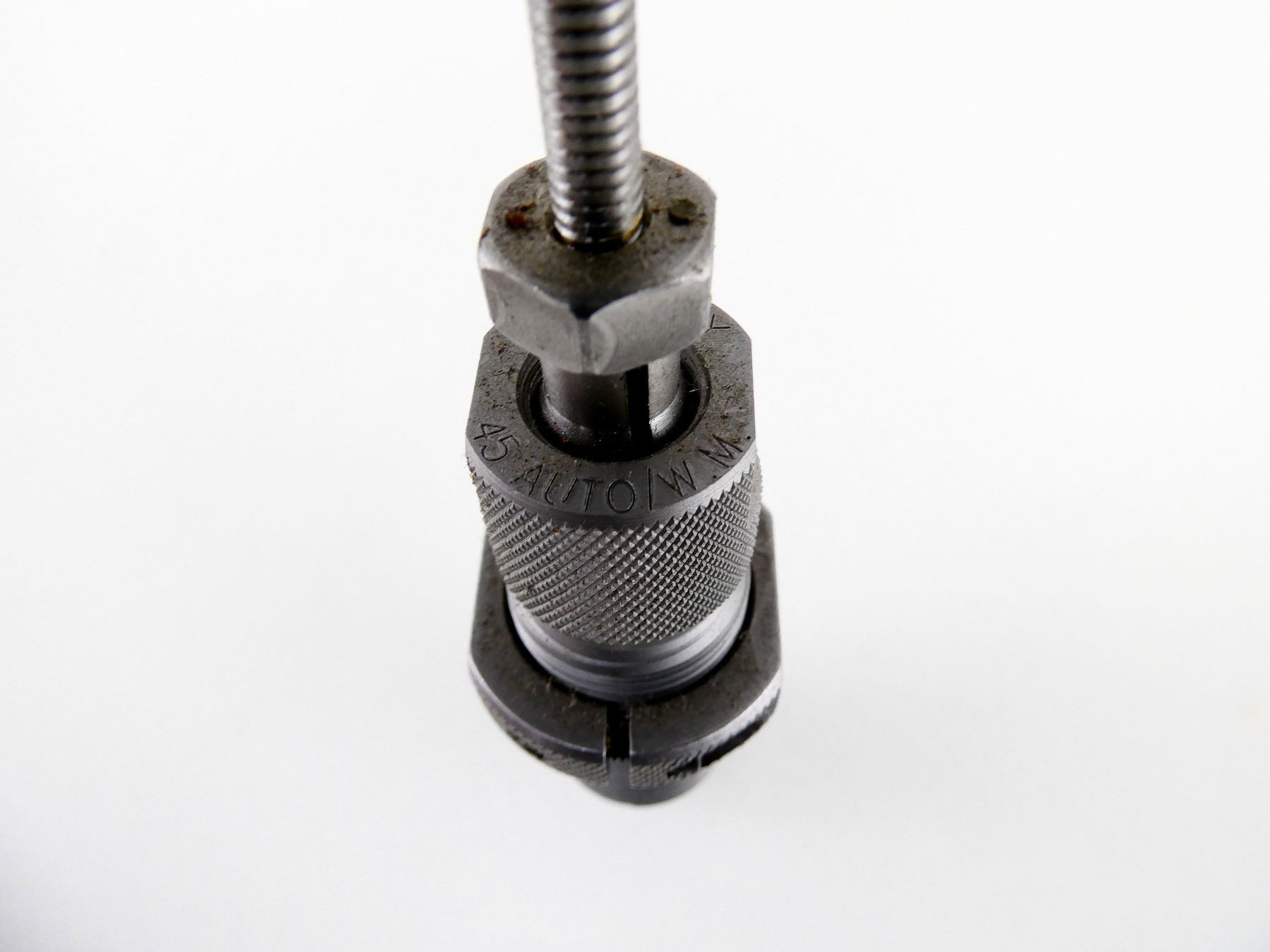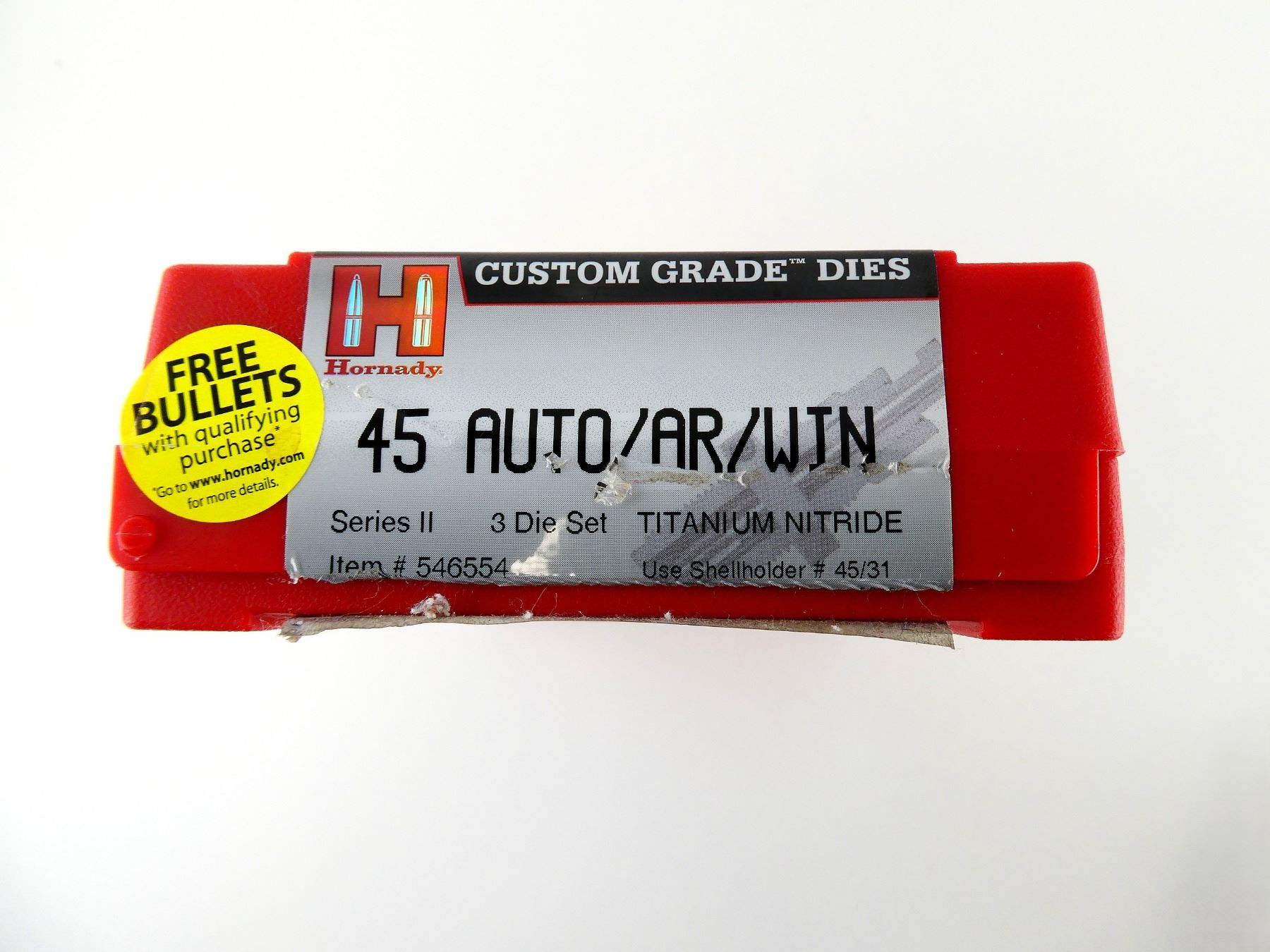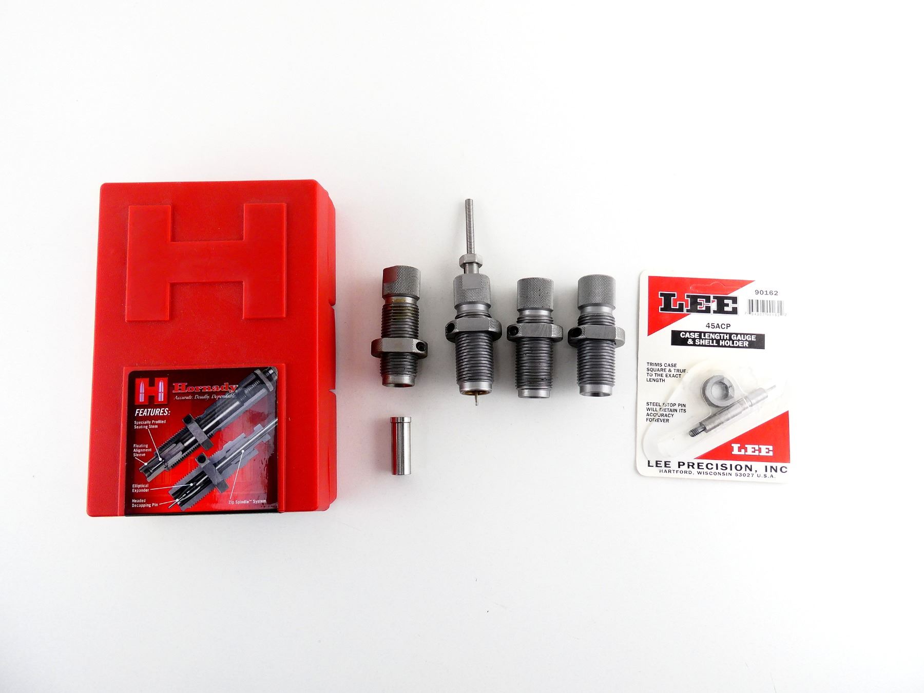 LOT INCLUDES; (1) HORNADY .45 AUTO/AR/WIN 4-PIECE RELOADING DIES, DIES MARKED: "45 CAL RIFLE", "45 CAL" & "45 AUTO / W.M. & (1) LEE .45 ACP CASE LENGTH GAUGE WITH #2 SHELL HOLDER. SEE PHOTOS.
