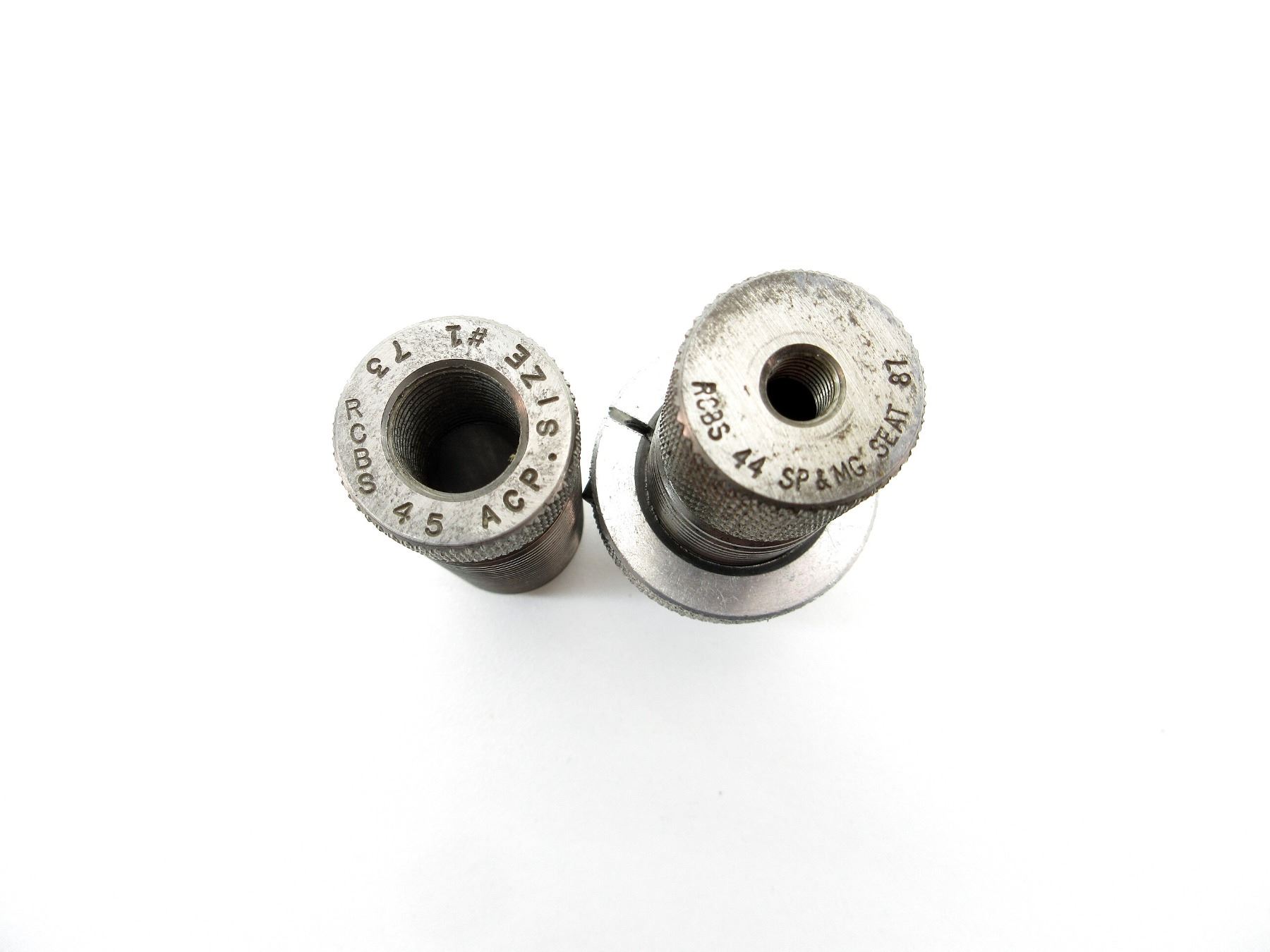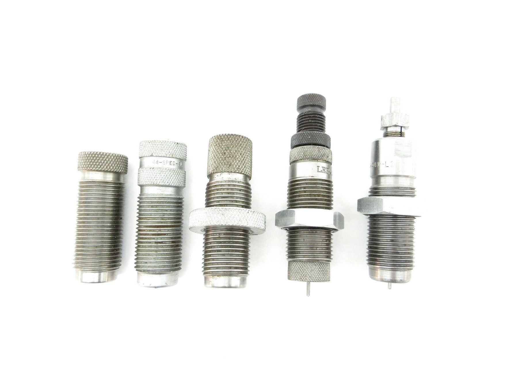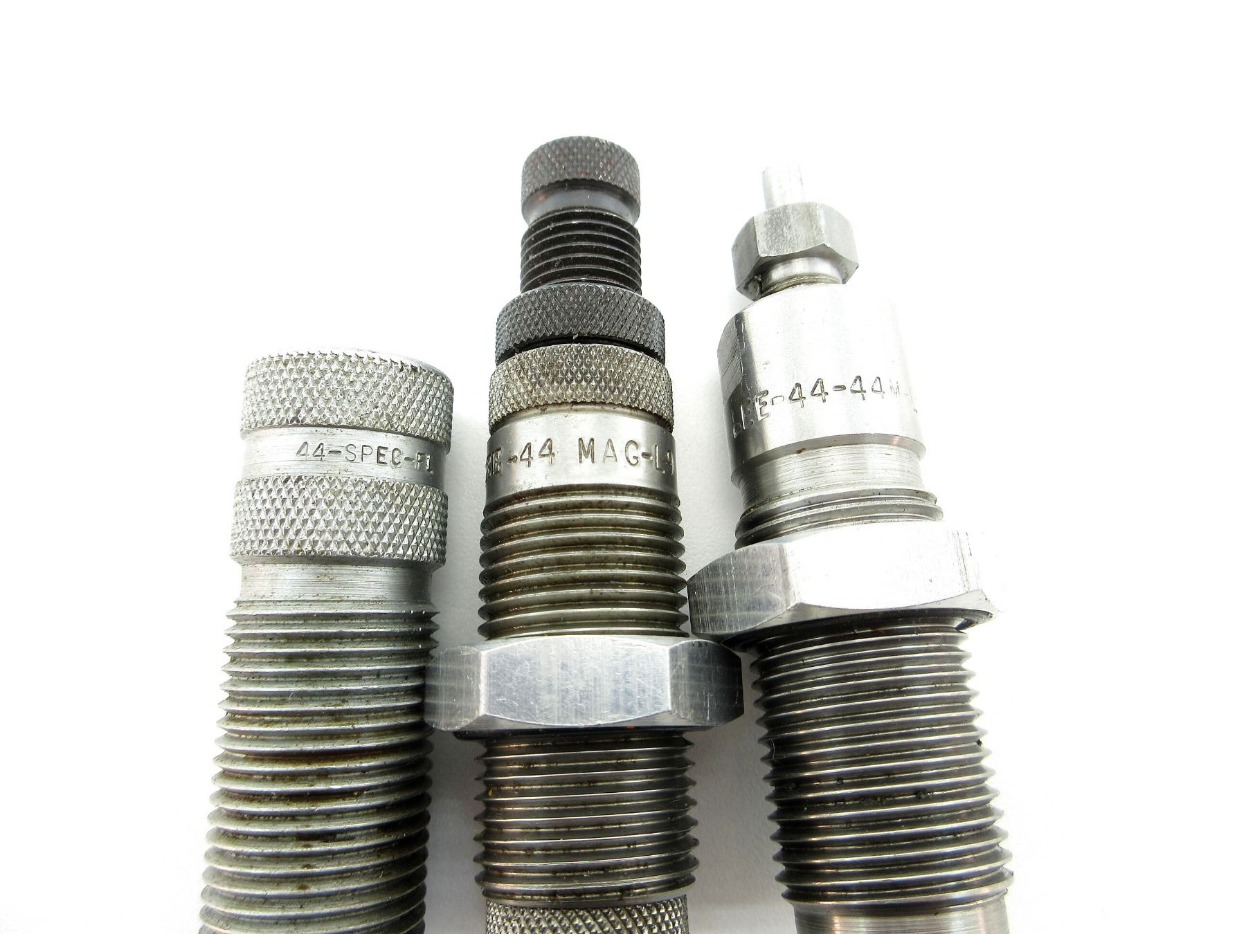LOT INCLUDES; (1) LEE .44 MAG RELOADING DIE, (1) LEE .44-44 MAG RELOADING DIE, (1) RCBS .44 SPL & MAG SEATER RELOADING DIE, (1) RCBS .45 ACP SIZER RELOADING DIE & (1) UNKNOWN .44 SPECIAL FULL LENGTH RELOADING DIE. SEE PHOTOS.