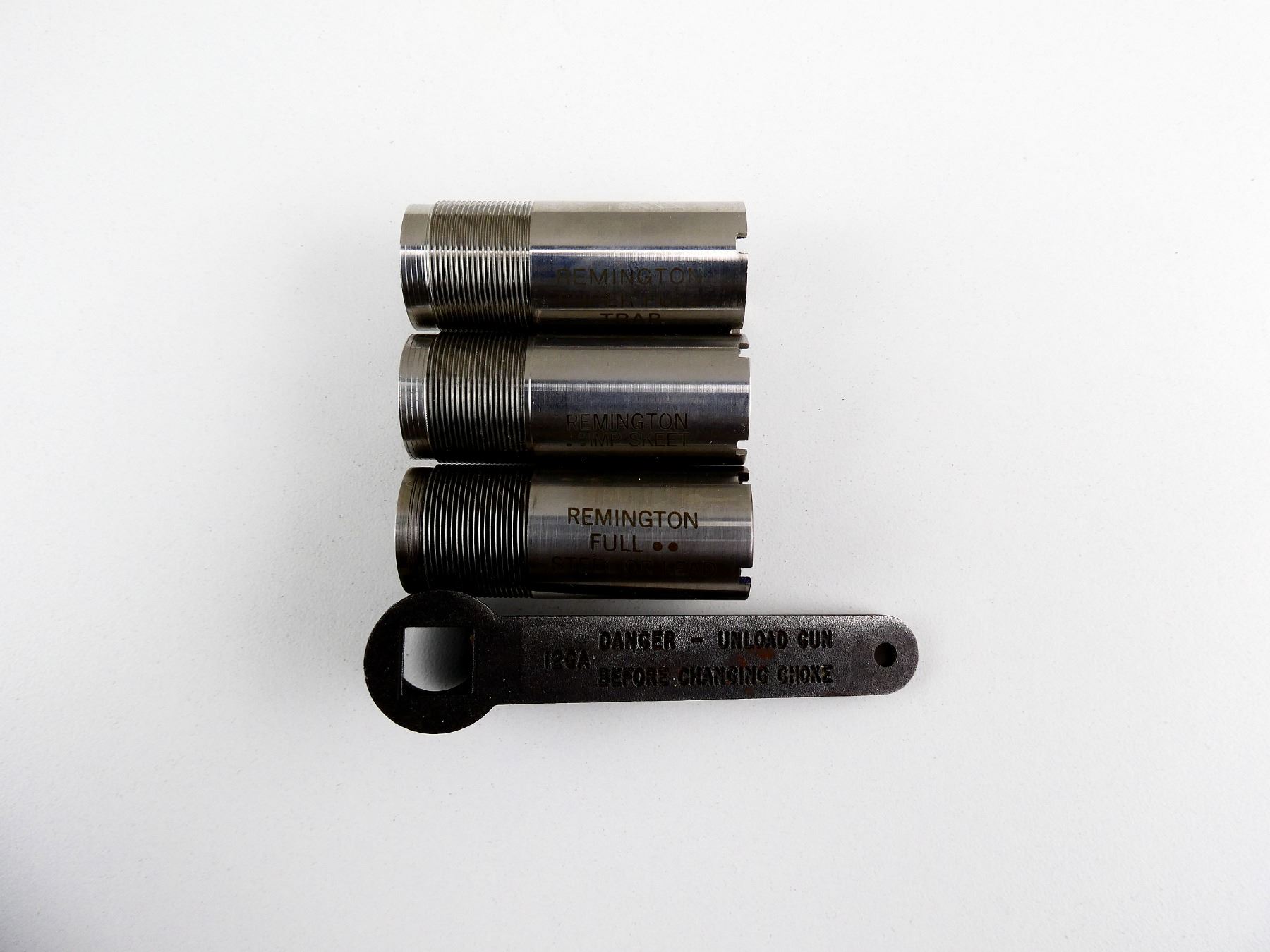 LOT INCLUDES; (1) FULL CHOKE, (1) SUPER FULL TRAP CHOKE, (1) IMP. SKEET CHOKE & (1) CHOKE WRENCH. MAY REQUIRE FITTING. SEE PHOTOS.