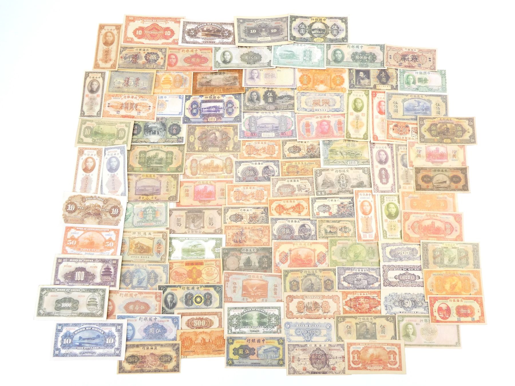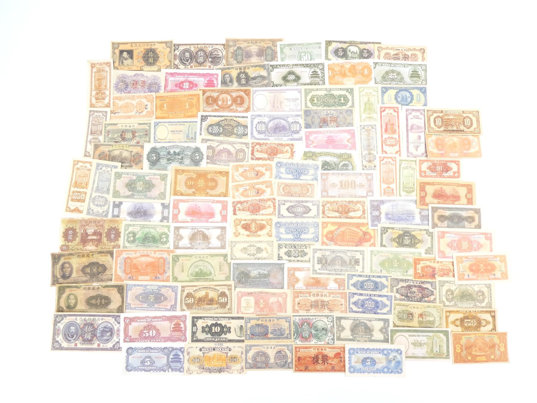 APPROX. (100) REPRODUCTION CHINESE BANK NOTES, VARIOUS MARKINGS / DATES, VARIOUS PROVINCES, VARIOUS DENOMINATIONS. SEE PHOTOS.