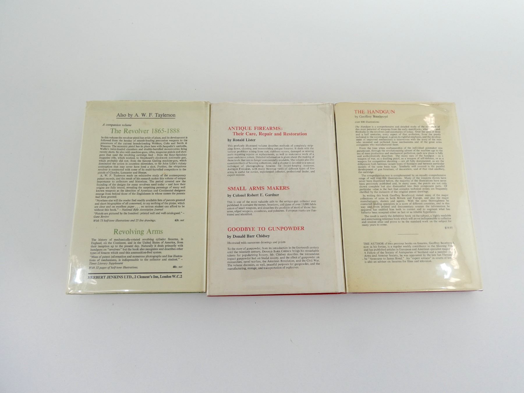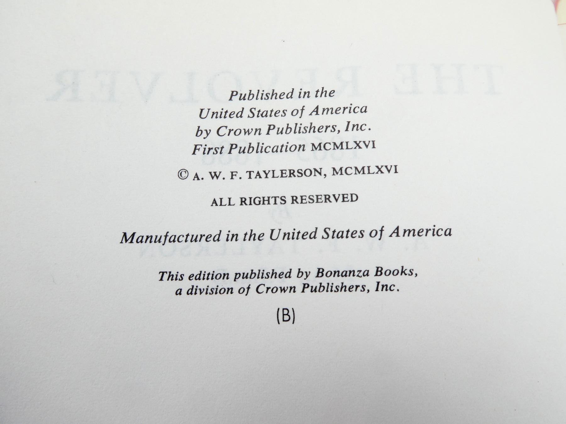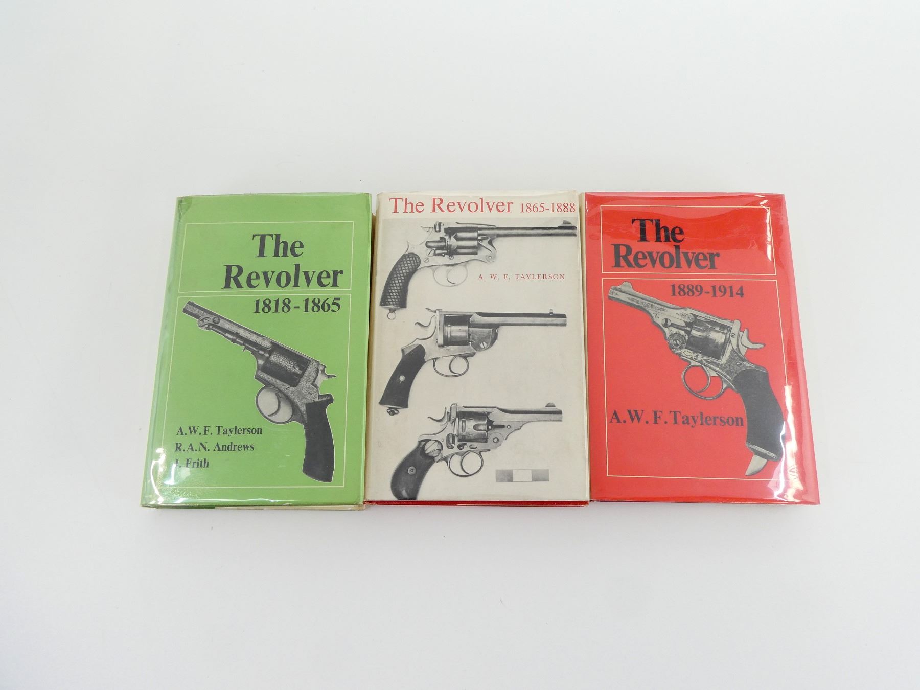 HARD COVERS WITH DUST COVERS, LOT INCLUDES; (1) "THE REVOLVER 1818-1865" BOOK BY A.W.F TAYLERSON, R.A.N. ANDREWS & J. FRITH, SBN: 257-66694-X, (1) "THE REVOLVER 1865-1888" BOOK BY A.W.F. TAYLERSON, COPYRIGHT 1966 & (1) "THE REVOLVER 1889-1914" BY A.W.F. TAYLERSON, COPYRIGHT 1971. SEE PHOTOS.