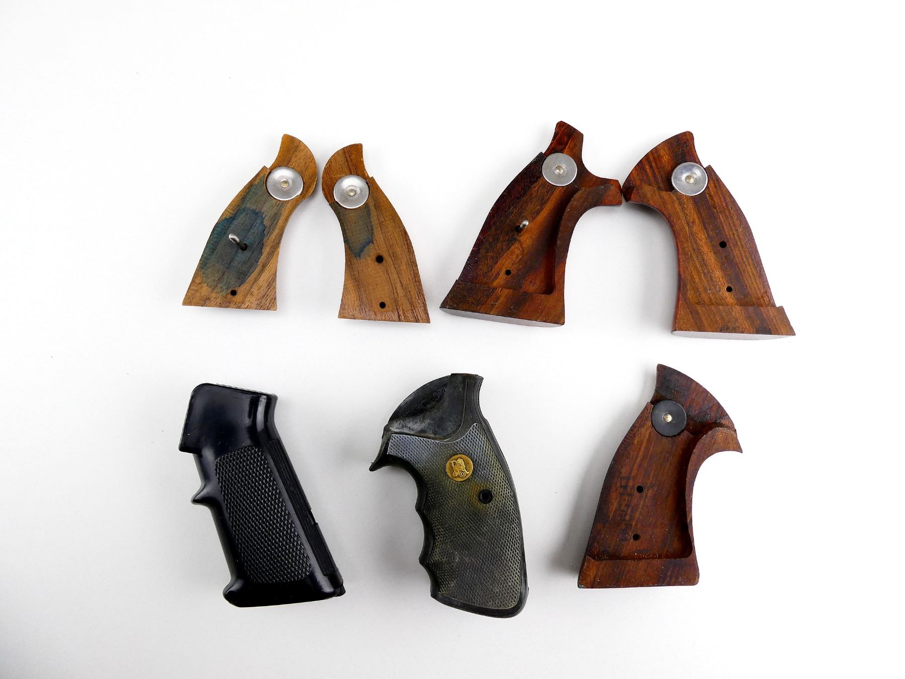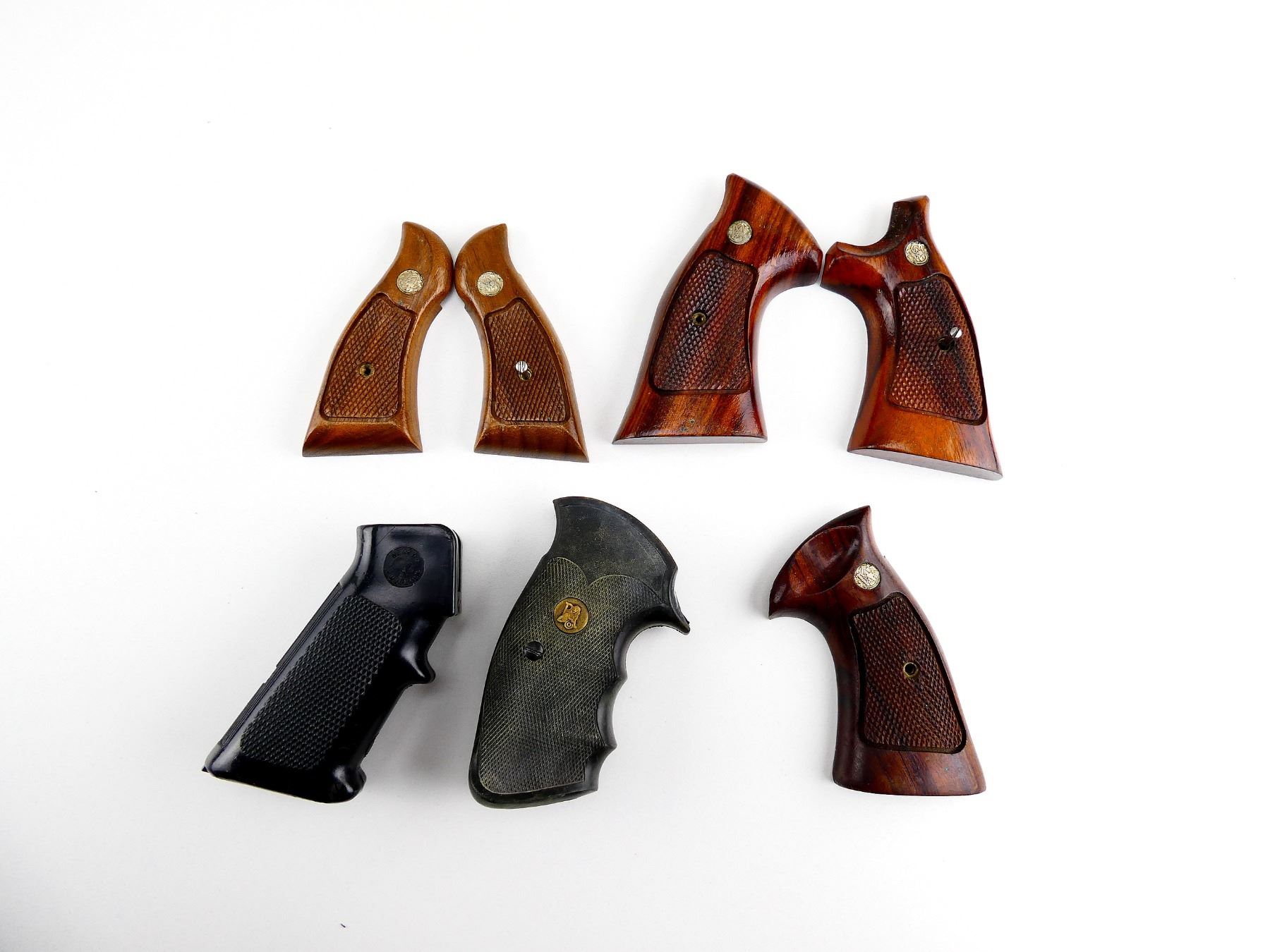 FITS VARIOUS REVOLVERS, LOT INCLUDES; (2) COMPLETE SETS OF ASSORTED SMITH & WESSON WOOD CHECKERED GRIPS, (1) LEFT-SIDE WOOD GRIP, (1) BLACK POLYMER CHECKERED GRIP & (1) BLACK RUBBER CHECKERED GRIP. MAY REQUIRE FITTING. SEE PHOTOS.