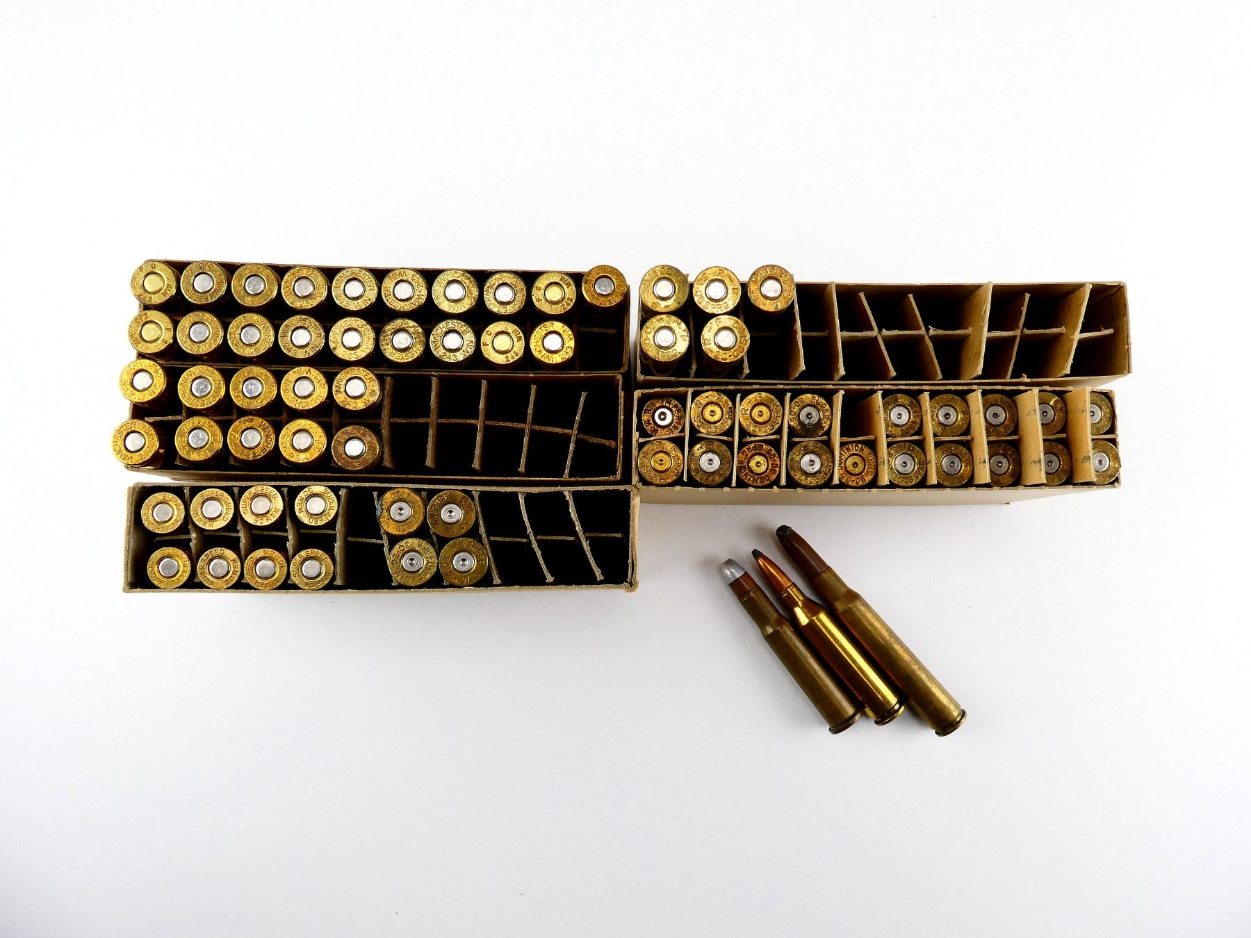 LOT INCLUDES APPROX. (45) RNDS, VARIOUS MANUFACTURERS; ASSORTED CALIBERS INCLUDING; .243 WIN, .30 REM, .30-30 WIN, .30-06 SPRG, ETC., (23) NON-PRIMED BRASS CASES.