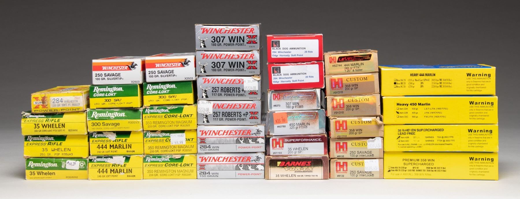 This lot consists of the following ammo: 1) 18 rds. of Buffalo Barnes 35 Whelen Supercharged Lead Free 225 gr. 2) 20 rds. (One box) of Buffalo Barnes 358 Win Supercvharged 225 gr. Lead Free. 3) 14 rds. of Buffalo Bore Heavy 450 marlin 405 gr. ammo. 4) 11 rds. of Buffalo Bore Heavy 444 Marlin 300 gr. JFN ammo. 5) 25 rds. of Black Dog 284 Win 154 gr. SP. 6) 40 rds. of Winchester 284 Win 150 gr. Power Point. 7) 40 rds. of Winchester 307 Win 180 gr. Power Point ammo. 8) 40 rds. of Winchester Super X 257 Roberts +P 117 gr. Power Point. Some of this ammo exhibits tarnishing & oxidation around bottom. 9) 20 rds. of Hornady Leverevolution 307 Win 160 gr. FTX. 10) 37 rds. of Remington 444 Marlin 240 gr. SP. 11) 20 rds. of Hornady Leverevolution 444 Marlin 265 gr. FTX. 12) 11 rds. of Barnex Vortex 35 Whelen 180 gr. TSX.. 13) 40 rds. of Winchester 250 Savage 100 gr. Silver Tip. 14) 36 rds. of Hornady 250 Savage 100 gr. Interlock. 15) About 42 rds. of varied Remington 35 Whelen ammo. Some of this ammo exhibits tarnish oxidation. 16) About 54 rds. of Hornady 358 Win. 200 gr. SP. 17) 20 rds. of Hornady 35 Whelen 200 gr. SP. 18) About 47 rds. of varied Remington 300 Savage. 19) 20 rds. of vintage Super-X 284 Win 150 gr. SP. Box shows notable age wear & ammo shows moderate tarnishing. 20) About 31 rds. of Remington 350 Rem Mag 200 gr. Core-Lokt. CONDITION: ammo is generally very good or better unless noted previously in description. (02-24835-2/MJC). AMMO. $300-500 for lot.