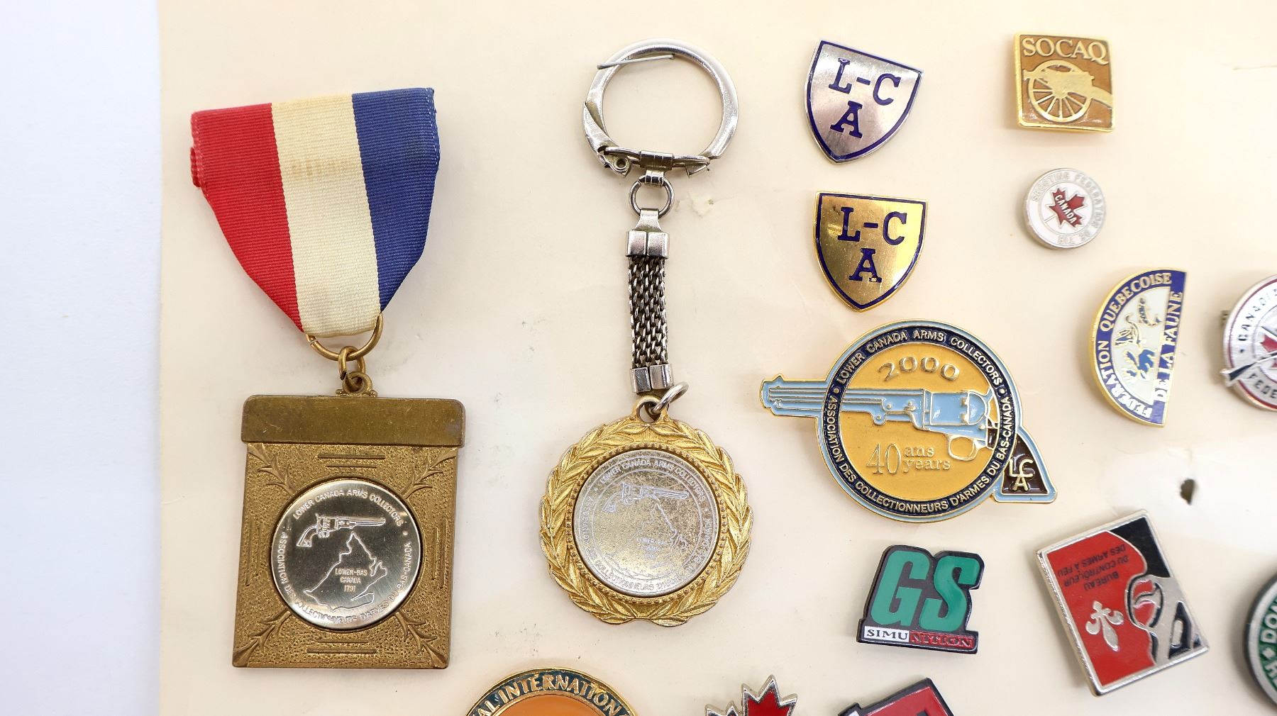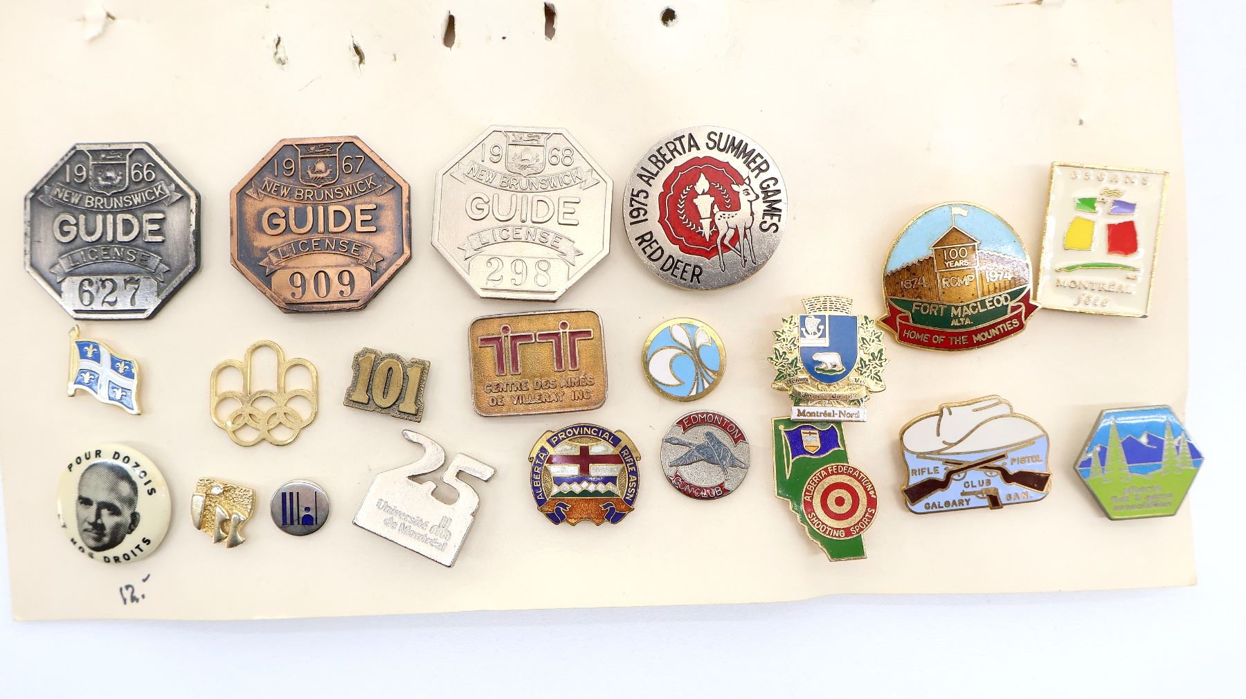 LOT INCLUDES; APPROX. (83) ASSORTED RIFLE CLUB / ASSOCIATION PINS, SOME INCLUDE; DOMINION MARKSMEN, NATIONAL INDOOR LEAGUE 1955-1957, C-I-L SPORTING RIFLE, PQRA (PROVINCE OF QUEBEC RIFLE ASSOCIATION) 125 YEARS, 1975 ALBERTA SUMMER GAMES RED DEER, NRA FREEDOM, LOWER CANADA ARMS COLLECTORS 2000 40 YEARS, ETC. SEE PHOTOS.
