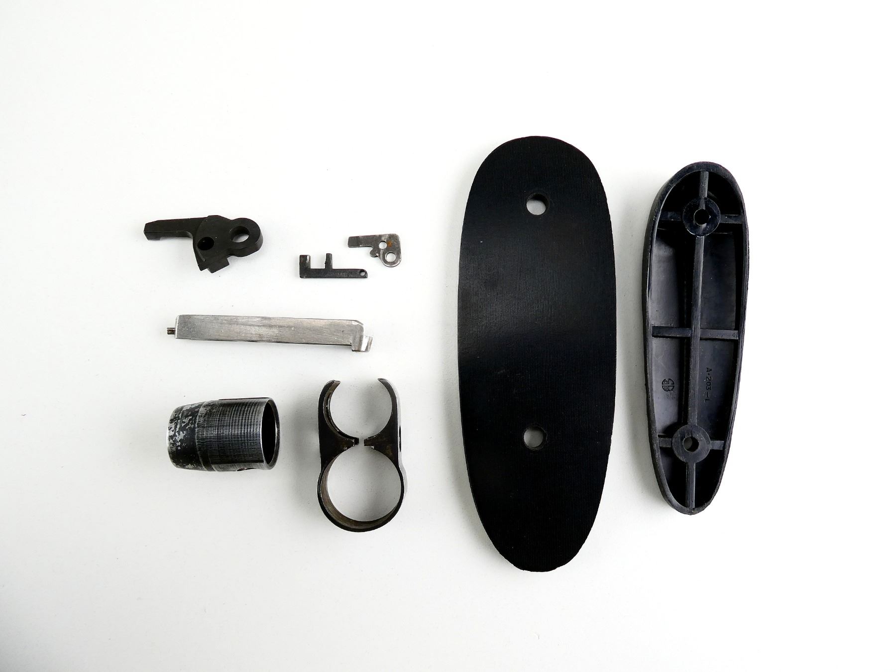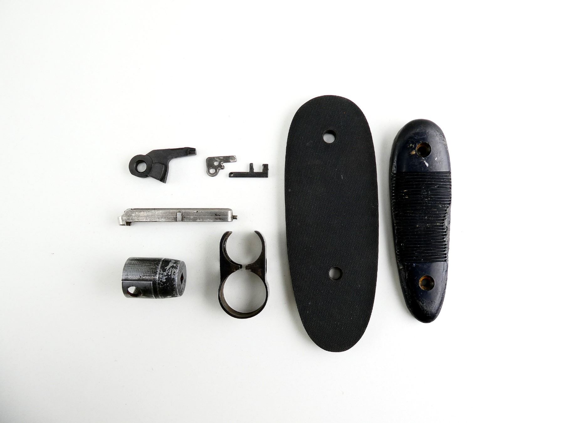 LOT INCLUDES; BLACK POLYMER BUTT PLATE, BUTT PLATE SPACER, WINCHESTER MODEL 12 BARREL BAND, SAVAGE 99 EJECTOR, RUGER NO.1 STANDARD EJECTOR, ETC. MAY REQUIRE FITTING. SEE PHOTOS.