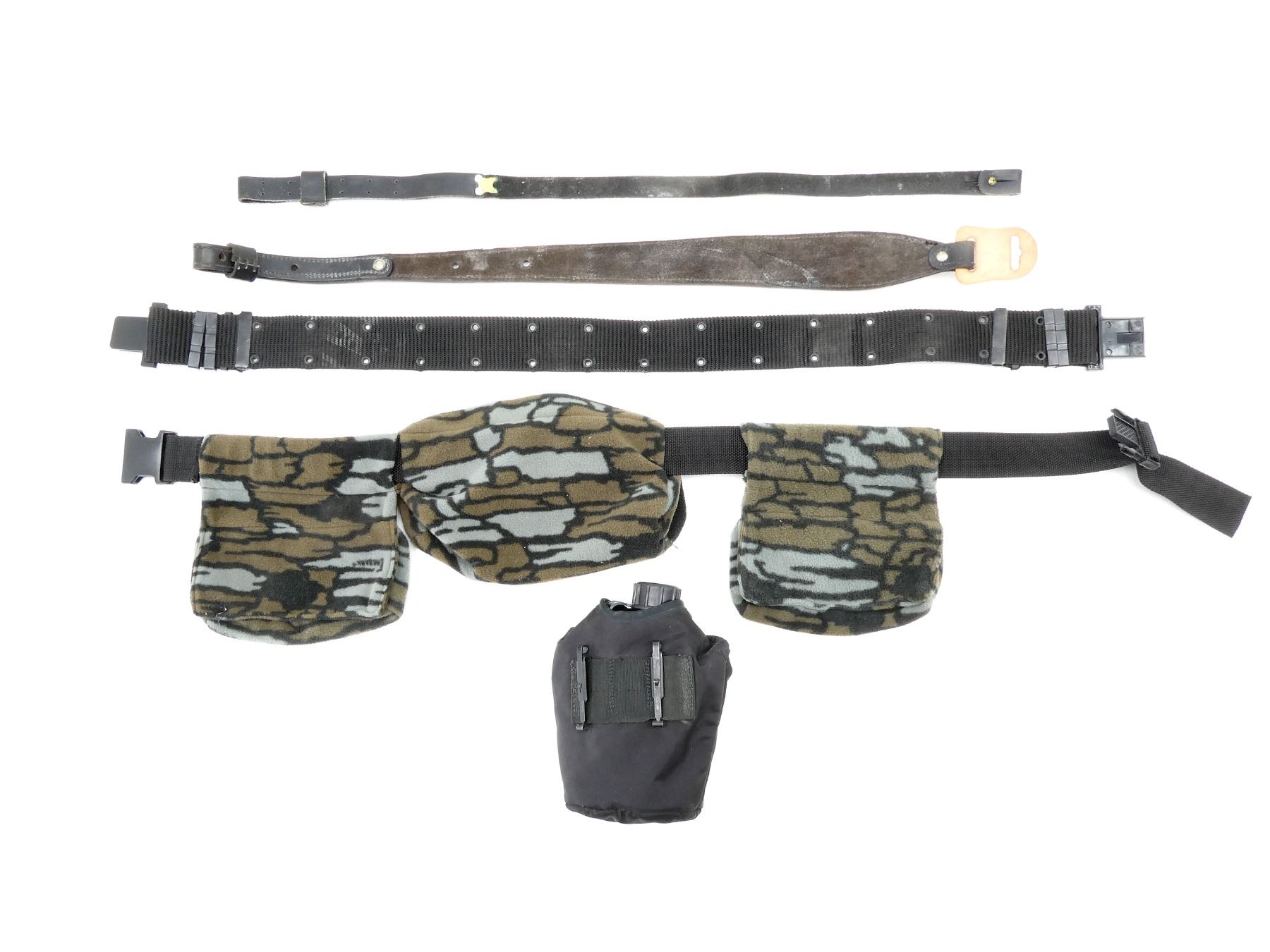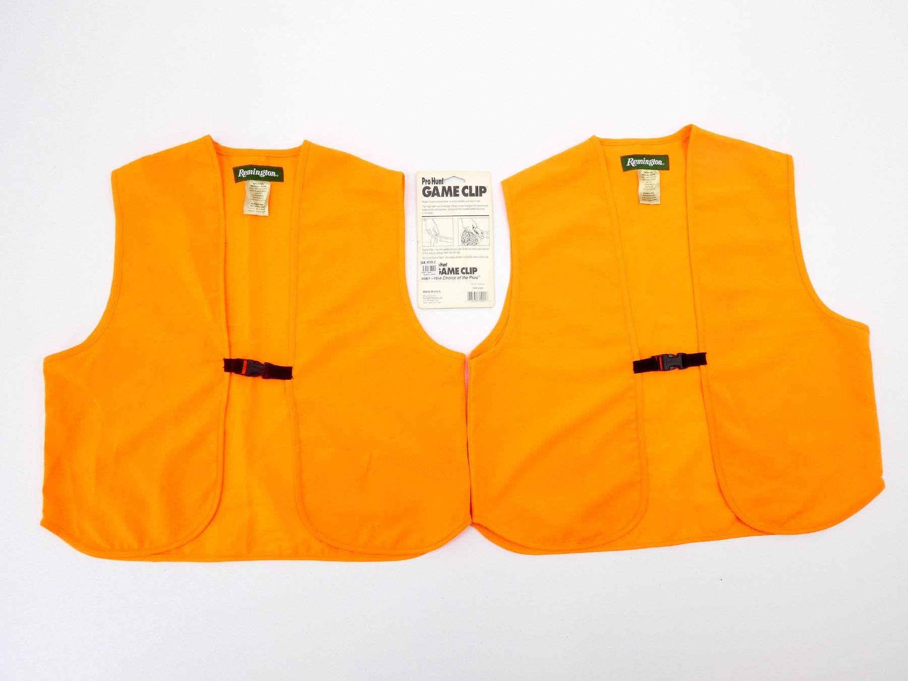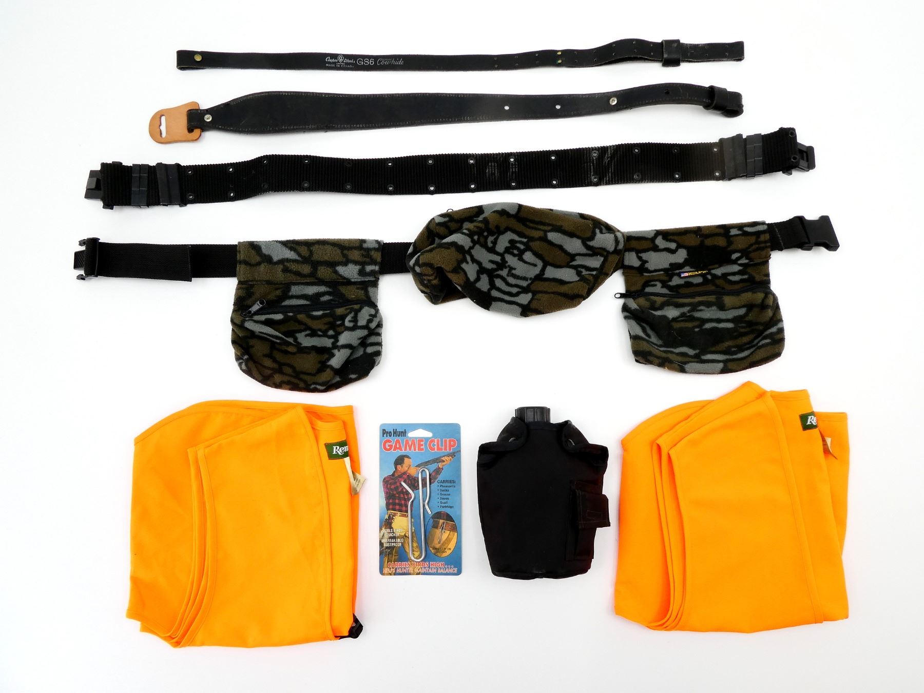 LOT INCLUDES; (2) RIFLE / SHOTGUN SLINGS, (1) BLACK NYLON BELT, (1) BROWN LEATHER BELT, (1) KOLPIN POUCH BELT, (1) POLYMER CANTEEN WITH HOLDER, (2) REMINGTON SAFETY VESTS, MEN'S MEDIUM/LARGE & (1) PRO HUNT GAME CLIP, NOS, IN ORIGINAL PACKAGING. SEE PHOTOS.
